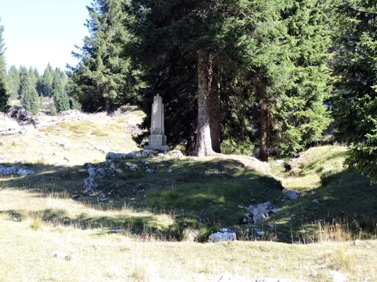 Tenendo il monumento sulla destra si prosegue per un centinaio di metri. Si intravede una specie di bivio, dritti si scende in uno spiazzo senza alberi ma si prosegue a destra salendo leggermente.