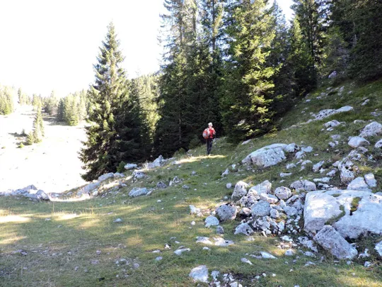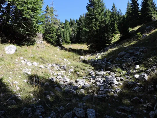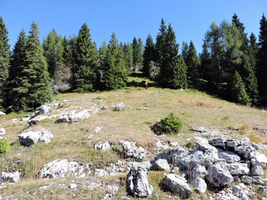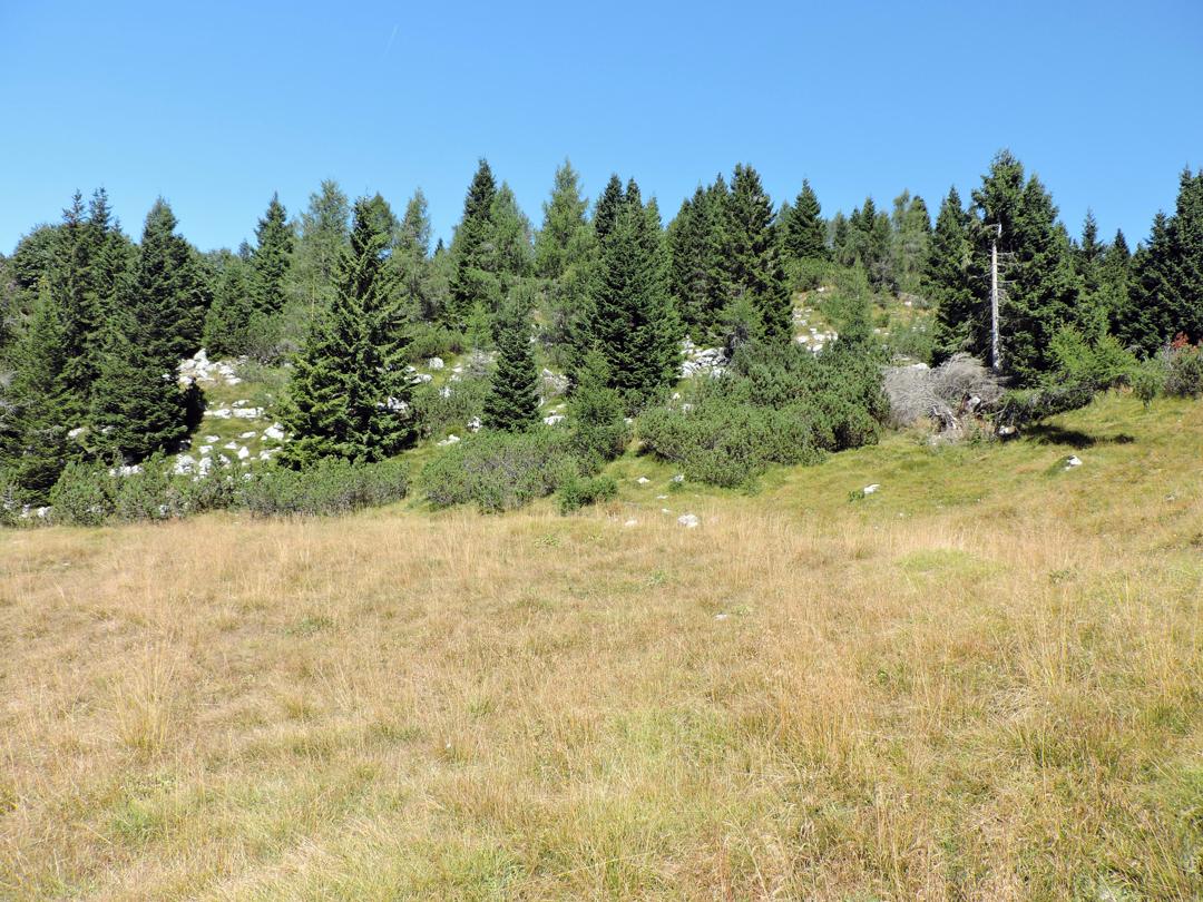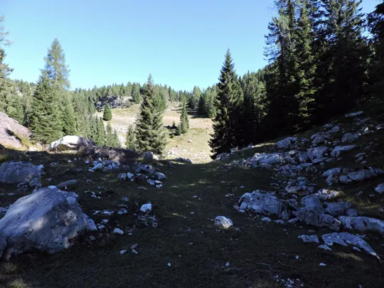 Alla fine della zona rocciosa proseguiamo tra gli alberi e arriviamo in una zona pianeggiante e spoglia.