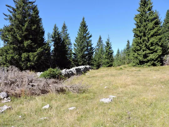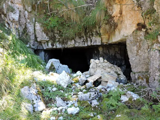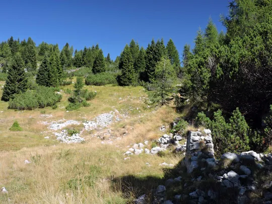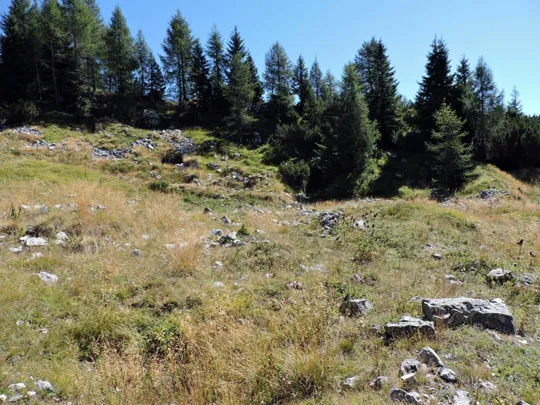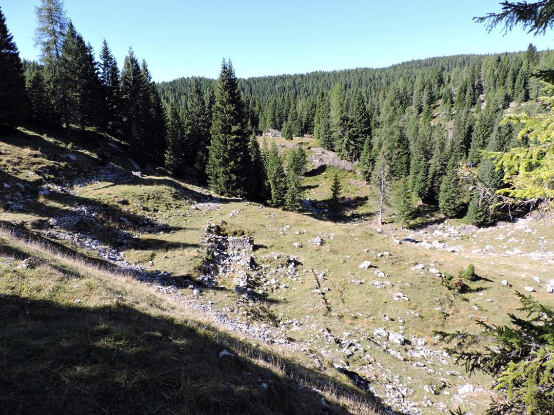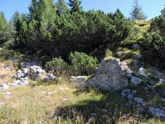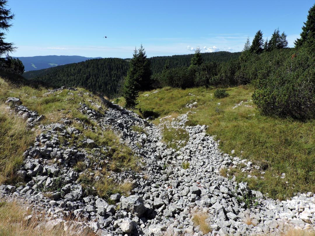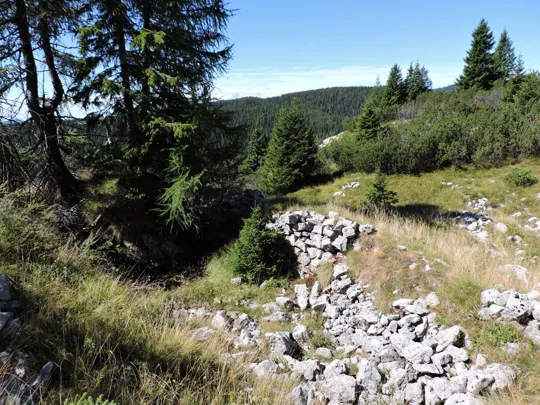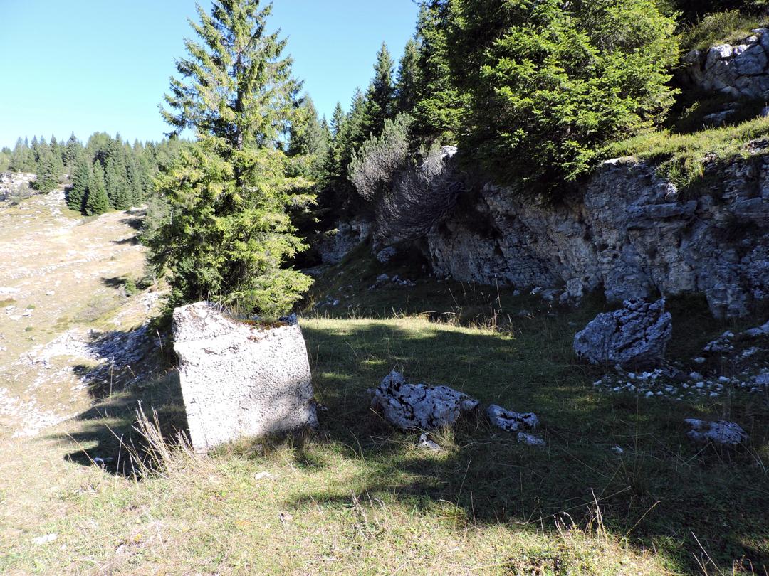 Superiamo la trincea in direzione nord-est, dove ci sono meno alberi. Camminiamo lungo una specie di conca dove quasi al termine della stessa, si presentano altri resti di baraccamenti e grotte.