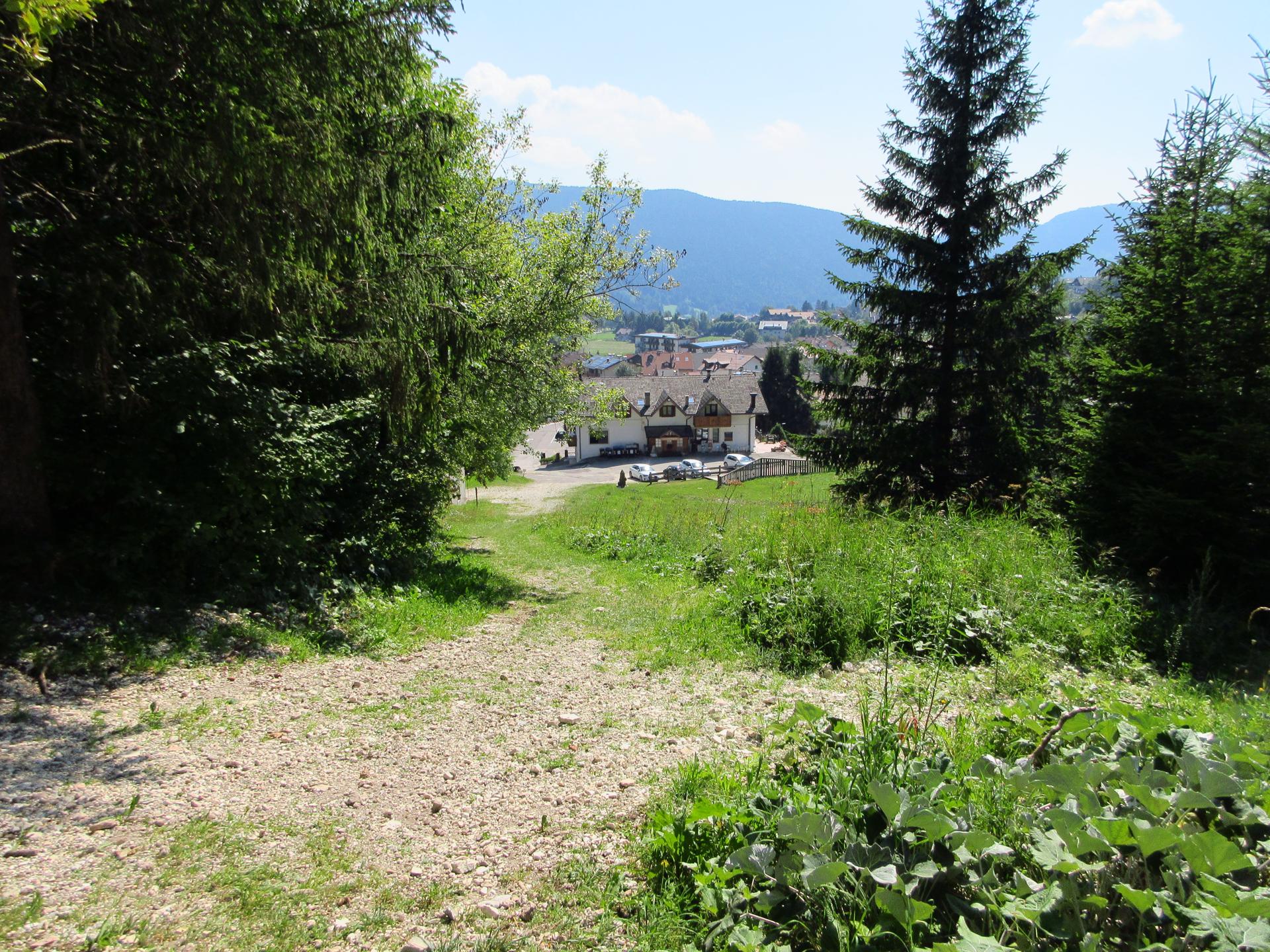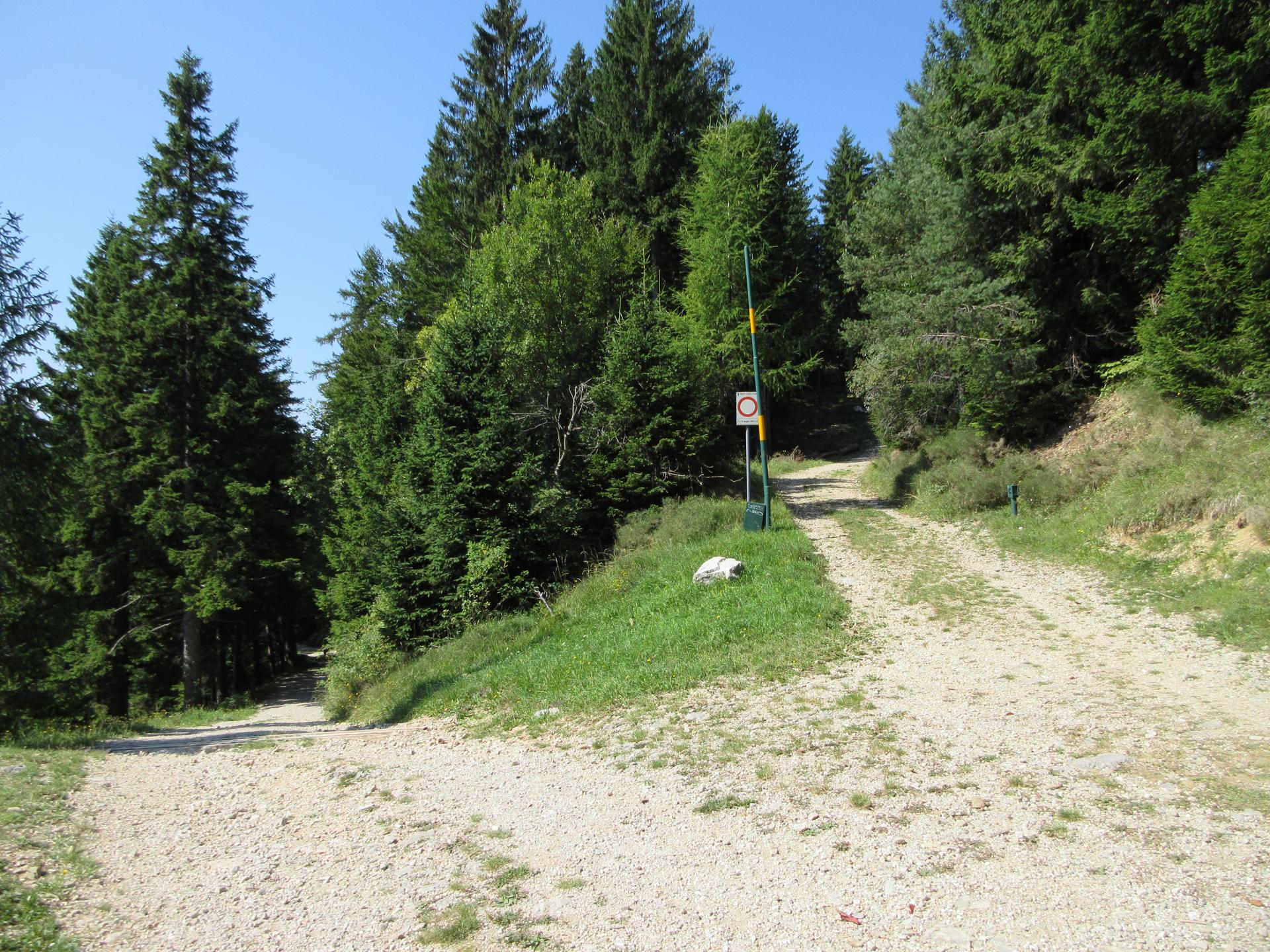 Usciti dal bosco ancora su prato fino ad un altro incrocio. Qui, seguendo la segnaletica, si va a sinistra e poi subito a destra proseguendo su una strada forestale o meglio "strada di arroccamento" come indicato sotto al cartello di divieto di circolazione.