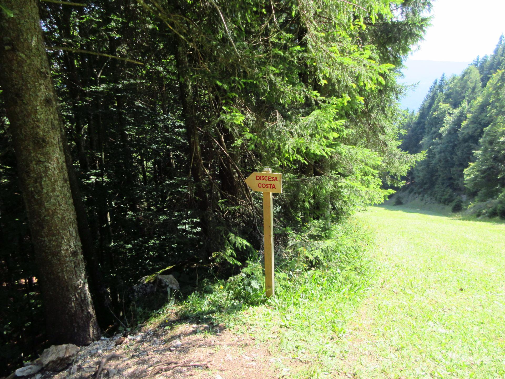Tornati indietro siamo scesi lungo il prato per poi trovare una tabella "Discesa Costa" che ci fa rientrare nel bosco.