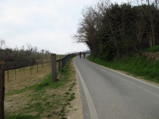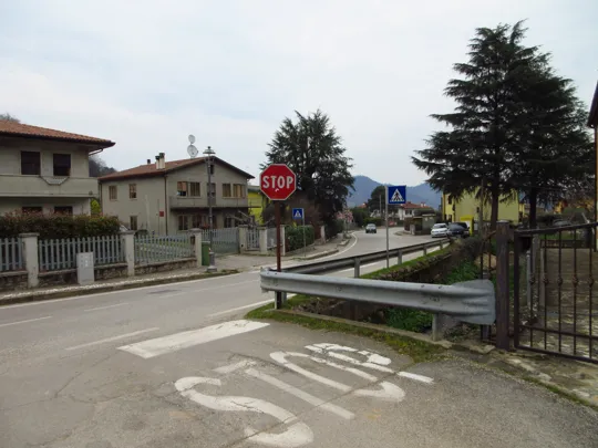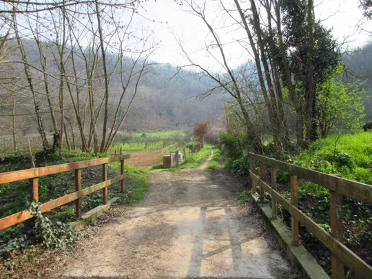 Si attraversa la strada, si passa un ponte e si prosegue su una stradina che porta verso una zona coltivata.