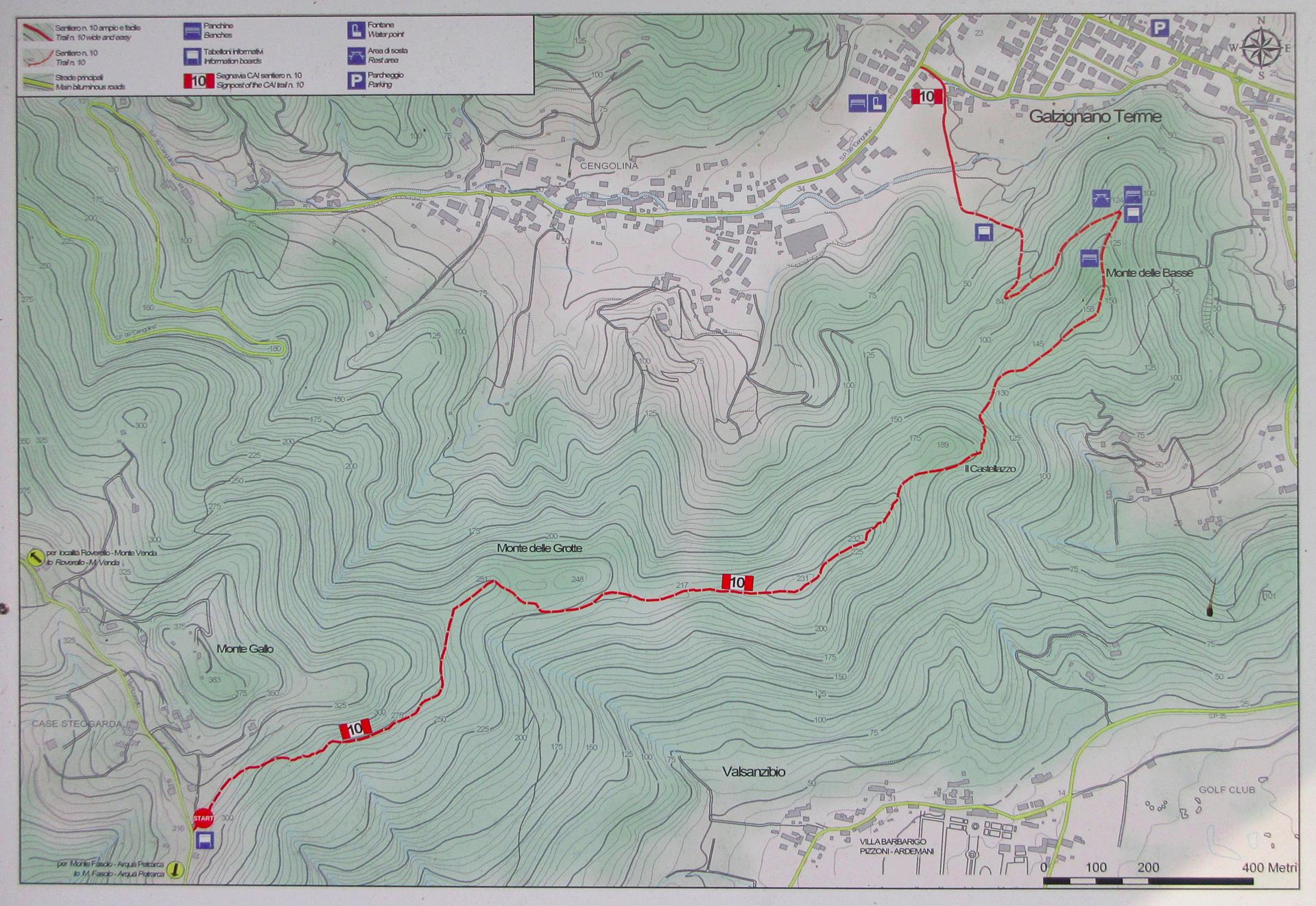Questo percorso attraversa diversi colli da Galzignano a Cinto Euganeo. Il sentiero nr.10 non è un percorso ad anello, ma lo può diventare seguendo il nostro itinerario. La partenza del sentiero ufficialmente è da via Roverello, ma noi abbiamo preferito partire da Galzignano Terme.
