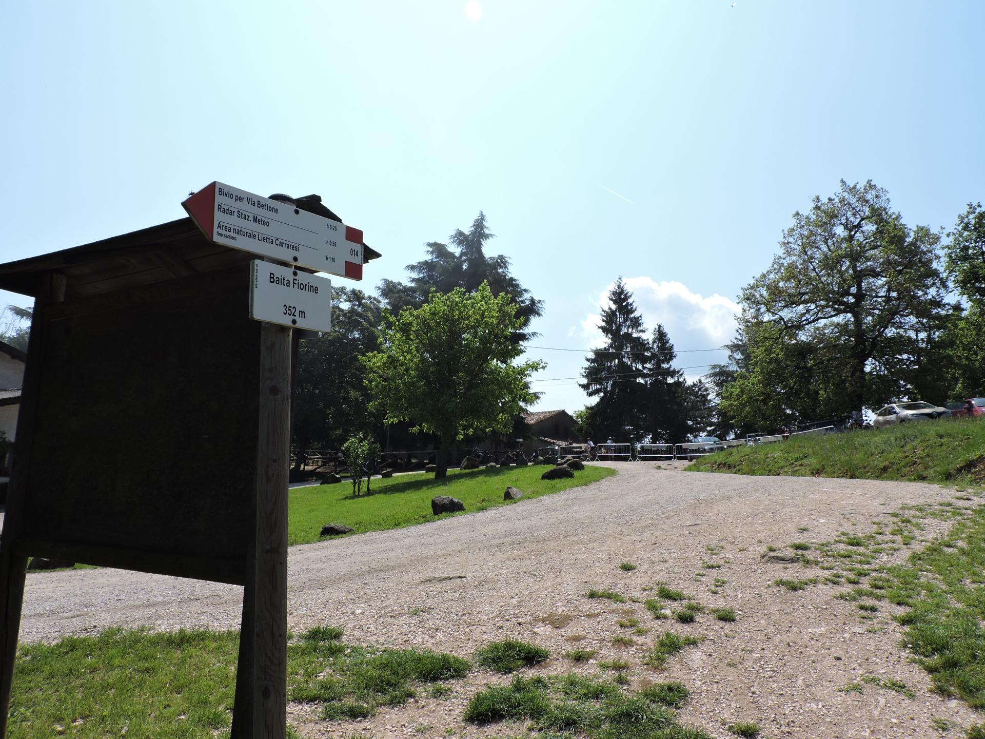 Dal parcheggio si rimane sulla strada verso nord-ovest in direzione della Baita Passo Fiorine. Dopo un centinaio di metri inizia sulla destra una strada che porta verso il radar meteorologico.