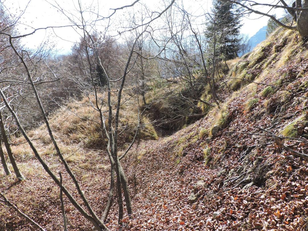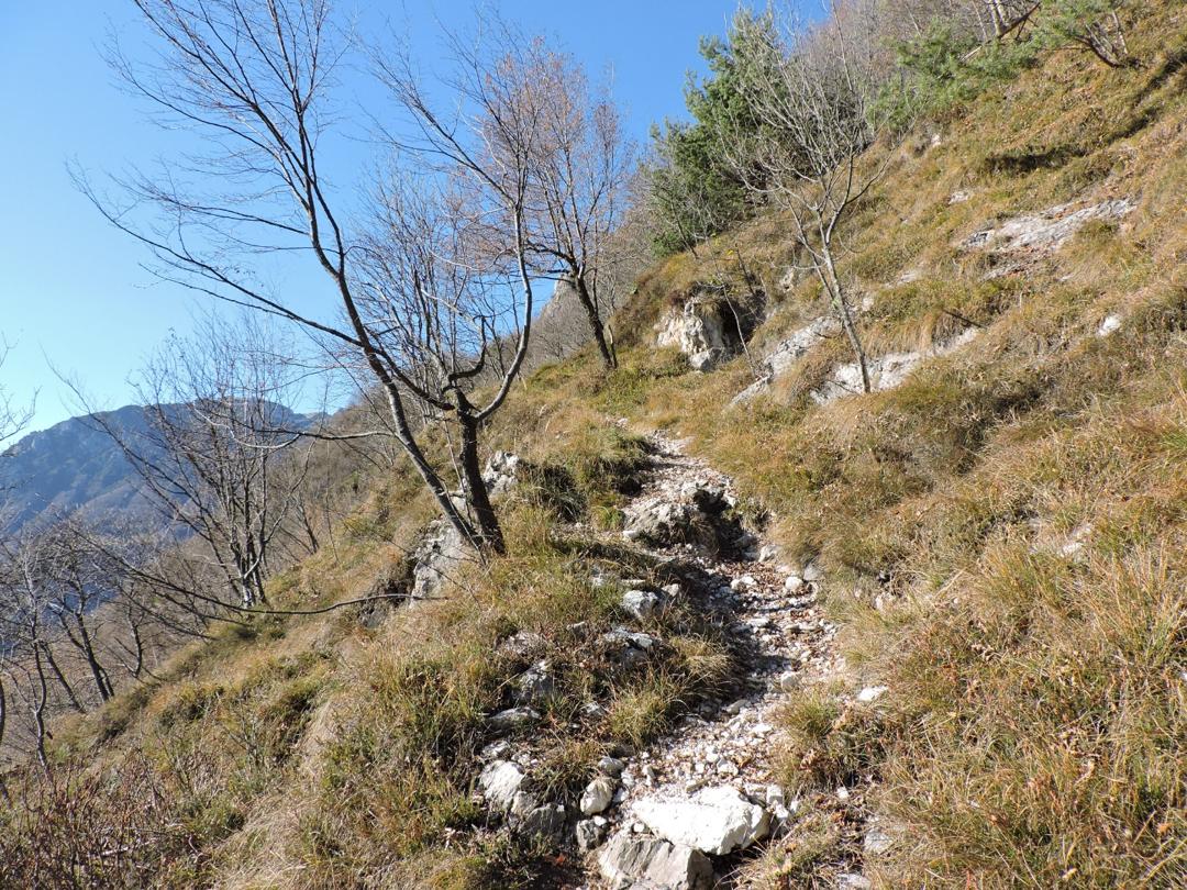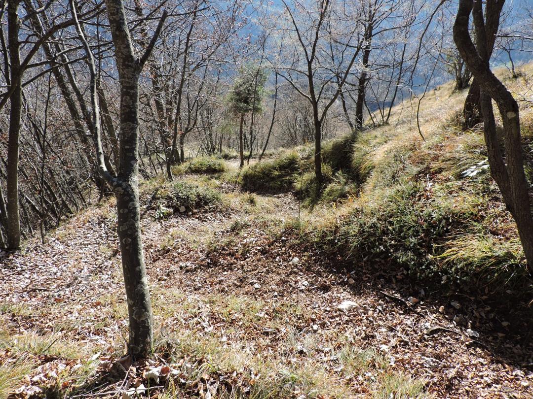 La salita inizia con una lunghissima serie di tornanti, e spesso, delle piccole grotte. Le foglie del periodo autunnale nascondono, a volte, parte del sentiero rendendolo un tutt'uno con il bosco. I segni del sentiero sono sempre evidenti, basta solo un po' di attenzione.