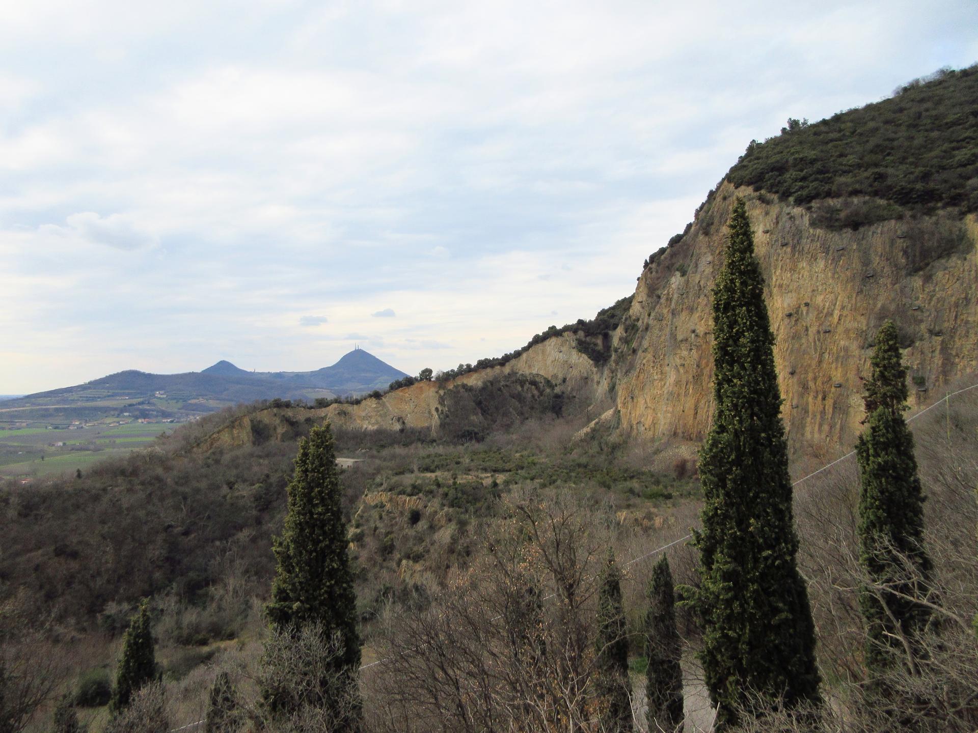 La strada costantemente in salita e con pendenze a volte impegnative ci regala nei tornanti degli scorci su una cava e su Monselice.