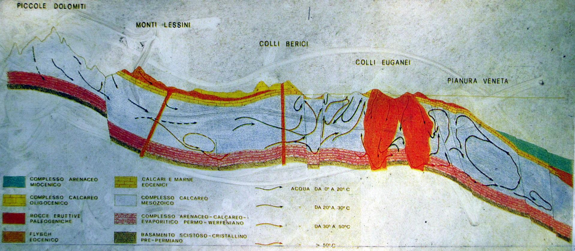 I Colli Euganei sono conosciuti nel mondo per le rinomate terme di Abano, Montegrotto, Battaglia, Galzignano e Teolo. Il fenomeno non è legato alla presenza di magma fuso nel sottosuolo, ormai completamente trasformato in solida roccia, ma dipende da un circuito sotterraneo che porta acqua meteorica dall'area, posta a nord ovest, delle Piccole Dolomiti - zona del Monte Pasubio- fino al sottosuolo del gruppo euganeo. Durante il lungo percorso, calcolato in base a studi approfonditi in 25 anni, l'acqua acquista calore per gradiente geotermico, sali minerali e le proprietà che la rendono utilizzabile come termale alla sua fuoriuscita; quest'ultima è facilitata dal particolare assetto delle rocce vulcaniche, fessurate e impermeabili, che le consentono di mantenere inalterate le sue proprietà. Il gradiente geotermico responsabile del riscaldamento dell'acqua è semplicemente l'aumento di temperatura delle rocce formanti il sottosuolo con la profondità; alle nostre latitudini corrisponde circa a un incremento di 3°C ogni 100 metri. L'acqua termale, conosciuta fin da tempi molto antichi, fuoriesce nell'area euganea a temperature tra gli 87° (pozzi profondi) e i 40° circa (sorgenti termali periferiche alla collina e sorgenti di acqua fredda interne al gruppo collinare). Il fenomeno del termalismo si manifesta prevalentemente nell'area nord orientale del territorio euganeo, dove svilupparono i più importanti stabilimenti termali; sorgenti di primaria importanza sono quelle che alimentano il Lago della Costa, tra Monselice e Arquà Petrarca e il vicino laghetto di Lispida, altre sparse sono presenti nella pianura alla prima periferia del complesso collinare tra cui le storiche terme di Val Calaona. I Veneti Antichi conoscevano già la risorsa termale, come testimoniano i numerosi reperti archeologici conservati a Este presso il Museo Nazionale Atestino. In epoca romana attorno alle sorgenti naturali, allora vi erano numerosi laghetti, furono costruite le prime vasche per immersioni a scopo terapeutico in acqua o fango termale. A partire dal I sec. d.C., ritrovamenti archeologici attestano sul colle Montirone la presenza di un tempio dedicato al dio Apono e, nei pressi, un emporium di vasellame destinato a rifornire i visitatori che molto probabilmente utilizzavano il recipiente per bere l'acqua terapeutica. Durante il Medioevo e nei secoli successivi continuò, pressoché ininterrotto, l'utilizzo della risorsa termale. Ai giorni nostri l'acqua viene recuperata per via artificiale, essendosi abbassato notevolmente il suo livello nel sottosuolo, e i fanghi (commistione di argilla, acqua salso-bromo-iodica, microrganismi e biomateriali) ricavati dal Lago della Costa vengono posti in apposite cisterne per i processi che portano alla loro maturazione e al loro utilizzo negli stabilimenti. Esistono circa 170 alberghi termali, ognuno completo di piscina, reparto cure e un complesso sistema di beni e servizi che rendono il prodotto turistico di prima scelta e collocano le Terme Euganee tra le più rinomate a livello europeo e mondiale.Il Parco Regionale dei Colli Euganei è promotore e coordinatore del Progetto EMAS che prevede l'implementazione di un Sistema di Gestione Ambientale, secondo i requisiti del Regolamento Comunitario 761/2001, esteso ai 5 Comuni del bacino termale euganeo (Abano Terme, Battaglia Terme, Galzignano Terme, Montegrotto Terme, Teolo) e finalizzato all'individuazione, valutazione e gestione degli impatti e al miglioramento ambientale a livello territoriale.