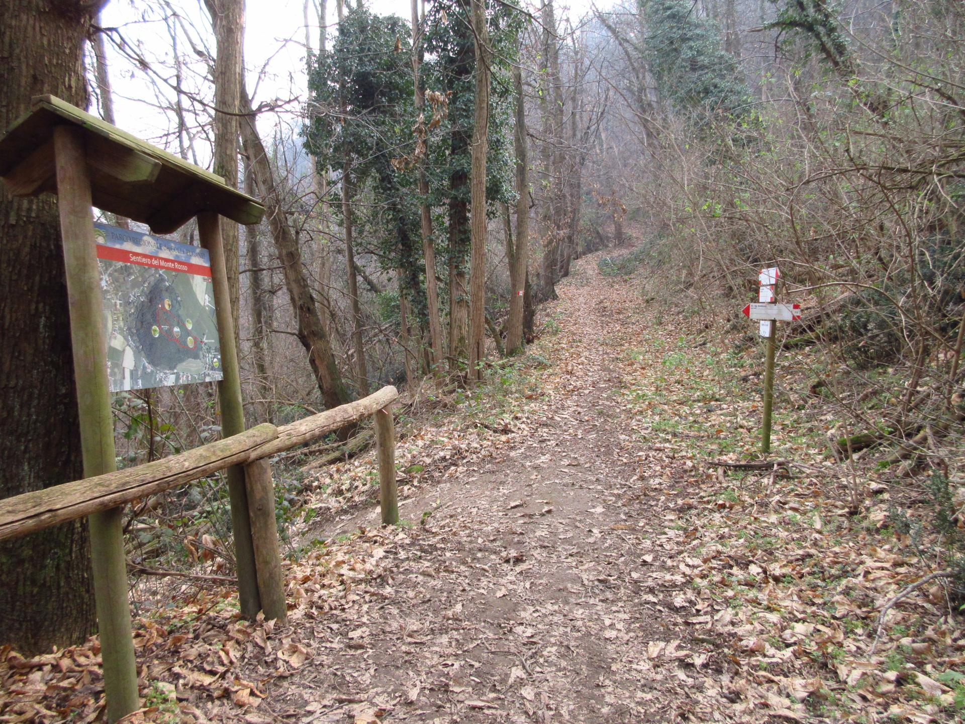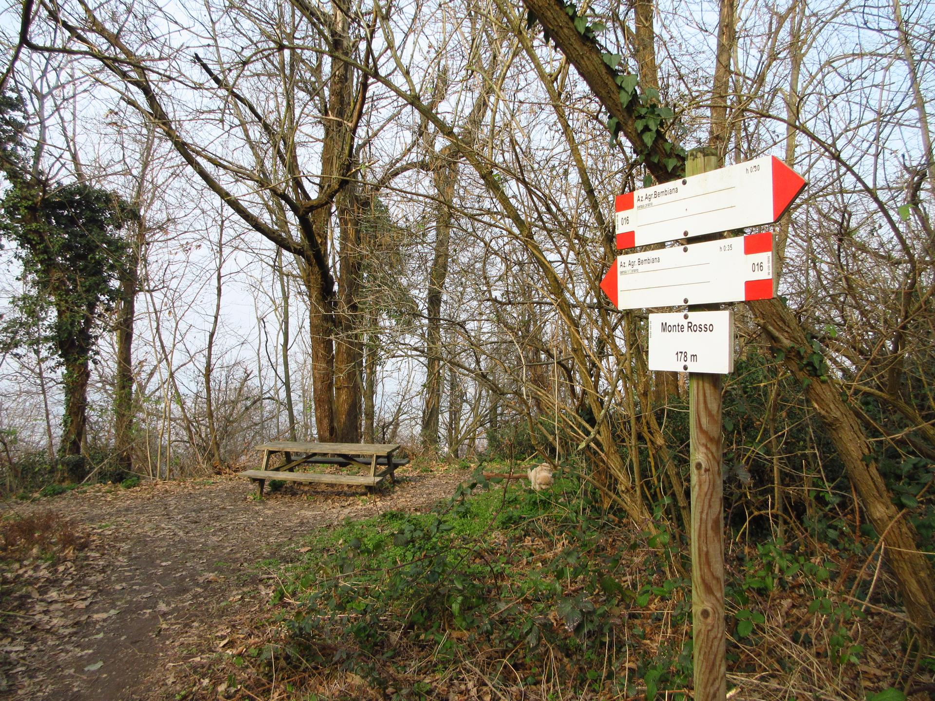 Il Monte Rosso è un'altura isolata; per accedervi si costeggia il parco di Villa Bembiana, attraversando un viale ombreggiato da un filare di platani e carpini. Il bosco è caratterizzato prevalentemente da un ceduo di robinia su una trama di antichi terrazzamenti che un tempo consentivano la coltivazione della vite, dei cereali o dei prodotti dell'orto. Non mancano i punti panoramici che permettono di osservare l'antico reticolo di bonifica.