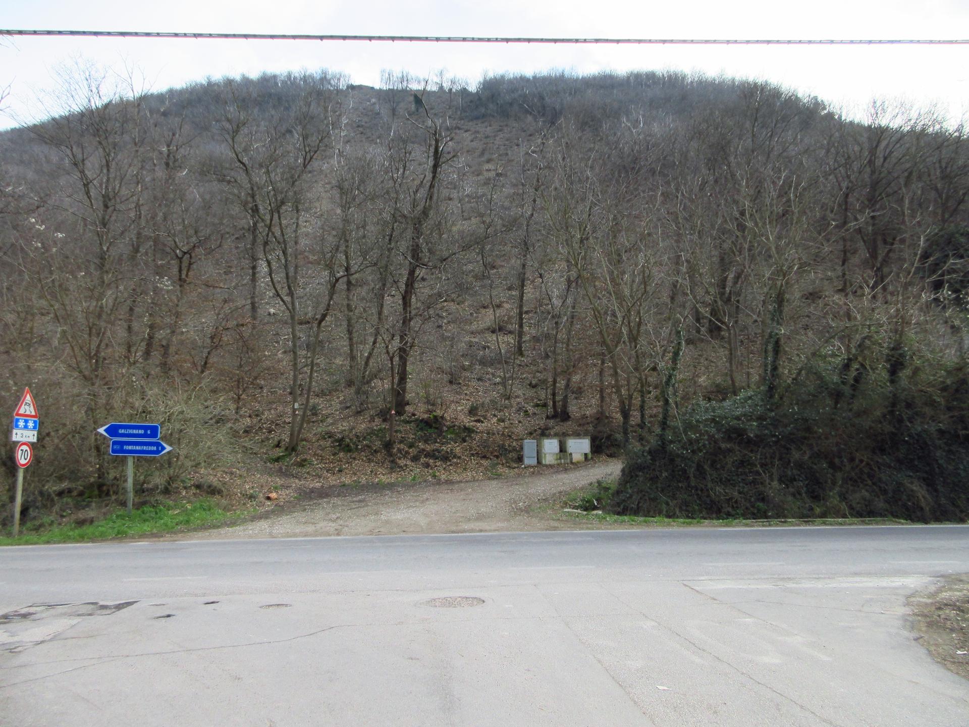 Dopo circa 10 minuti si esce dal bosco. La strada che scende da sinistra è il punto di congiunzione del percorso ad anello che andiamo a percorrere.