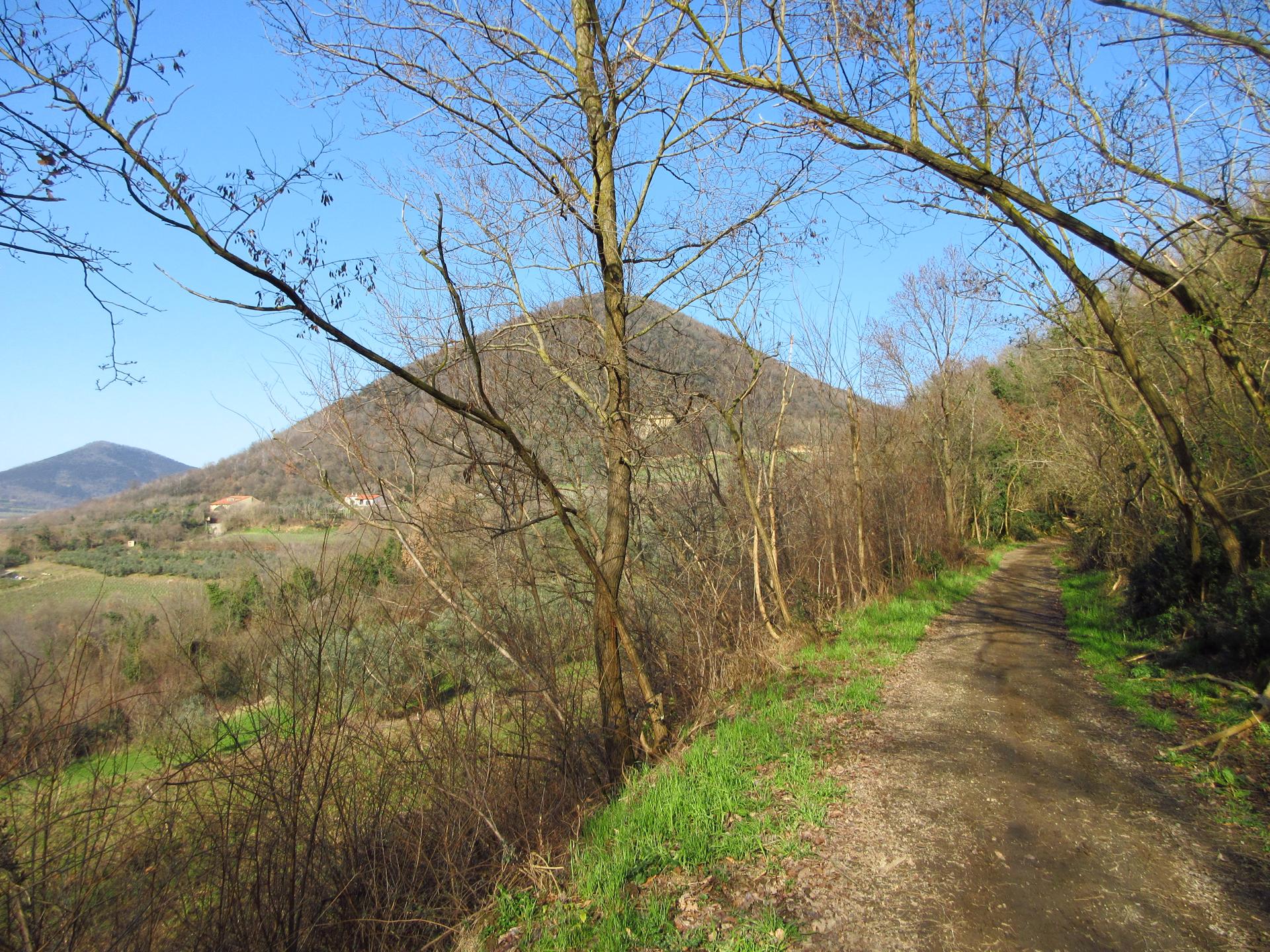 Dall'incrocio si scende per un centinaio di metri per svoltare a sinistra lasciando la strada asfaltata per continuare su una strada sterrata.