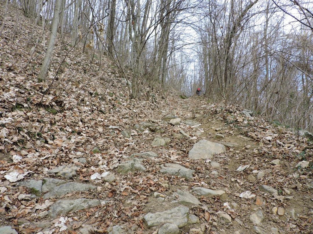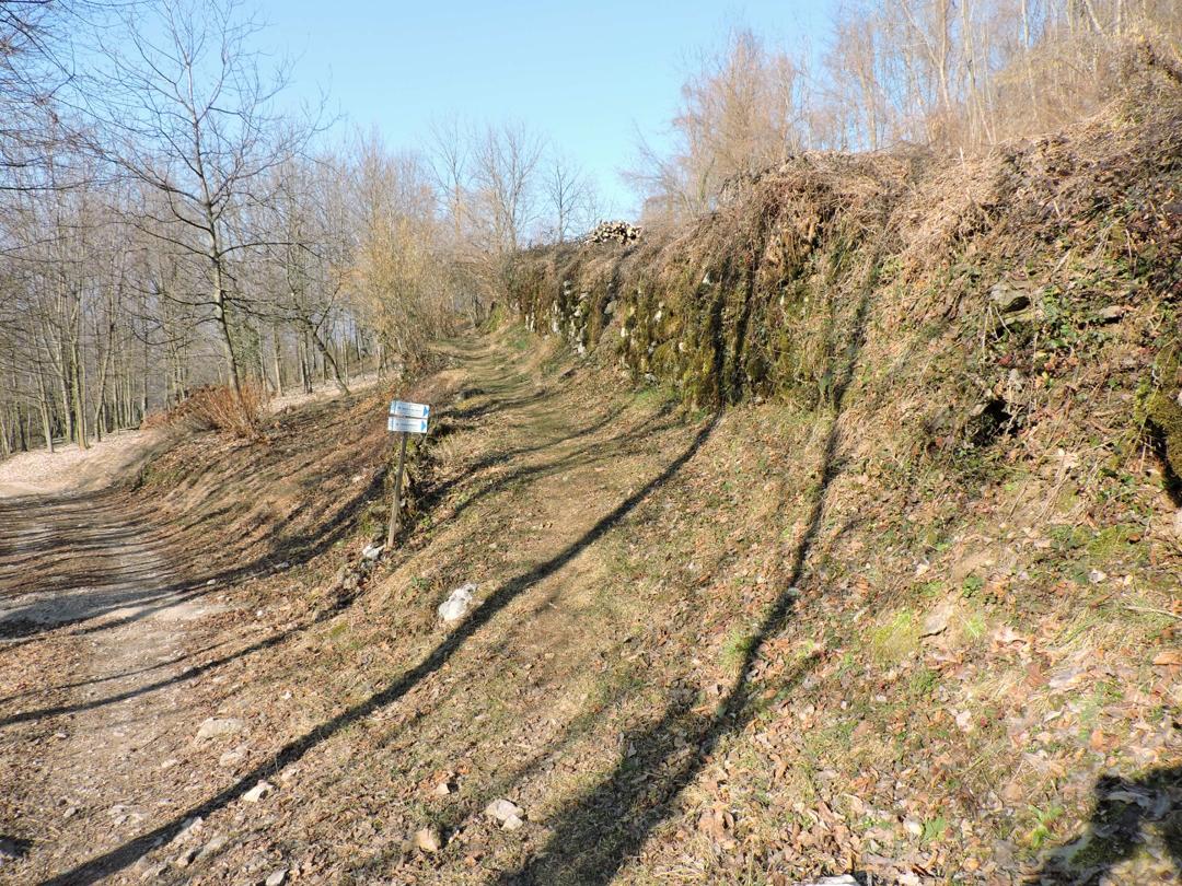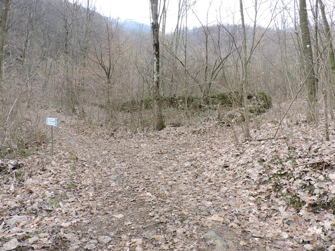 Circa 400 metri dopo la svolta a nord della mulattiera ed il cartello di pericolo, il sentiero si divide. Prendiamo la salita a sinistra come indicato dalla tabella e facendo una grande curva ci ritroviamo a scendere verso sud.