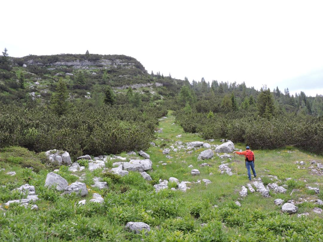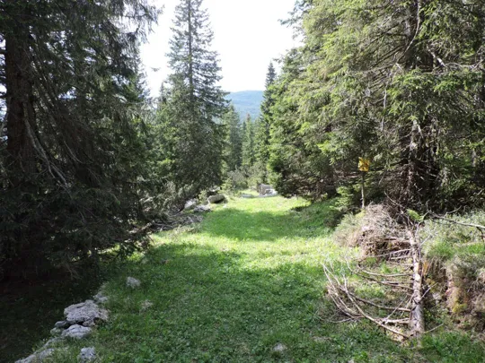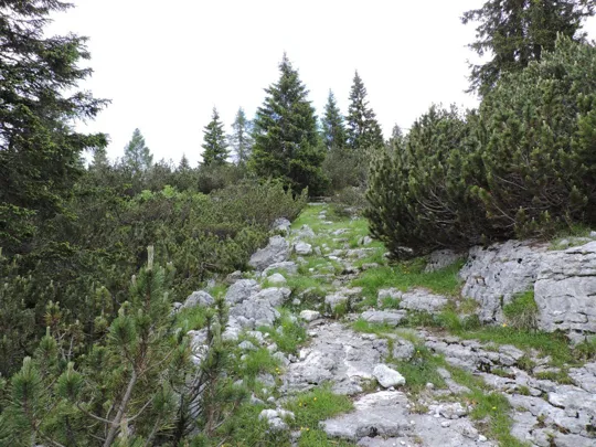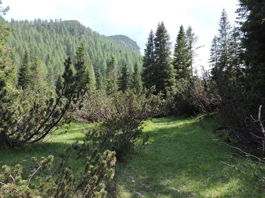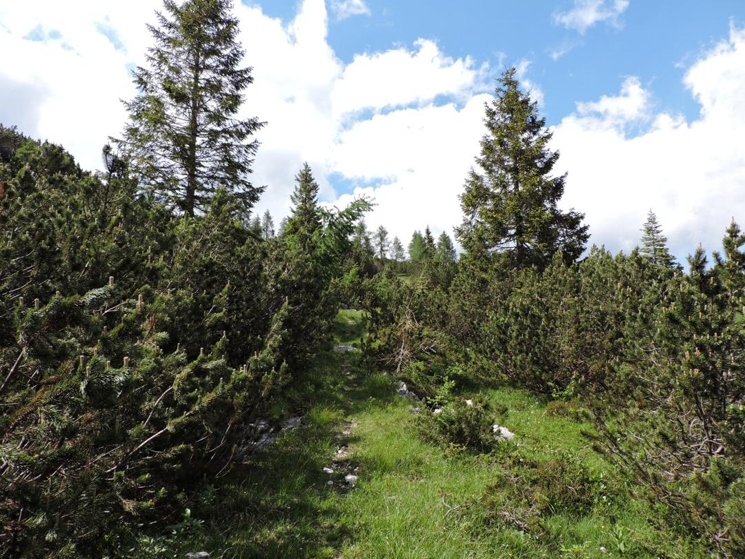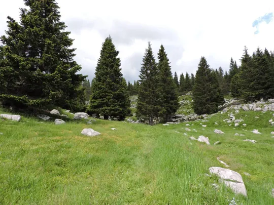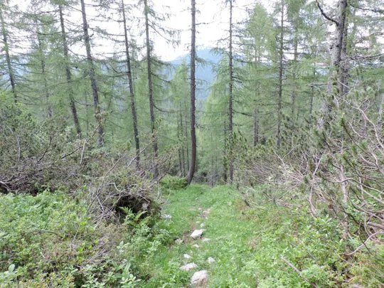 Arrivati nei pressi della malga la strada gira verso sinistra e il sentiero prosegue dritto in direzione nord. Non è molto facile da vedere, dipende da quanto è calpestata l'erba. Il sentiero passa a sinistra di un abbeveratoio fino ad arrivare a destra delle rocce di fronte. Poi il sentiero torna ad essere visibile.