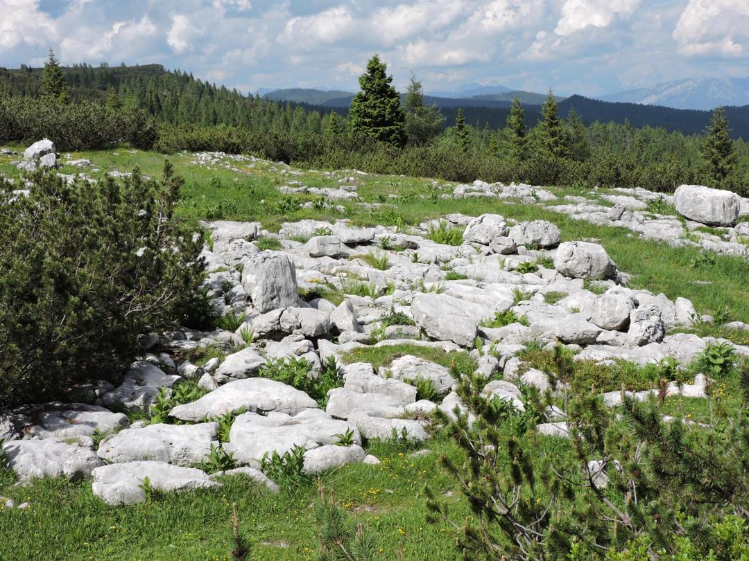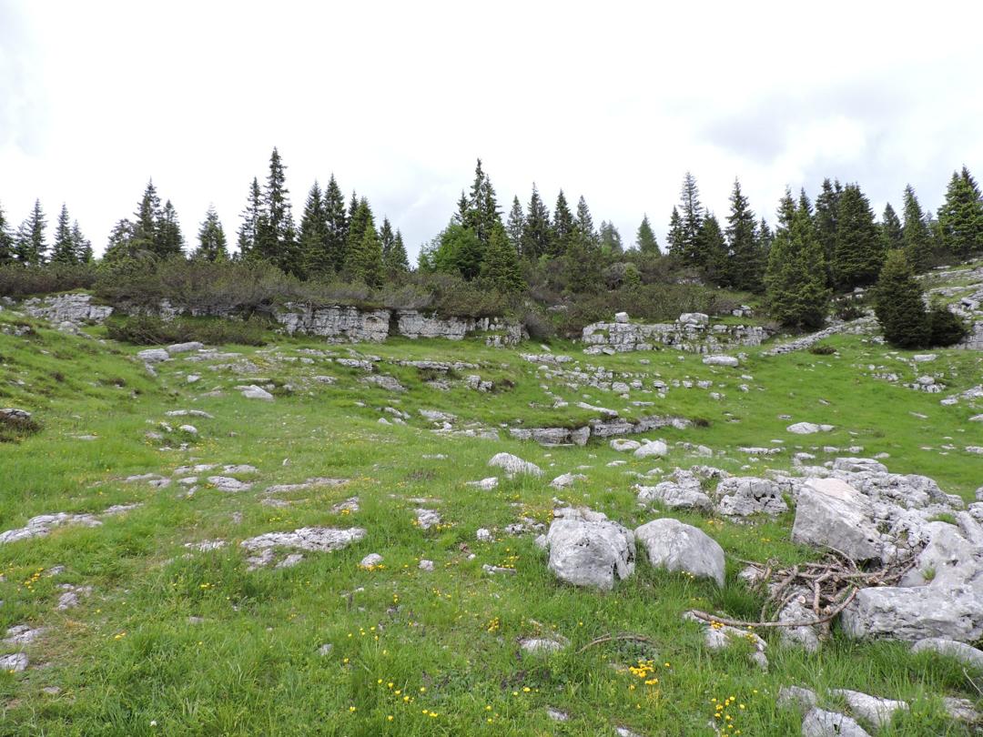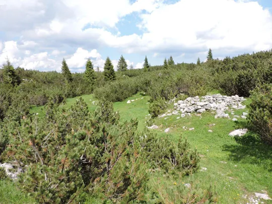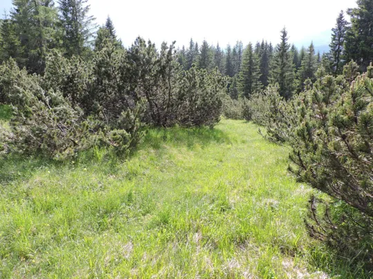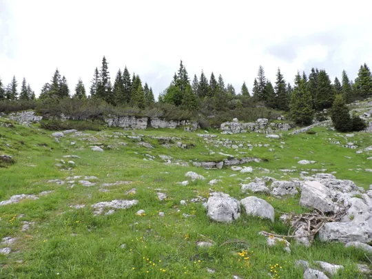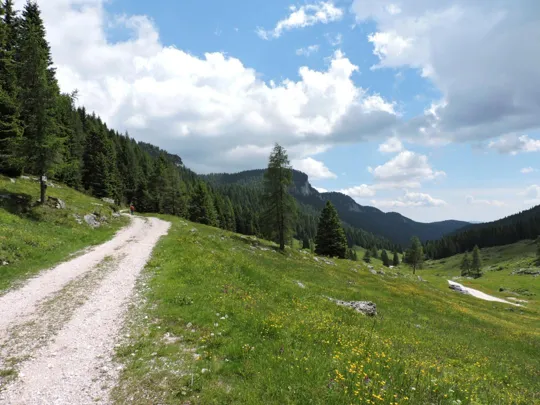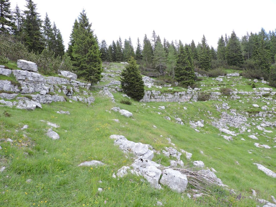 Arrivati nei pressi della malga la strada gira verso sinistra e il sentiero prosegue dritto in direzione nord. Non è molto facile da vedere, dipende da quanto è calpestata l'erba. Il sentiero passa a sinistra di un abbeveratoio fino ad arrivare a destra delle rocce di fronte. Poi il sentiero torna ad essere visibile.