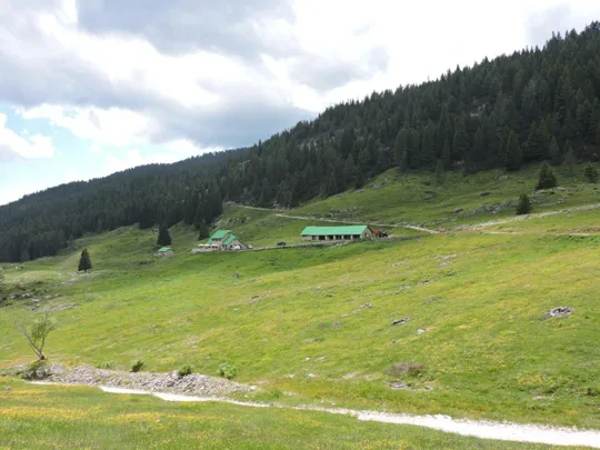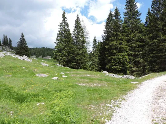 Arrivati in vista della malga si lascia la strada principale proseguendo dritti in direzione della malga stessa. Se comunque proseguite per la strada principale arriverete allo stesso punto con qualche centinaio di metri in più di cammino.
