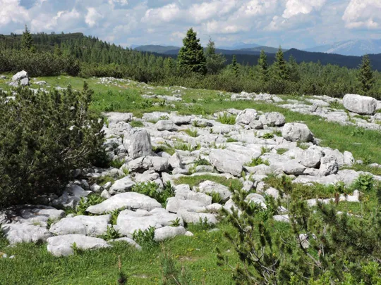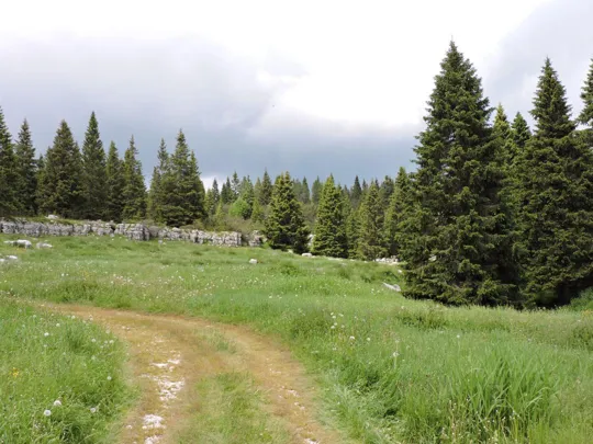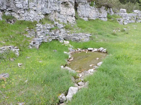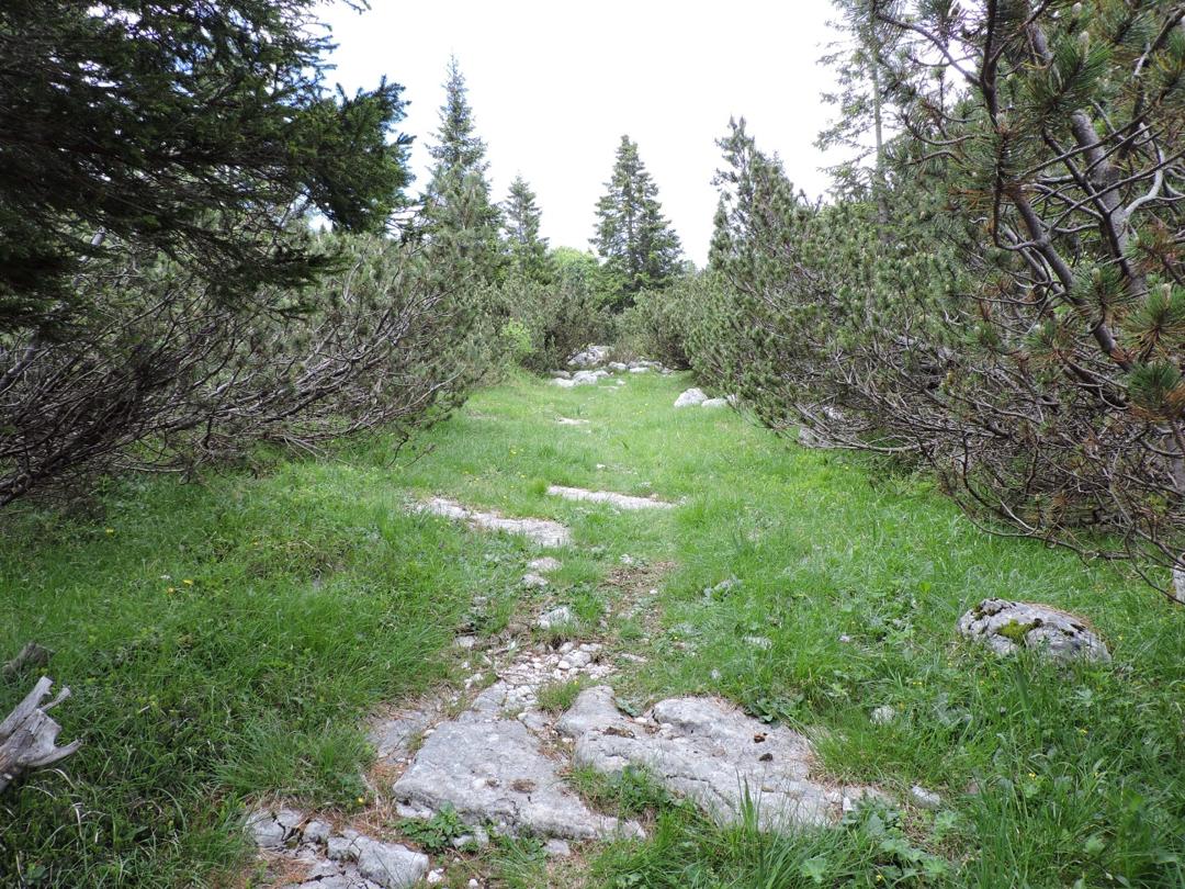 Dopo una leggera curva a destra si incontra una sorgente d'acqua e poco dopo una curva a sinistra il percorso continua tra i pini mughi.