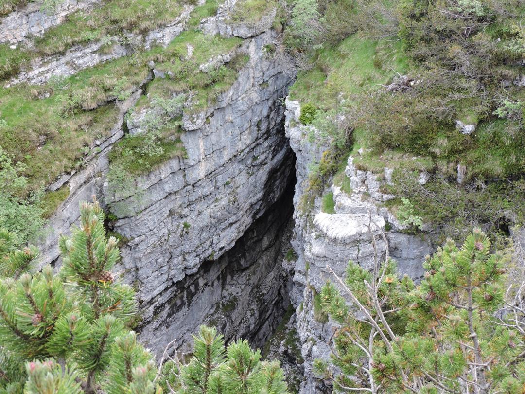 Proseguendo si arriva alla voragine. Dalla malga ci sono voluti circa 10 minuti. Sebbene la voragine (Buso della neve) sia grande, dei pini mughi la dividono dal sentiero e potrebbe passare inosservata. La si può osservare alla sinistra quando il sentiero fa una brusca curva a destra in direzione est.