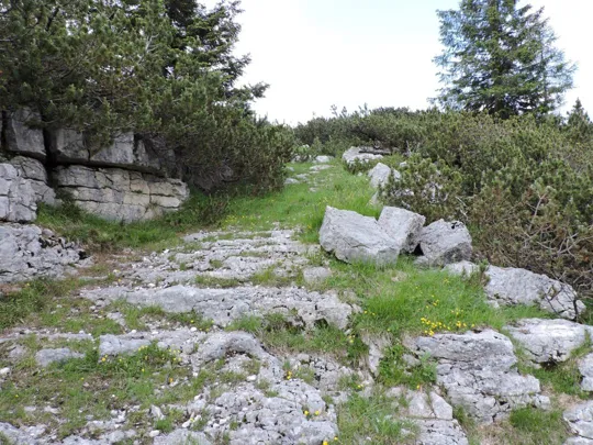 Il sentiero sembra essere una vecchia mulattiera militare e si riconosce dai bordi di sassi allineati che sono quasi sempre presenti.
