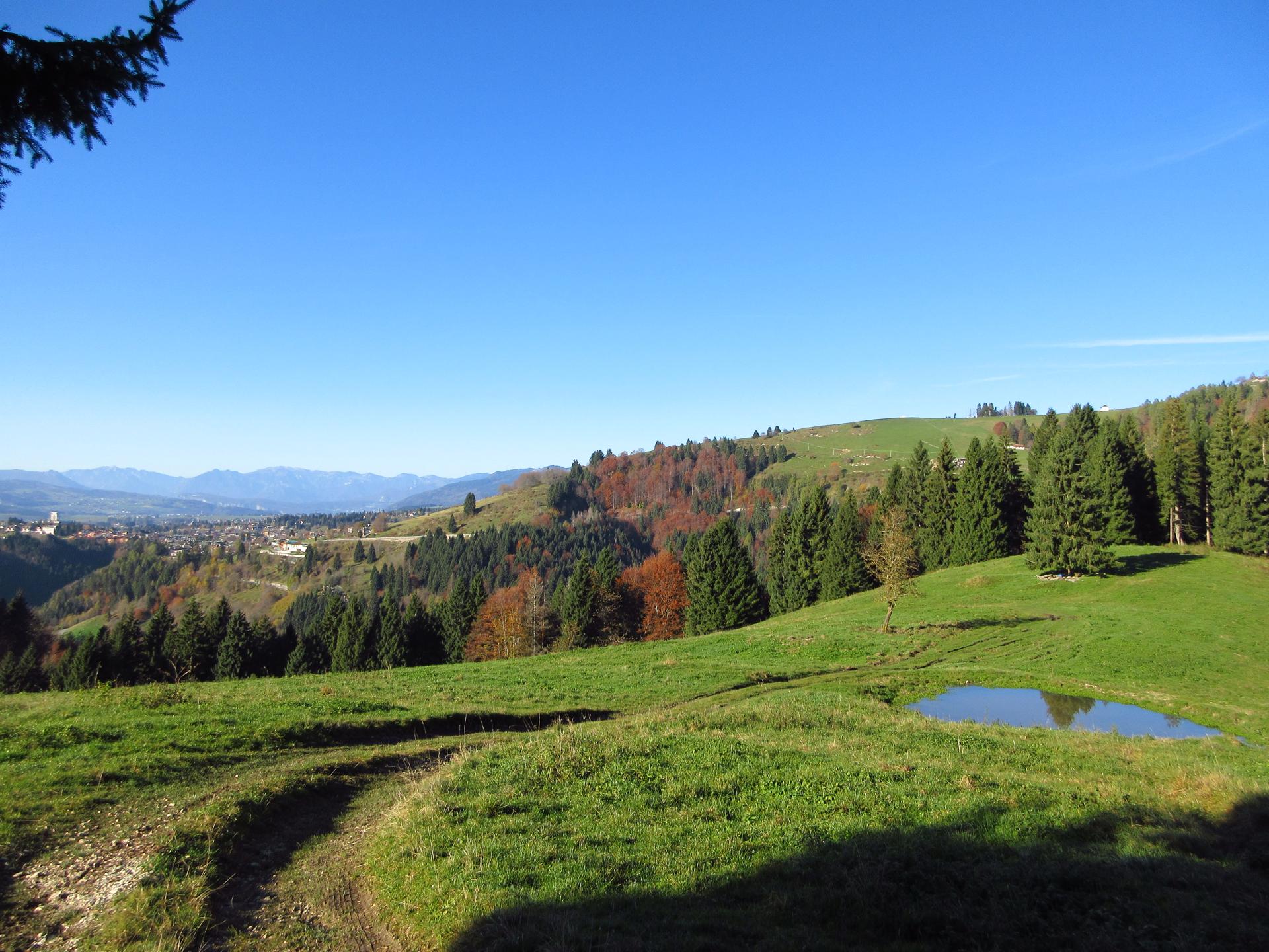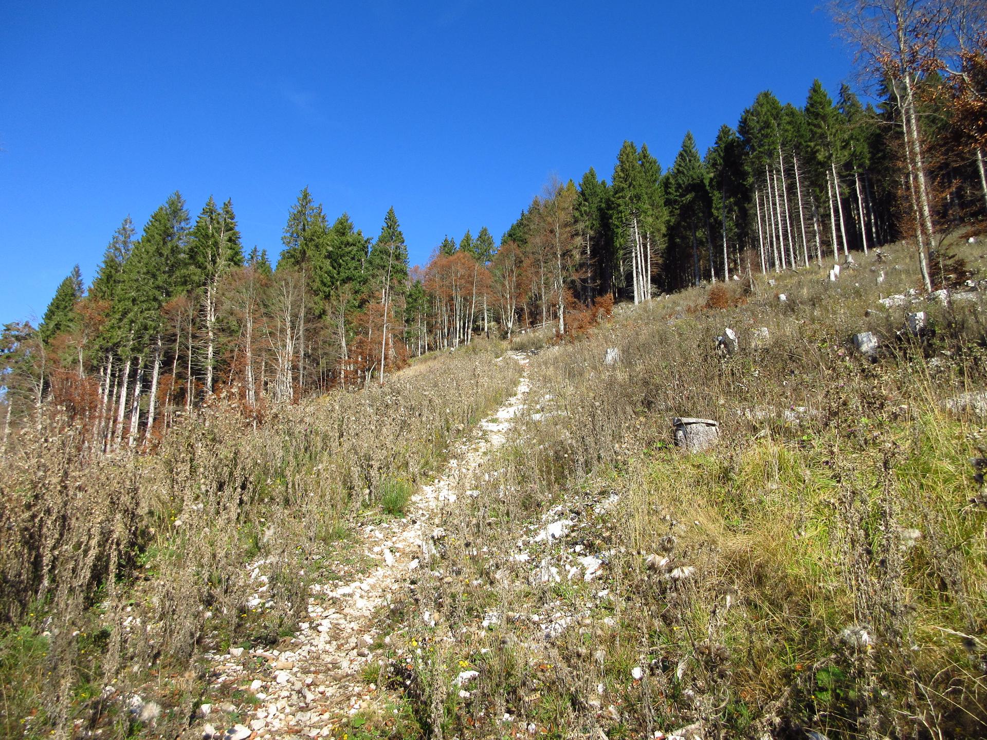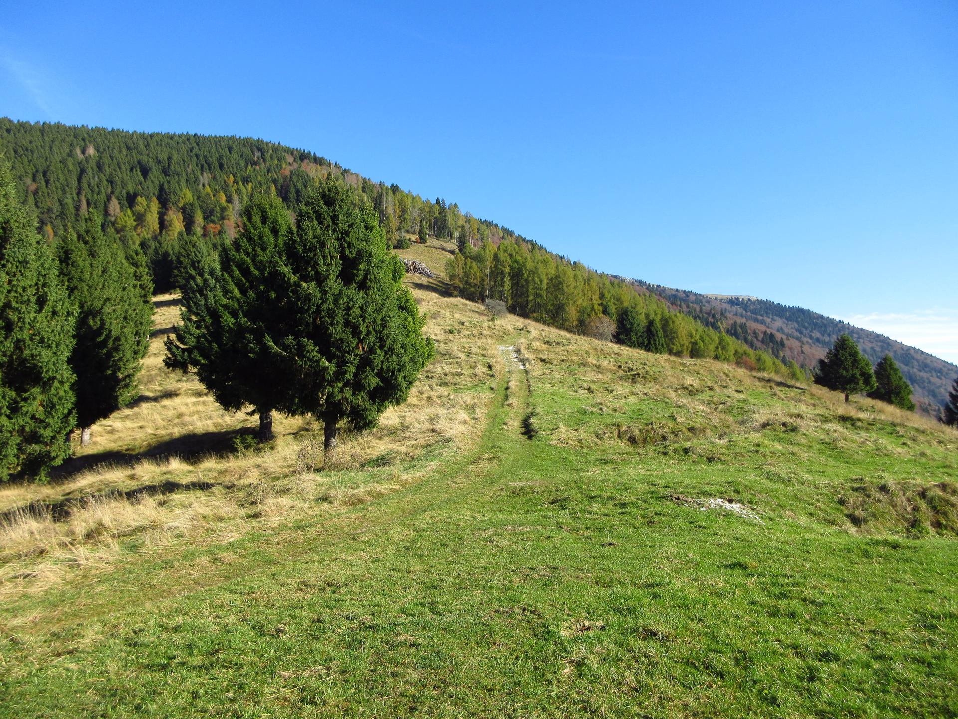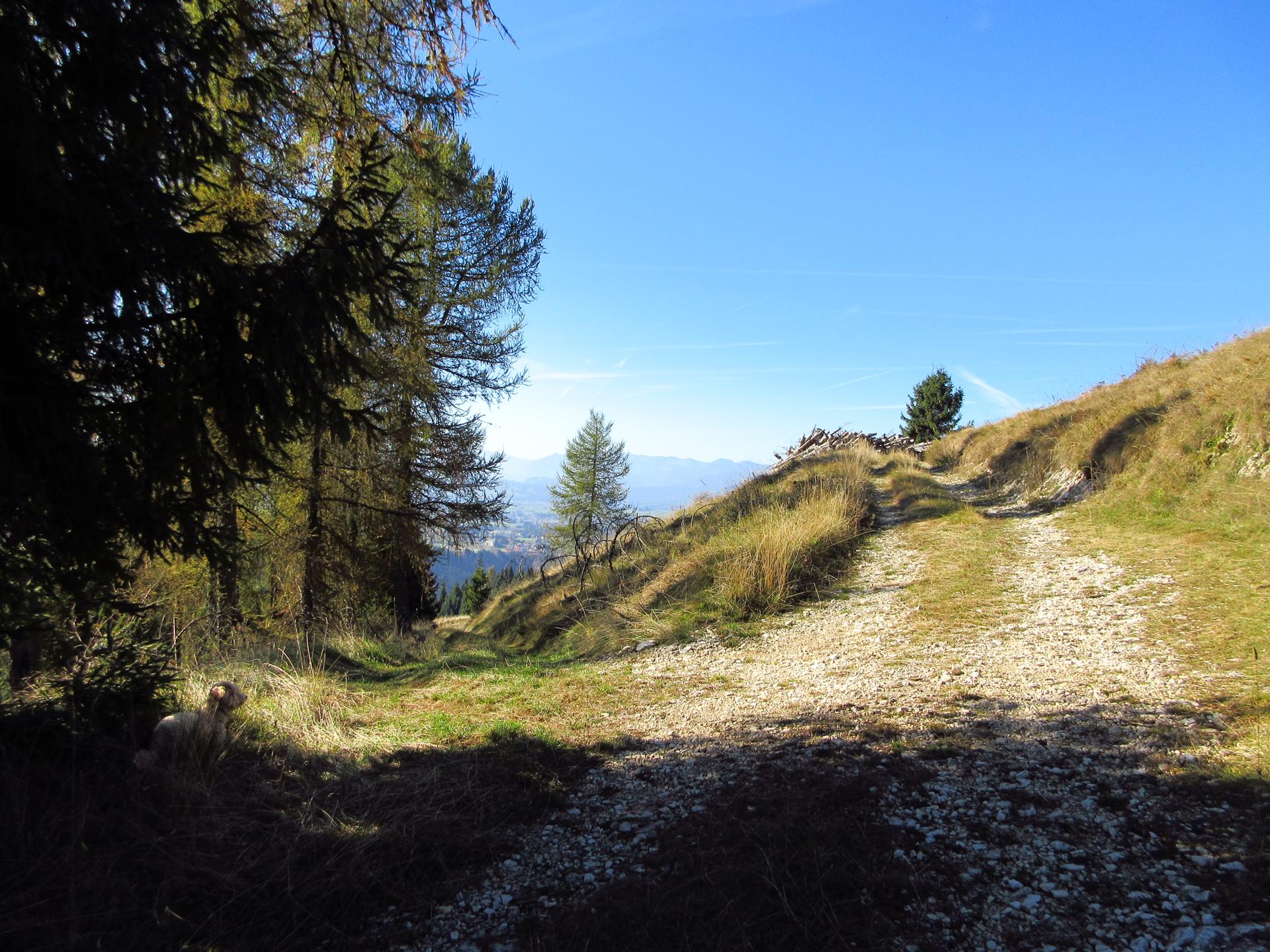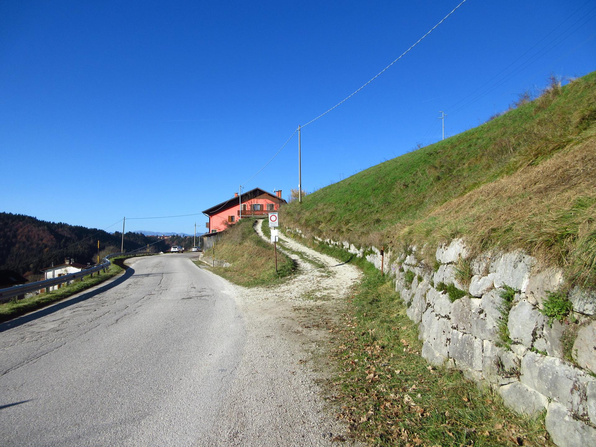 La strada prosegue in falso piano, fino a ricongiungersi con la strada che sale dal monte Zomo.