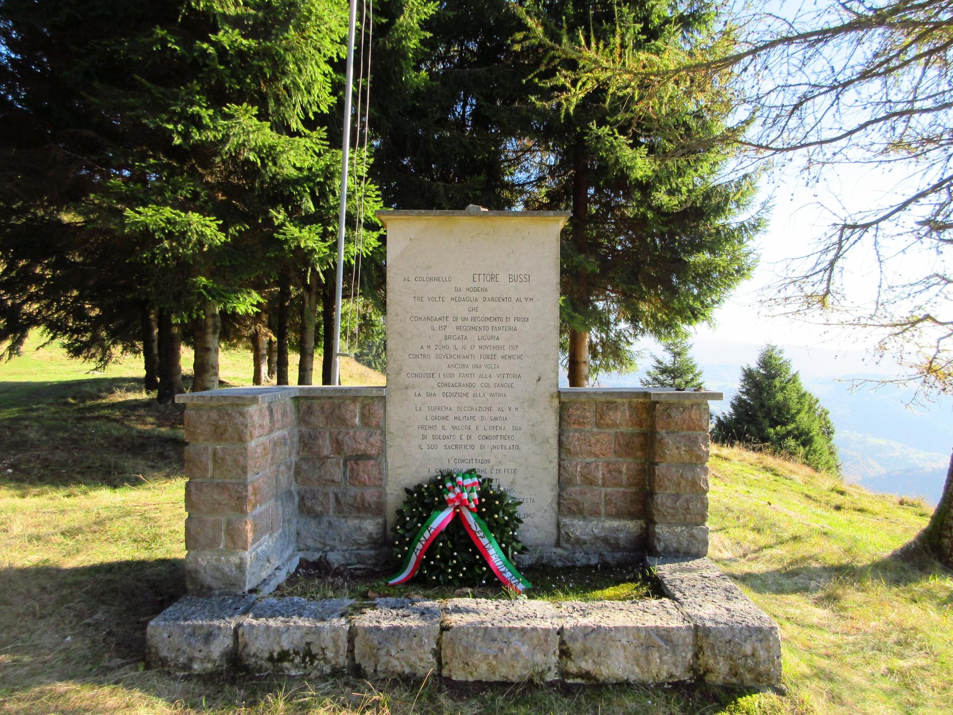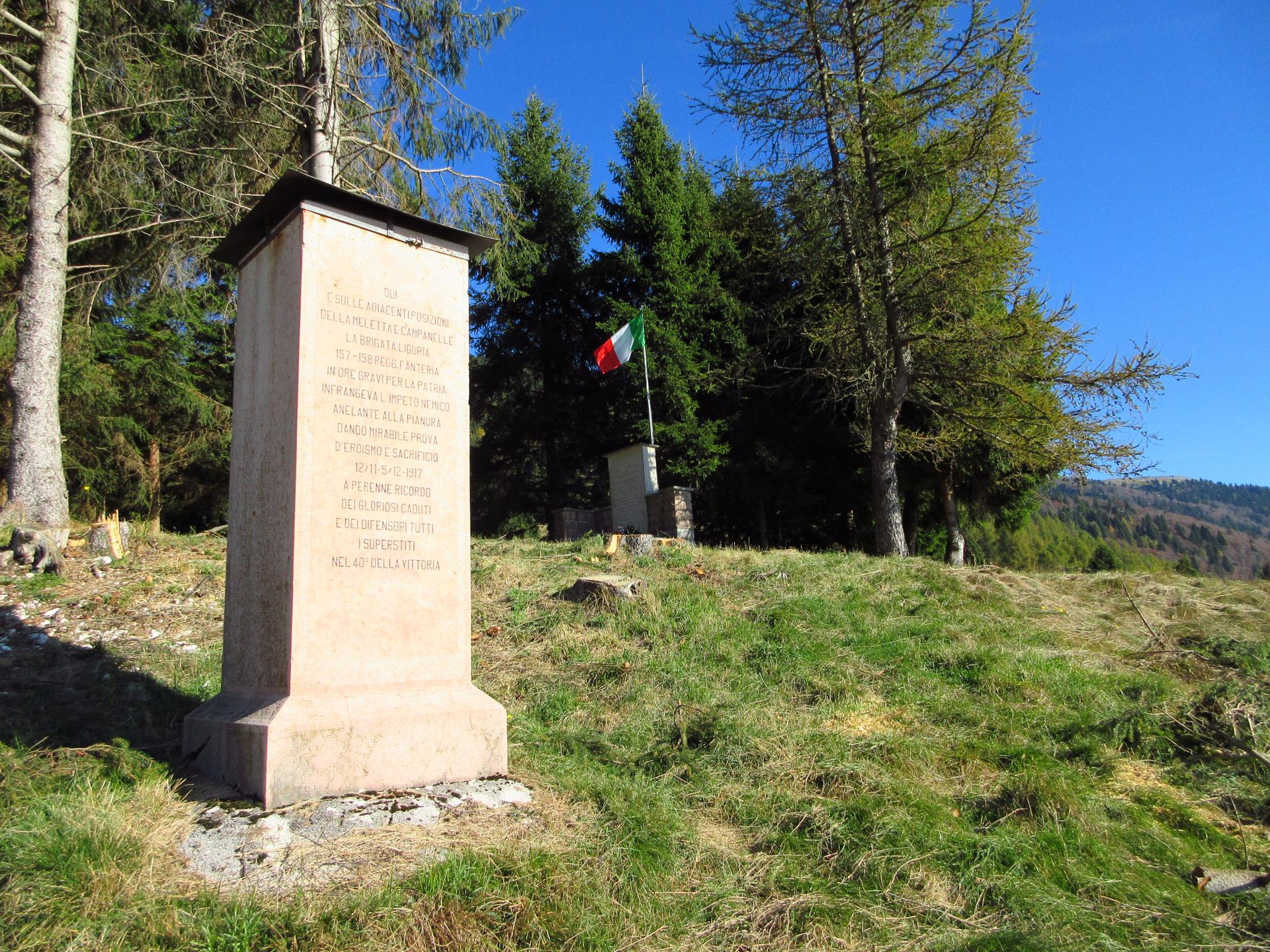 QUI E SULLE ADIACENTI POSIZIONI DELLA MELETTA E CAMPANELLE LA BRIGATA LIGURIA 157-158 REGG.FANTERIA IN ORE GRAVI PER LA PATRIA INFRANGEVA L'IMPETO NEMICO ANELANTE ALLA PIANURA DANDO MIRABILE PROVA D'EROISMO E SACRIFICIO 12/11-5/12-1917