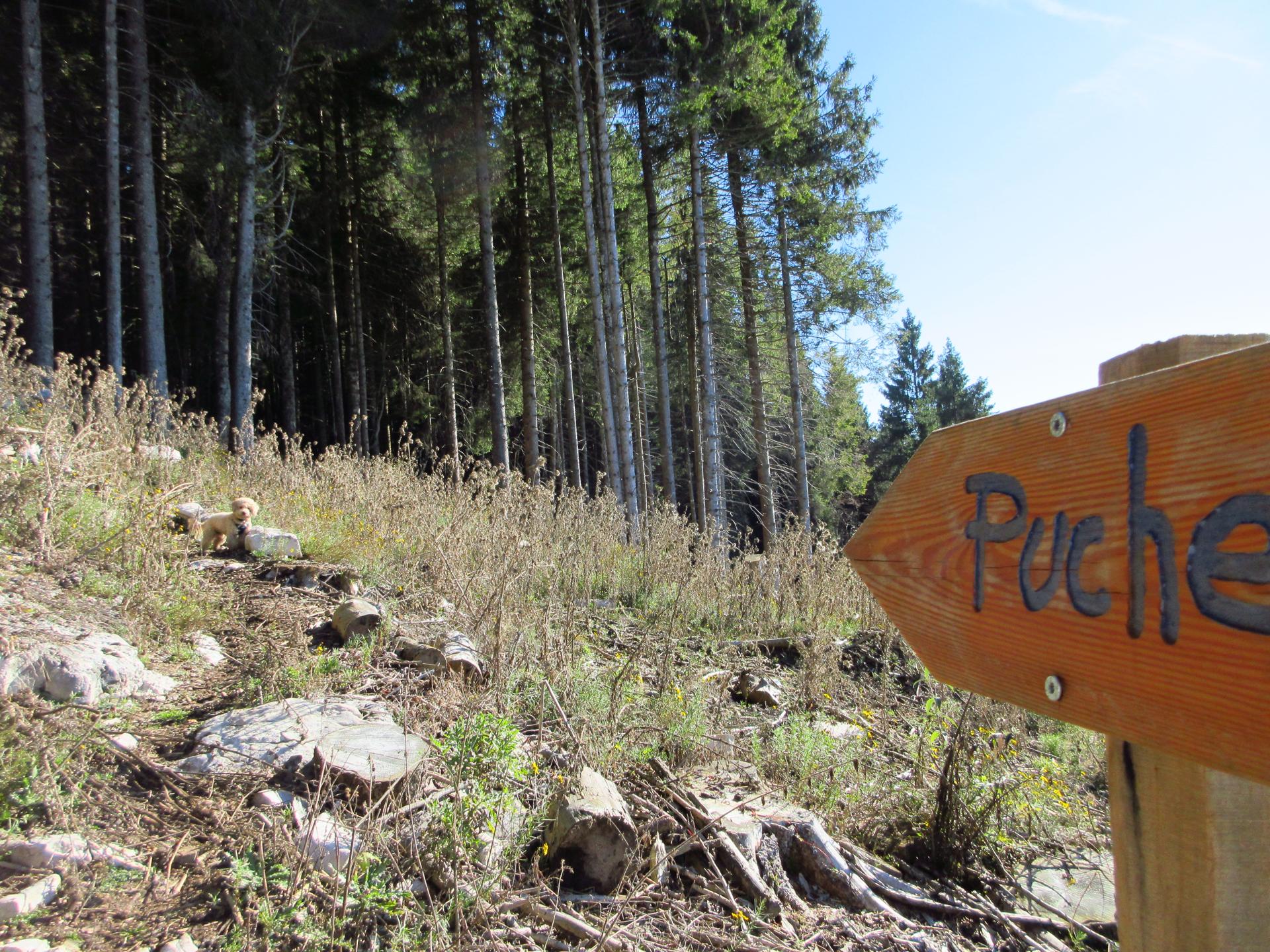 Il sentiero molto ripido ci porta nella zona delle Puche. Una tabella, riportata nella sezione Natura e Ambiente a fondo pagina, ci spiega cosa sono le Puche. In teoria c'è un breve ramo del sentiero che porta verso nord dove è possibile vedere delle altre Puche, ma non è agibile.