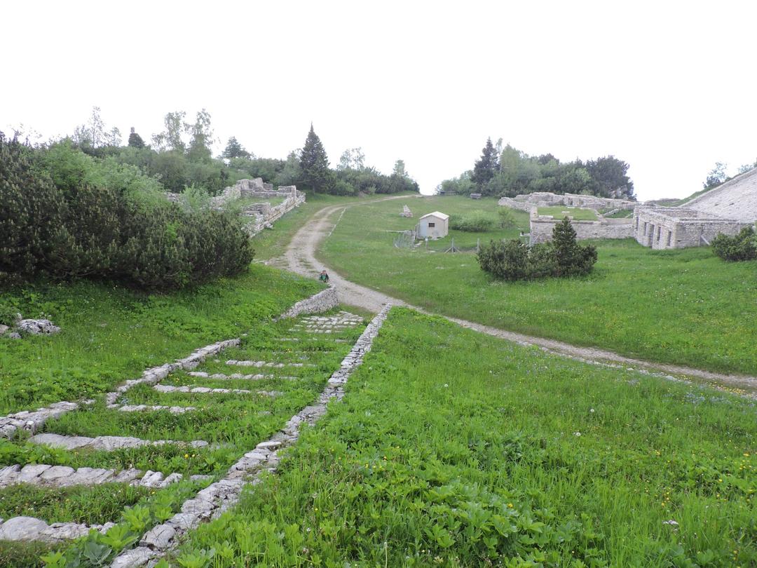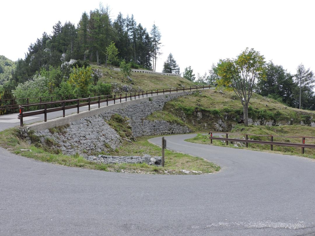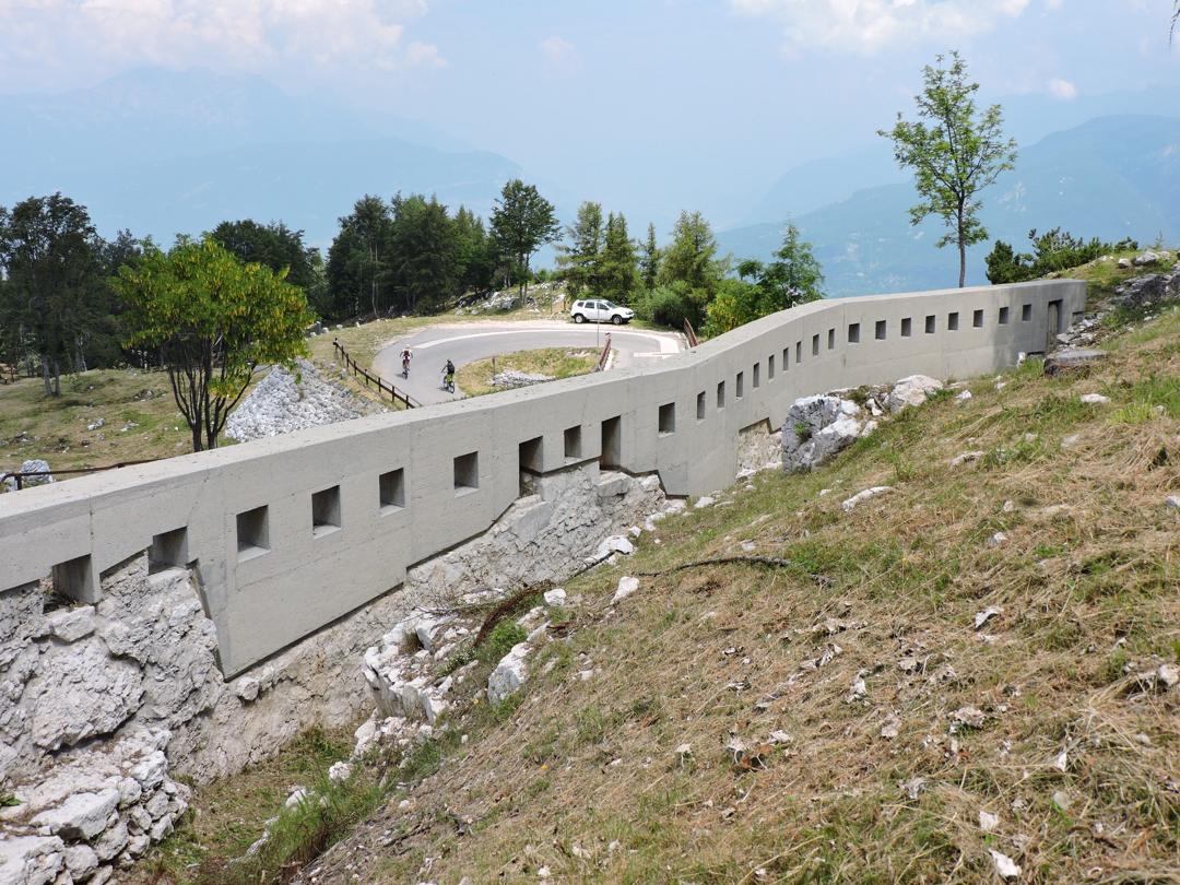 Si prosegue ancora lungo la strada fino ad arrivare in una zona molto stretta della cresta della montagna. La strada forma un bellissimo serpentone tagliando una zona piena di trincee e postazioni. Si inizia a vedere una trincea ricostruita e, osservando l'asfalto della strada, la traccia di come la trincea proseguiva.