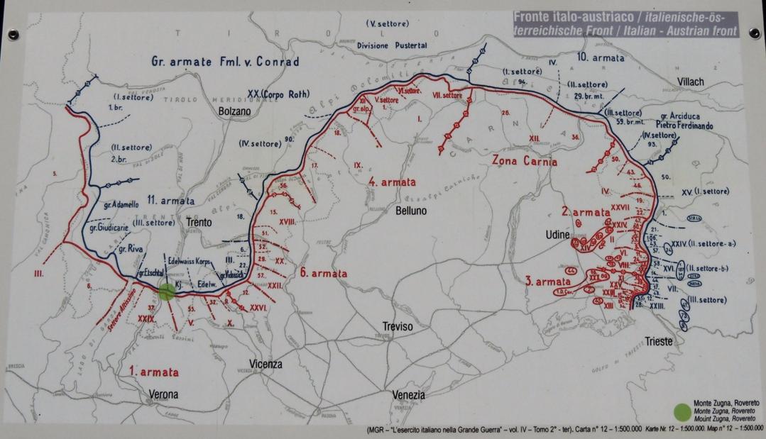 Dallo Zugna di soldati italiani potevano vedere, come premio per il loro sacrificio, non solo il gruppo del Brenta e l'Adamello, ma anche Trento, la città per la quale combattevano e morivano.