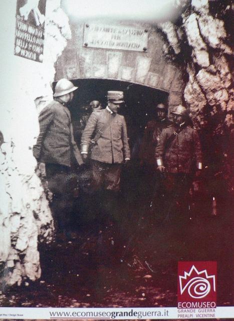 Nella galleria il Cap. Federico Morozzo della Rocca, comandante del IV Battaglione del I Reggimento Granatieri di Sardegna, situò il comando del settore del Cengio. La caverna fungeva anche da posto di primo soccorso sanitario e qui vennero ammassati i feriti durante l'attacco risolutivo del 3 giugno. Ricordo il Te. Giacomo Silimbani, Aiutante Maggiore il II del Cap. Morozzo della Rocca: "Venni portato la posto di medicazione situato in caverna, già pino di feriti e posto in una barella. Fuori il combattimento era accanitamente impegnato ma io non sentivo che il frastuono confuso. Mentre un caporalmaggiore di sanità stava fasciandomi la seconda ferita, irruppero nella caverna gli austriaci ... Semisvenuto venni trasportato dagli stessi granatieri portaferiti, per ordine di un ufficiale austriaco, al poso di medicazione nemico e poi a Pedescala, presso una sezione di sanità".