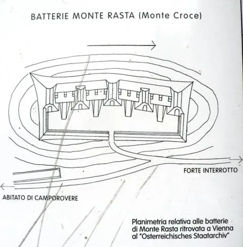 Le batterie di monte Rasta, situate a quota 1260, vennero costruite dall'esercito Italiano a difesa della caserma di Monte Interrotto presumibilmente negli anni 1883-85. La sommità del monte Rasta (chiamato anche monte Croce) era difesa da una duplice batteria di cannoni posti e protetti da un terrapieno. Allo scatenarsi della Strafeexpedition del maggio 1916 (più propriamente chiamata Offensiva di Primavera), cadde in mano austriaca e vi rimase fino al termine del conflitto. La sua posizione di avamposto nel periodo che va dal giugno 1916 al novembre 1917 ne fece un caposaldo austro-ungarico strategicamente importante. Nel giugno del 1917 il suo aspetto venne completamente stravolto dai reiterati attacchi italiani da parte della 57° Divisione (gen. Scotti, capo SM ten. Col. Gabba) che copriva il fronte tra l'abitato di Camporovere e M. Catz con i seguenti reparti: Brigata Porto Maurizio (generale Nigra) con il 253° (col. Cecchi) e 254° fanteria (col. Bechi), il VI° battaglione genio zappatori e quattro compagnie mitraglieri.