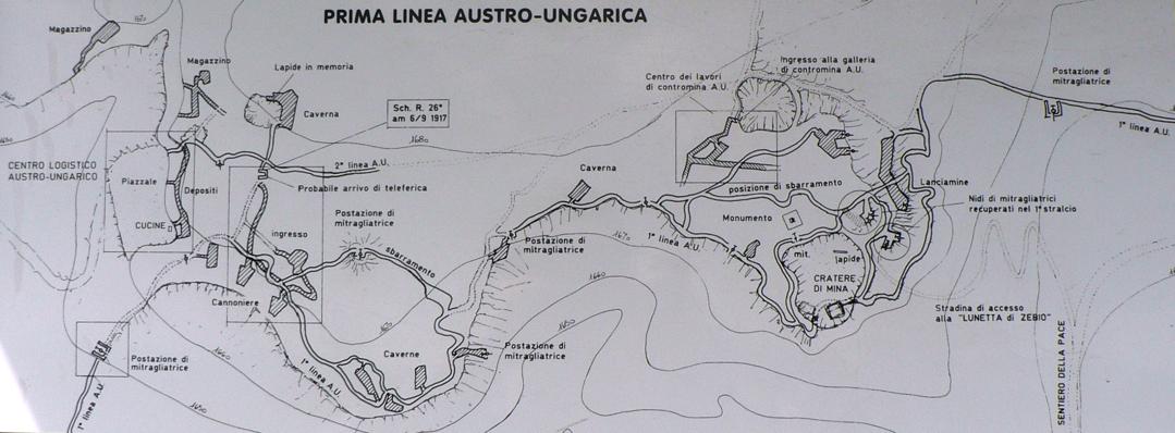 Dalla relazione del capitano Rudolf Weiss Comandante della compagnia zappatori 1/9 "Battaglia per un cratere di mina". Lo scoppio della mina. "Nella sezione 61 a M.Zebio (corrispondente alla Lunetta degli italiani) già durante l'inverno era stato possibile rilevare lavori di mina da parte degli italiani. Si procedette perciò a lavori di contromina nell'intento di preservare, almeno in parte, la nostra posizione... Nel pomeriggio dell'8 giugno si scatenò un violento temporale: improvvisamente verso le 16.45, con uno spaventoso boato saltò in aria la nostra posizione principale della Sezione 61. Al suo posto si aprì nella roccia un ampio cratere del diametro di 35 m. e una profondità di 9 e mezzo; la carica, secondo i calcoli, doveva essere stata di circa 3.500 kg. di gelatina esplosiva. Non v'era dubbio sul fatto che una camera di scoppio preparata dal nemico era esplosa per caso, improvvisamente, perciò alla deflagrazione non fece seguito nessun attacco da parte delle fanterie e l'occasione favorevole non venne sfruttata dagli italiani." "... vennero catturati nei pressi del cratere cinque genieri italiani,... . Essi riferirono che la mina avrebbe dovuto brillare soltanto alcuni giorni dopo (esattamente alle ore 15 del giorno 10 giugno), ma che era esplosa in anticipo a causa di un fulmine abbattutosi sulle condutture elettriche..."