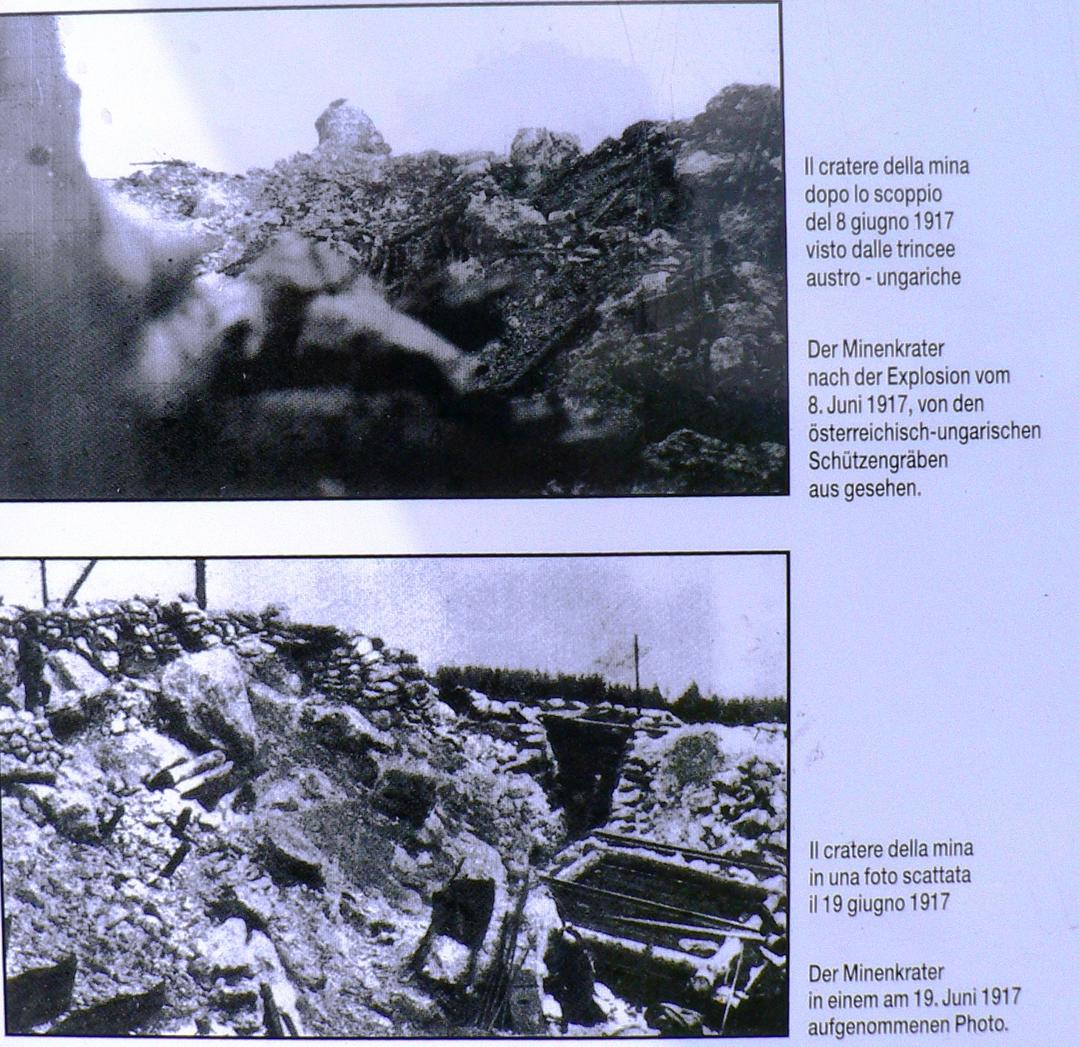 Dalla relazione del Colonnello Herman Strohschneider "Il 3° reggimento Schutzen a Monte Zebio" 8 - 29 giugno 1917 "... Era l'8 giugno. Nel pomeriggio si scatenò un violento temporale: guizzavano i lampi e tra lo scrosciare della pioggia il rombo dei tuoni superava quello dei cannoni e delle mitragliatrici. Improvvisamente si avvertì un tremito e un ondeggiare del terreno: con uno schianto spaventoso volarono in aria massi rocciosi, pietre, terriccio, alberi, uomini e materiali bellici. Era saltata la posizione della nostra Sezione 61, rimanendo sconvolta (la Lunetta dello Zebio)... il cratere si aperse per una larghezza di 35 m. e subito dopo, pur non essendo riusciti a comunicare fra loro, il comandante del vicino plotone situato a ovest, alfiere Oskar Wurst, e il comandante del plotone mitraglieri dislocato a est, sottufficiale Baumgartner, si affrettarono con particolare zelo ad occupare il cratere con alcuni uomini raccolti nei pressi... lo scoppio procurò anche all'avversario gravi perdite, fra le quali un maggiore, un capitano, e un sottotenente; ai quali aggiungere 100 dispersi e oltre 10 feriti. L'esplosione prematura dovrebbe attribuirsi ad una fortuita accensione prodottasi a causa d'un fulmine... La giornata del 9 giugno trascorse relativamente tranquilla; soltanto alcuni colpi di artiglieria caddero dietro la Sezione 61. Se ne approfittò per seppellire i caduti, amici e nemici: fu commovente vedere il cappellano Steiner benedire gli italiani morti, stando in piedi sul bordo del cratere; mentre gli uomini della pattuglia di sanità italiana, che avevano attivamente collaborato alle ricerche e alla raccolta dei cadaveri, congiungevano le mani unendosi alle preghiere pronunciate in tedesco."