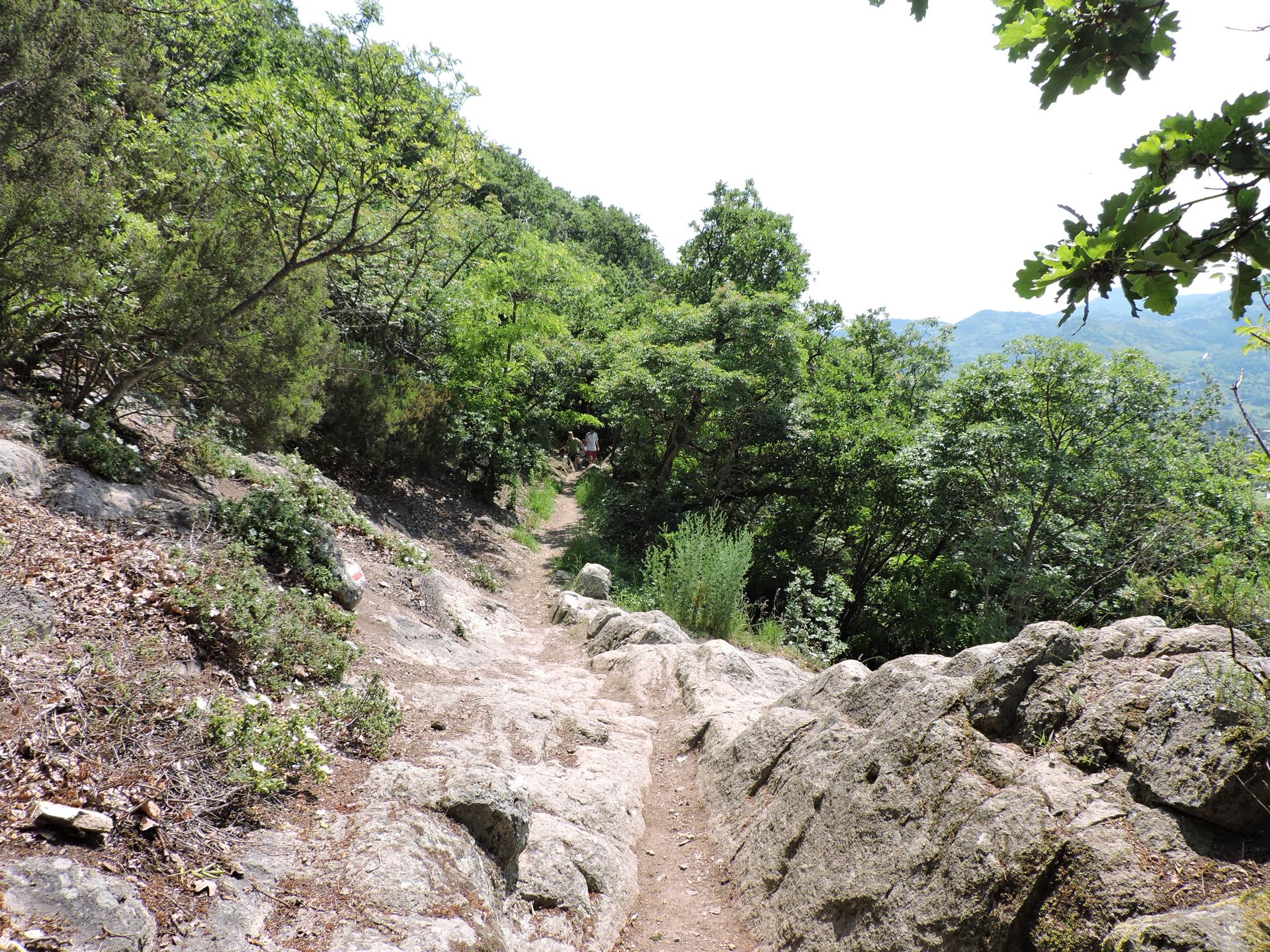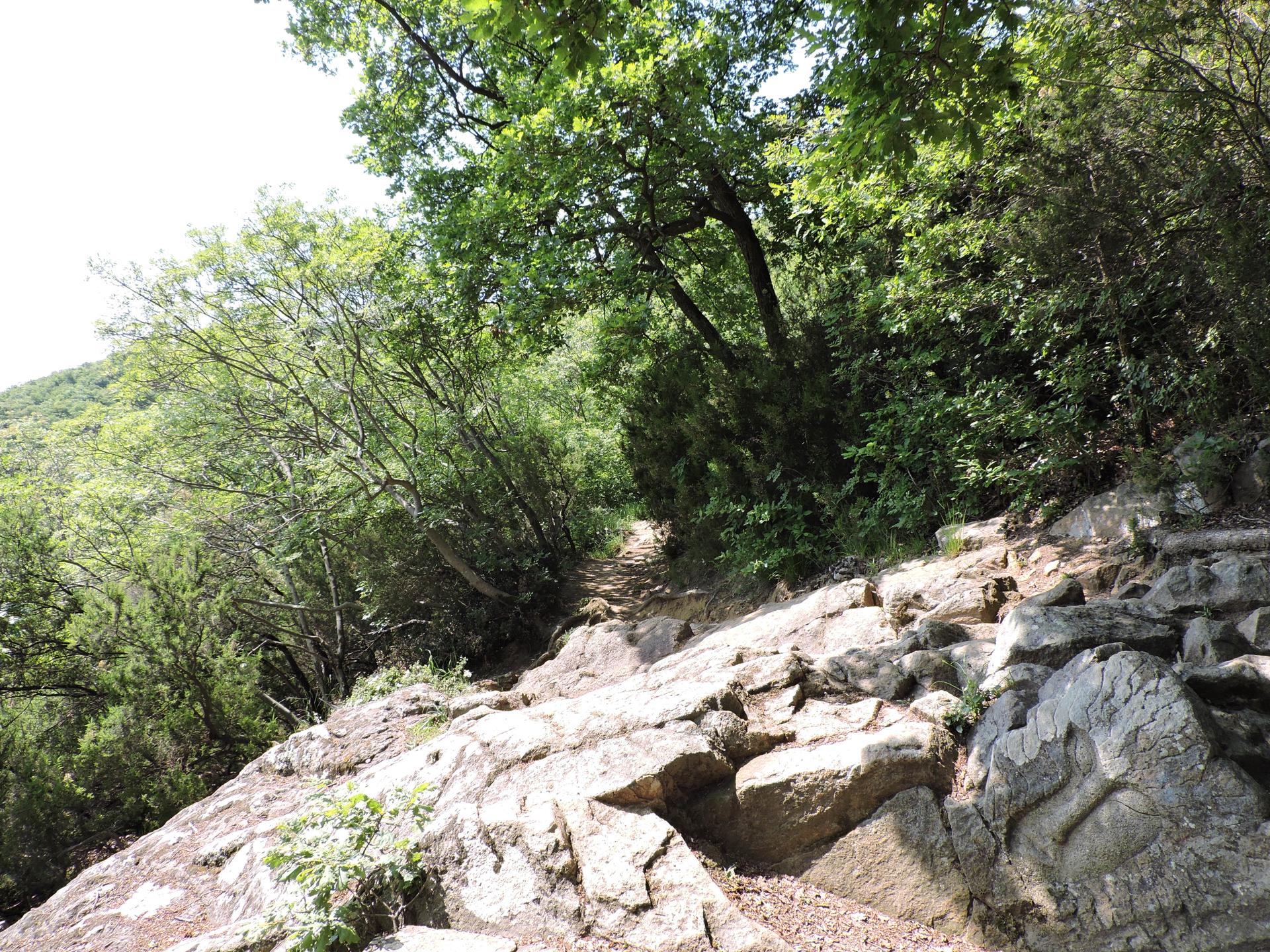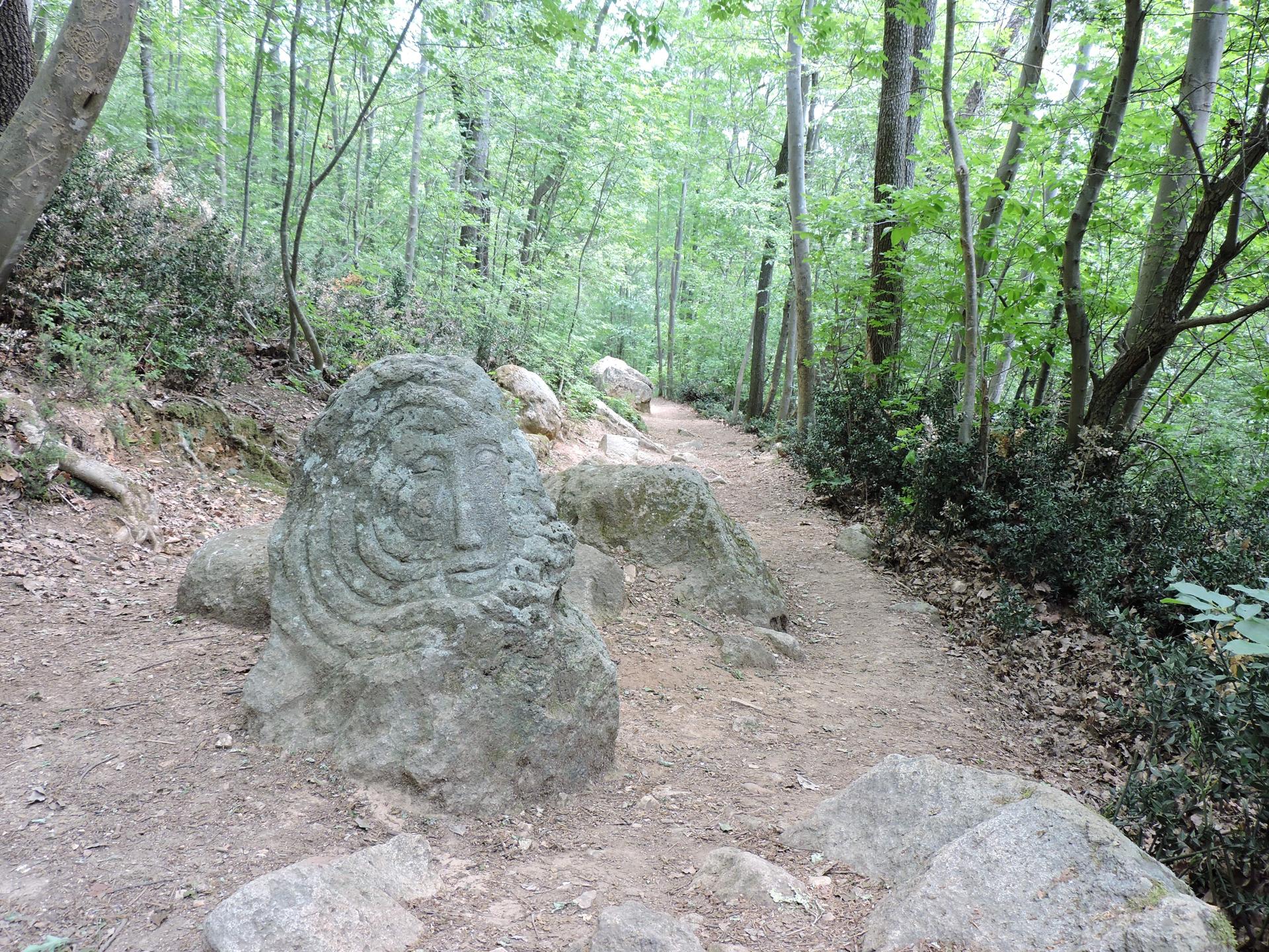 Dopo un passaggio sopra a delle rocce, un masso appare in mezzo al sentiero. Non è un masso qualunque, se vi girate dopo averlo superato si scopre che è stato scolpito.