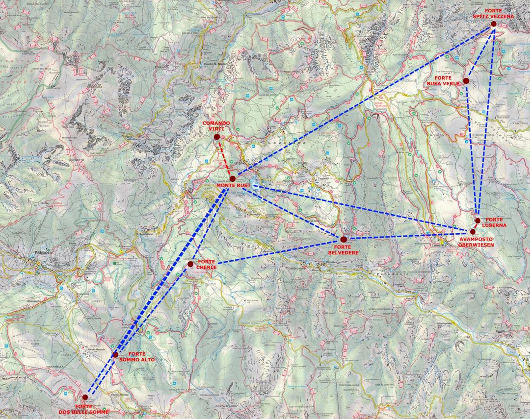 Dalla piantina qui sotto i tratti in blu identificano i collegamenti ottici tra i vari forti. Anche se il Monte Rust non è molto elevato è sicuramente in una posizione altamente strategica.
