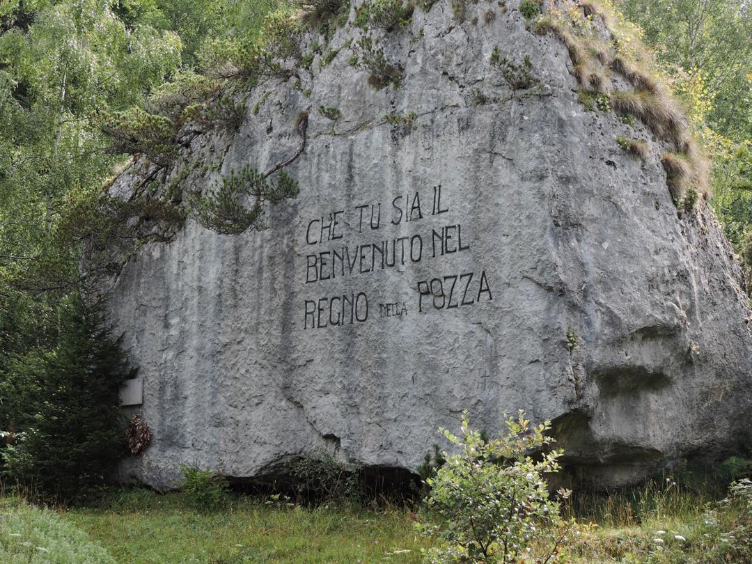 "Che tu sia il benvenuto nel Regno della Pozza" ed aggiungo che in questo regno si va solo a piedi o mountain-bike. Questa scritta si trova al termine della strada che si può percorrere in auto. Il parcheggio è abbastanza ampio (per circa 40 auto) eventualmente ci sono altri posti un po' prima.
