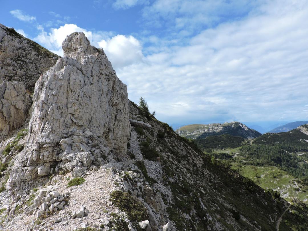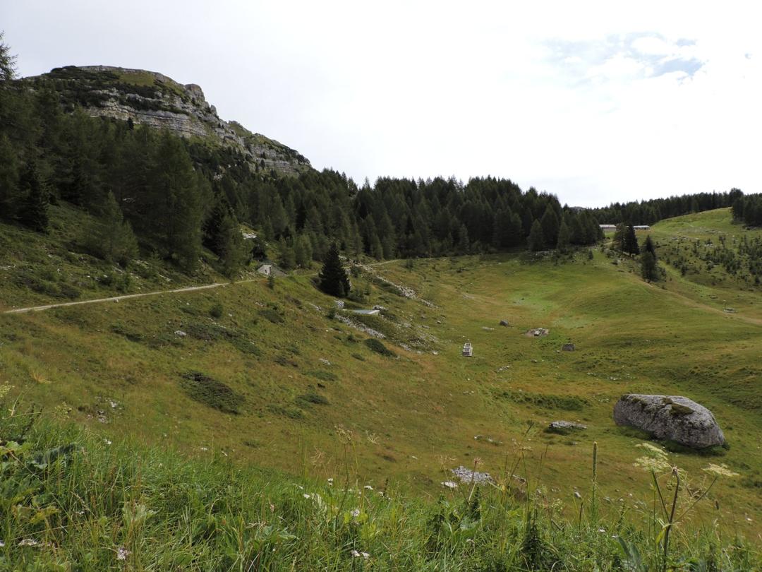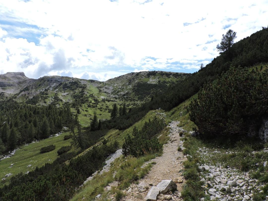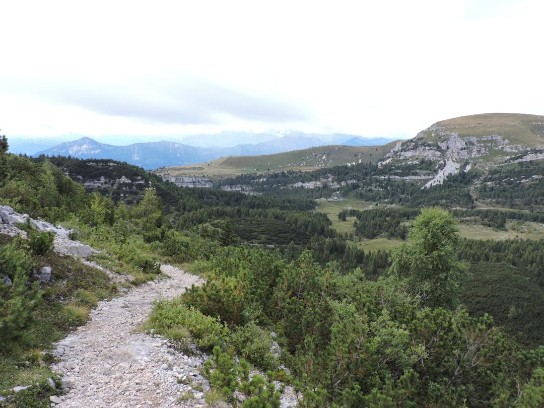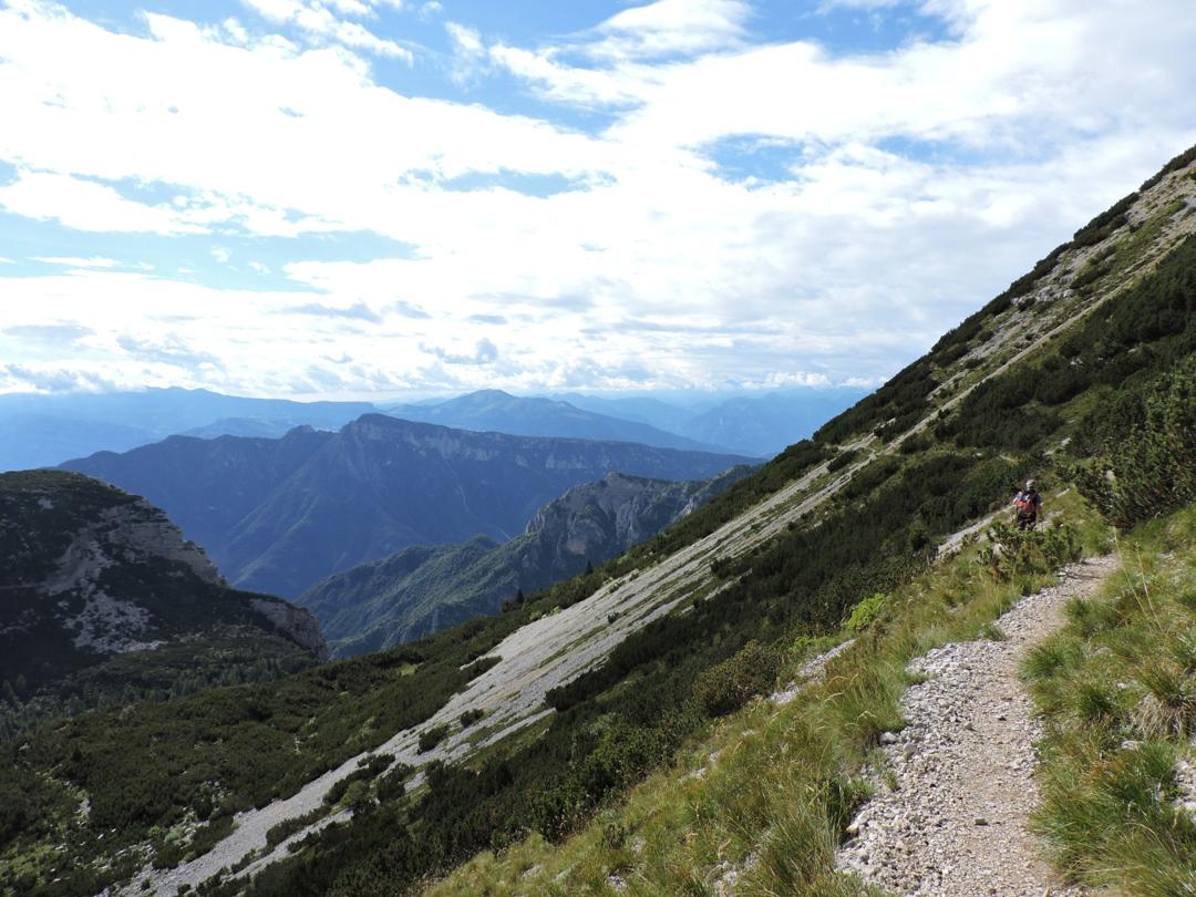 Passato il Piccolo Roite il sentiero rimane a ovest del monte Roite con alla nostra sinistra l'alpe di Cosmagnon, la Vallarsa e il Corno Battisti.