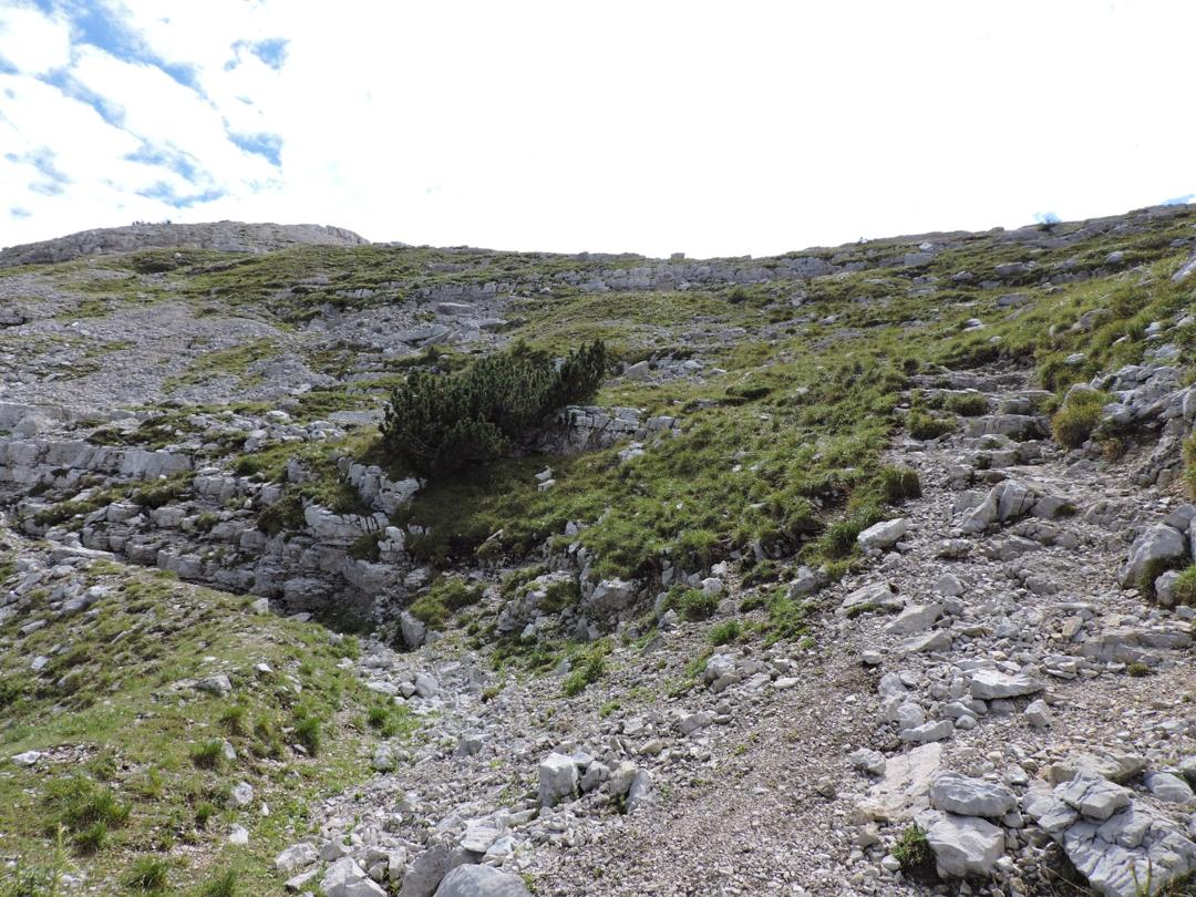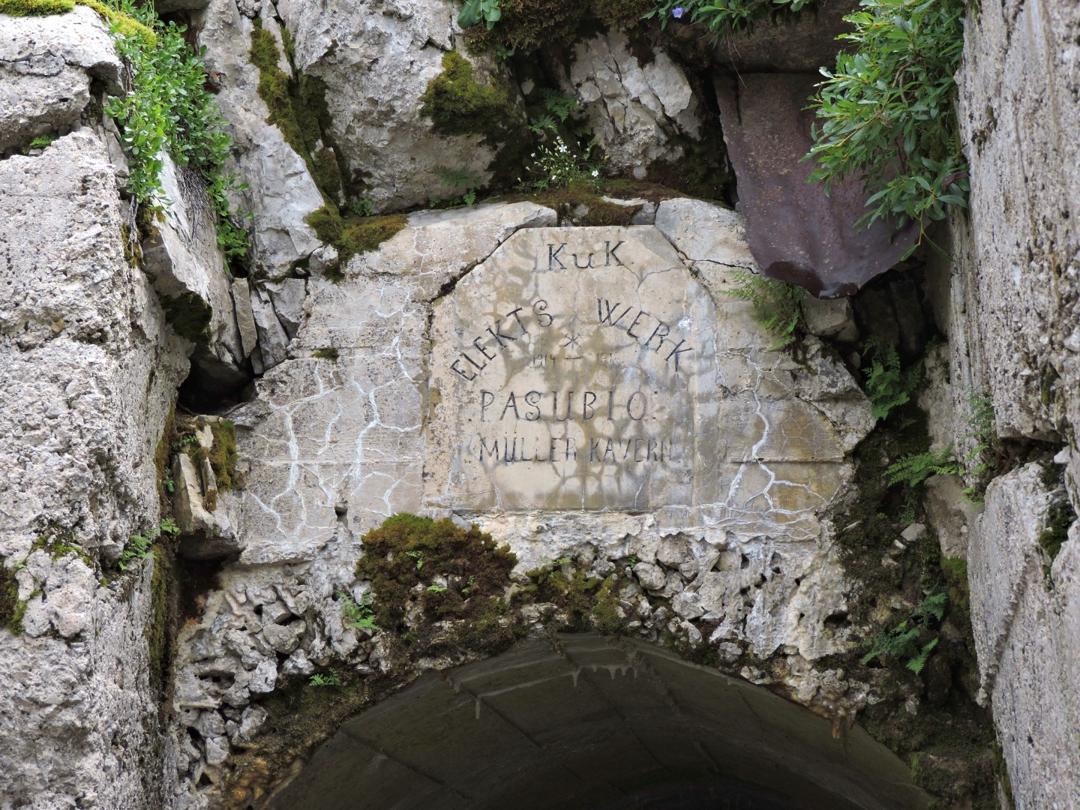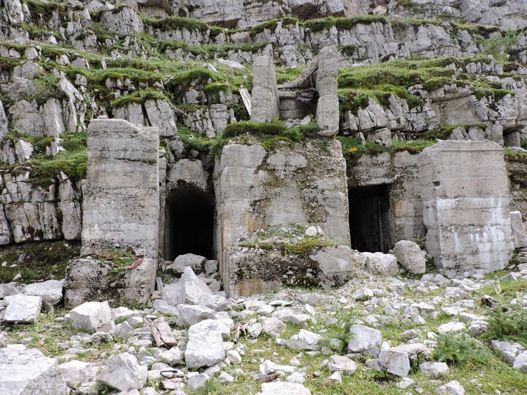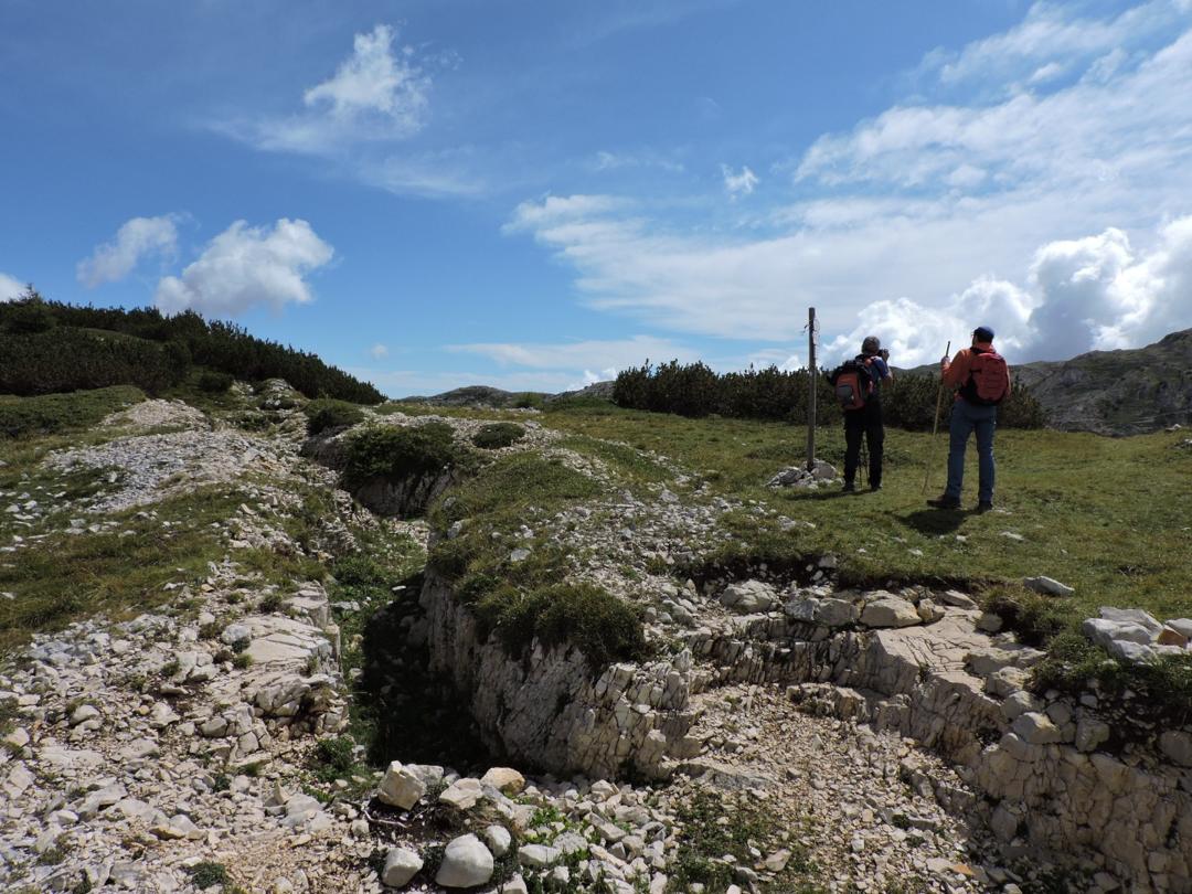 Proseguiamo a destra in salita sempre lungo il sentiero 120 che costeggia una dolina con diverse traccie di costruzioni militari e passando a fianco della centrale elettrica austro-ungarica.