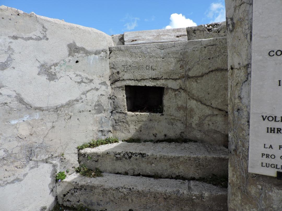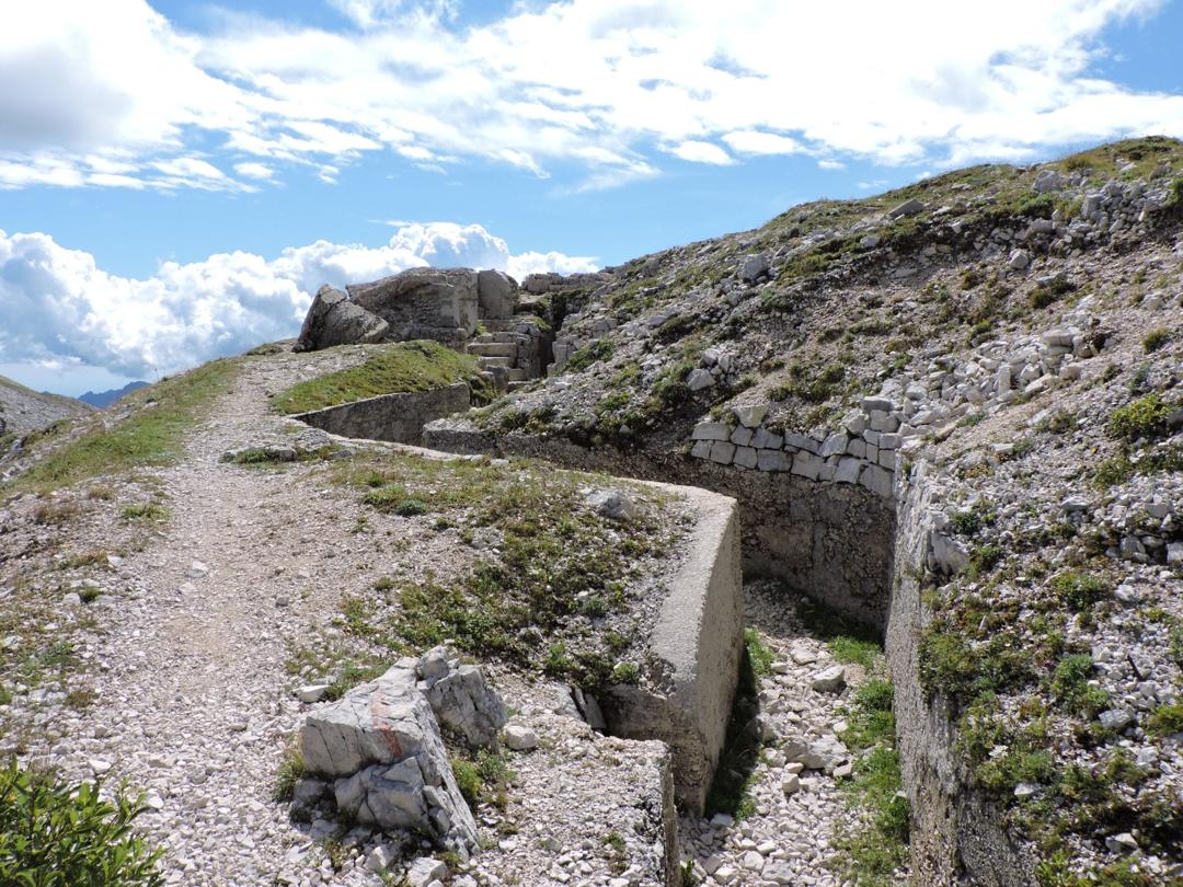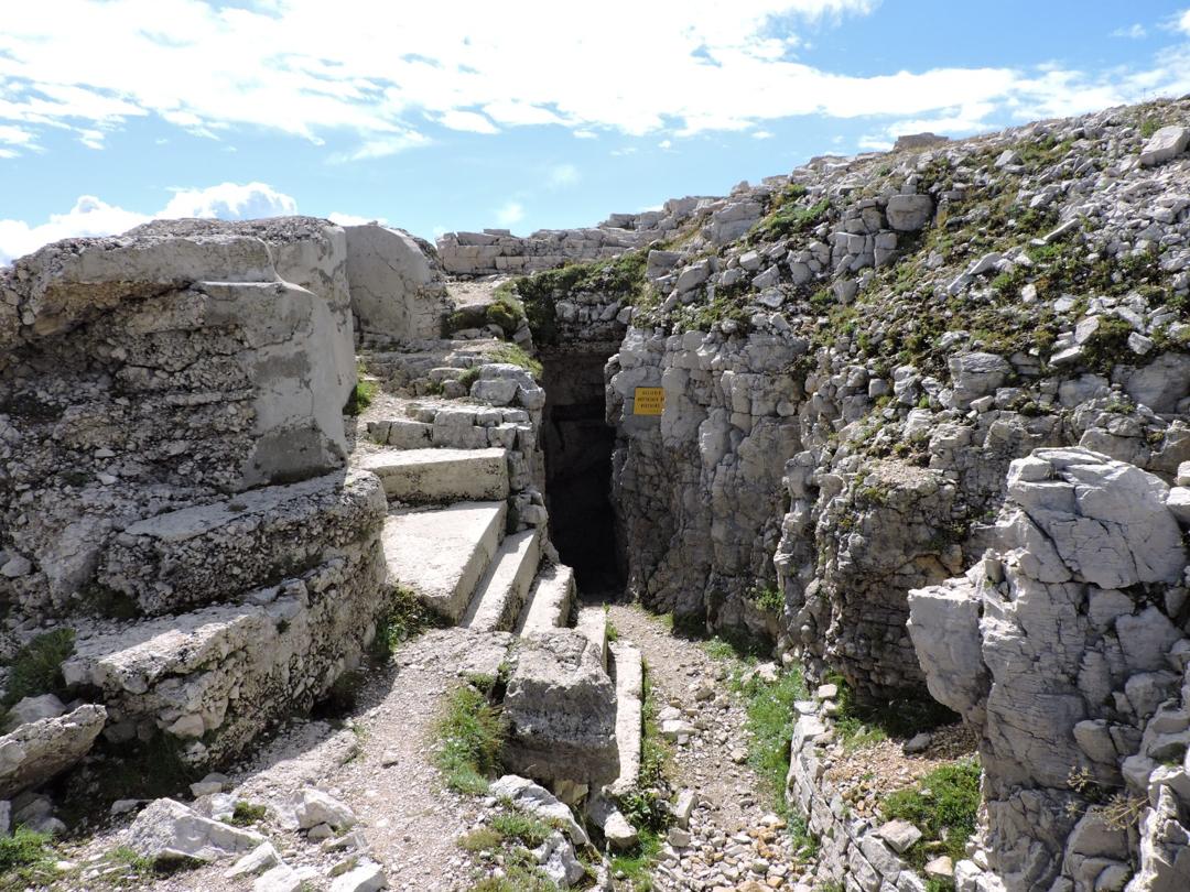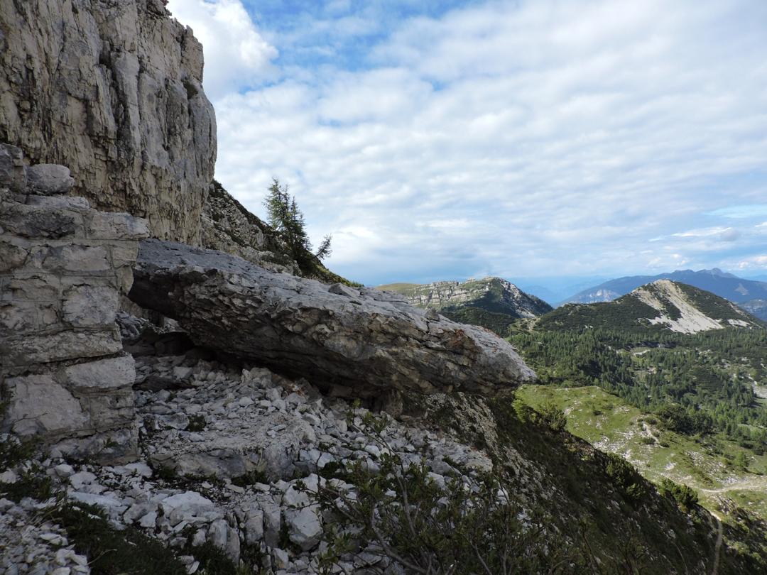 Proseguiamo a destra in salita sempre lungo il sentiero 120 che costeggia una dolina con diverse traccie di costruzioni militari e passando a fianco della centrale elettrica austro-ungarica.