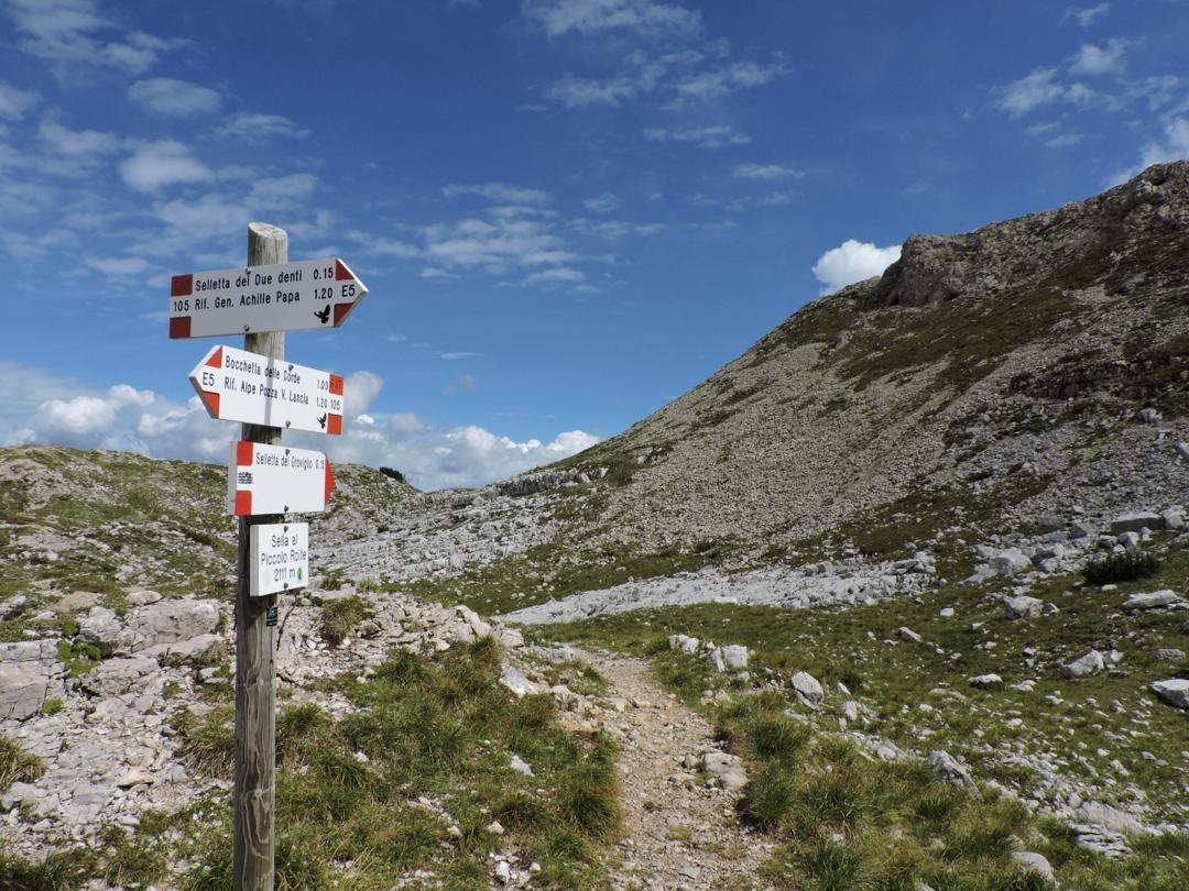 Alla sella si prende il sentiero 105 verso la Selletta dei Due Denti raggiungendo così il Dente Austrico. Sono 45 minuti dalla Sella Est dei Campiluzzi, poco meno di due ore dal rif.Lancia.