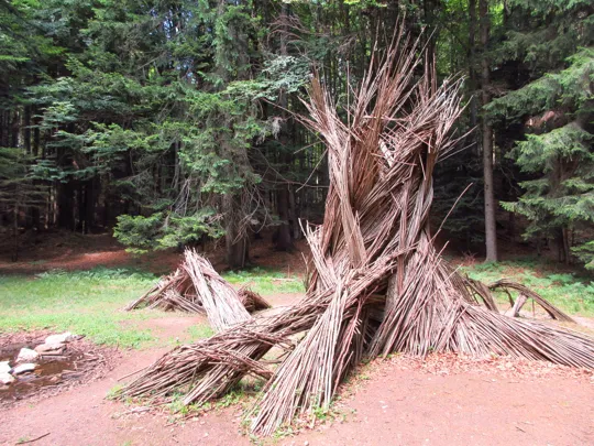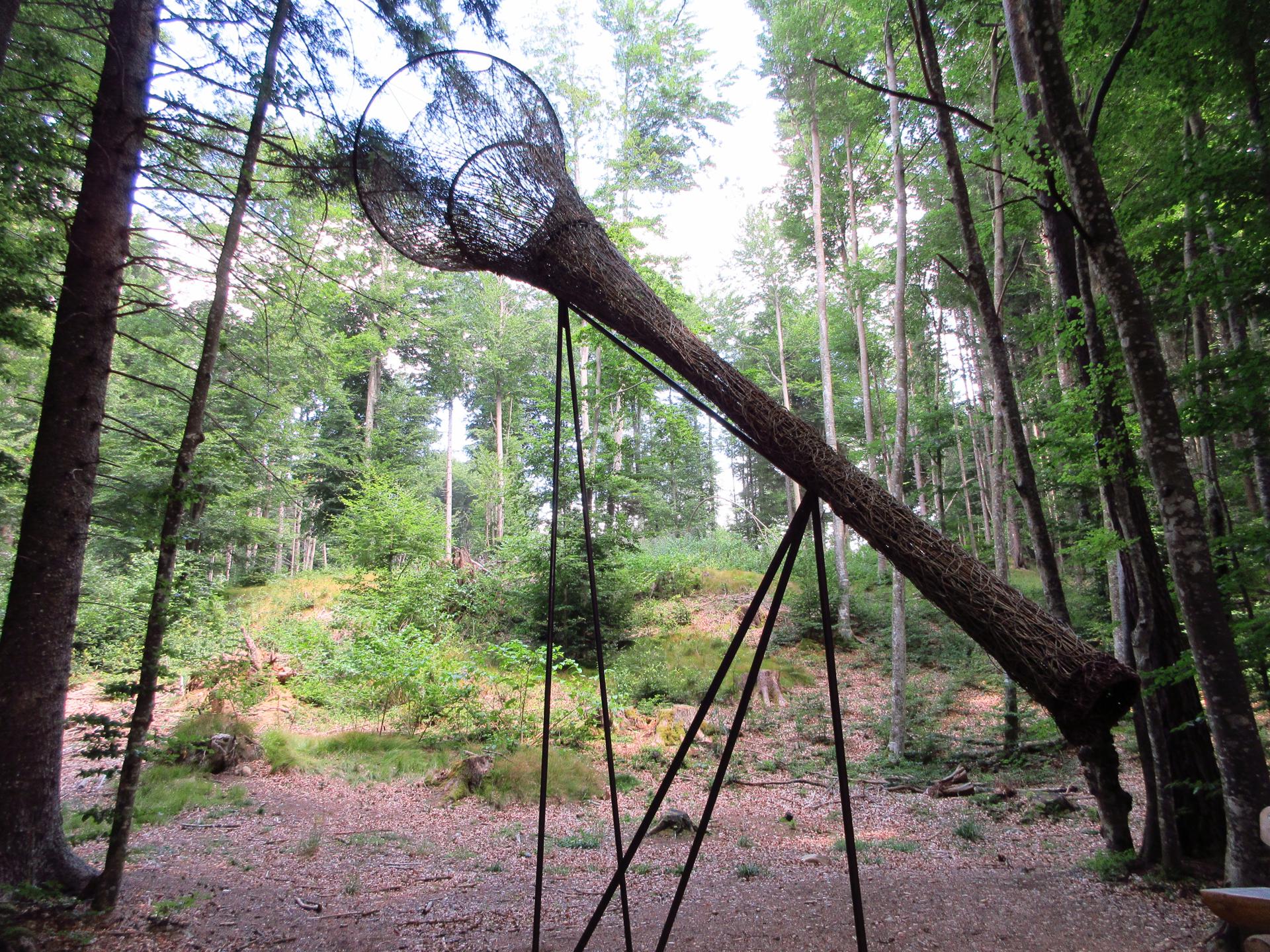 Lascia visibili alcune parti di questa e con un processo affine alla riappropriazione, alla ciclicità naturale, costruisce la nuova scultura intrecciando i rami di nocciolo con una sintesi plastica ed espressiva molto connotata.