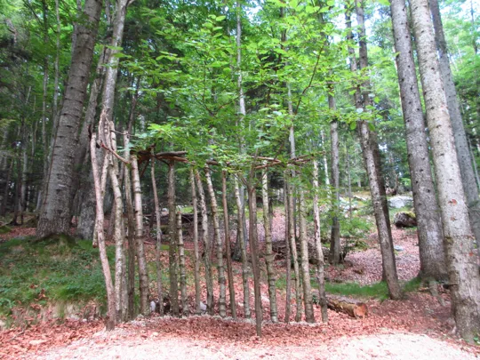 Di color grigio, dotato di otto zampe, Slepinir, nella mitologia scandinava, è considerato il migliore cavallo che esista, il più veloce; in grado di cavalcare il cielo e le acque. Il suo nome significa "colui che scivola rapidamente". Slepinir è diviso tra due mondi: la montagna ordinata dall'uomo e il bosco, luogo della natura misteriosa e simbolo dello smarrimento in cui tutto può succedere. L'opera, come un portale, guida così il visitatore all'interno della selva, dove le opere degli artisti scandiscono un viaggio di riflessione che diventa il motore dell'immaginazione.