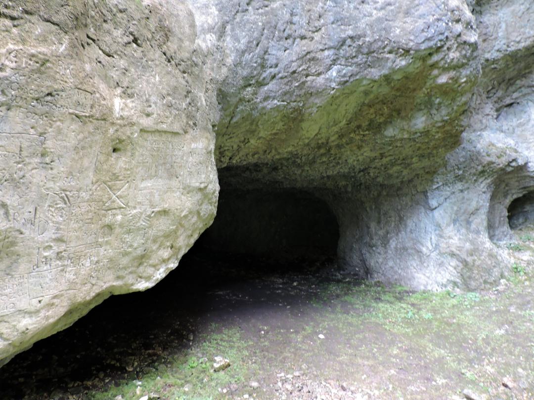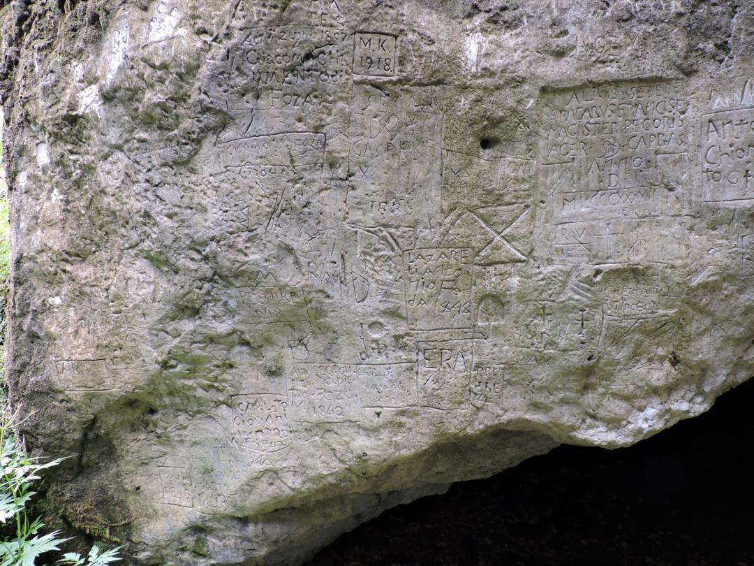 A circa 100 metri da Riparo Dalmeri, lungo la forra del torrente Ombra, ci sono numerose cavità naturali visibili nella roccia, create dall'acqua di scioglimento del ghiacciaio decine di migliaia di anni fa. Particolari sono tre grottine naturali, una singola più ampia e profonda, con accanto le altre due sovrapposte. All'ingresso della principale spicca una liscia parete calcarea verticale, completamente tappezzata da incisioni. Sono iscrizioni con date degli ultimi secoli, legate a particolari vicende storiche locali ed agli eventi bellici della prima guerra mondiale. Tra queste si notano anche simboli "cruciformi", alcune rappresentazioni figurative, medievali o più recenti. Sono appena visibili altri segni lineari che potrebbero appartenere alla preistoria.