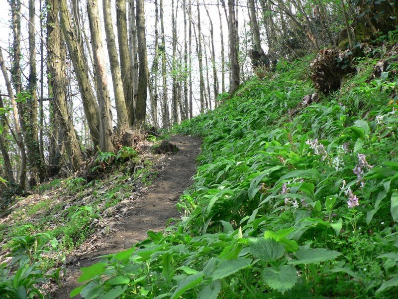 Il sentiero sotto alle rocce si percorre in un tratto boschivo ricco di vegetazione.