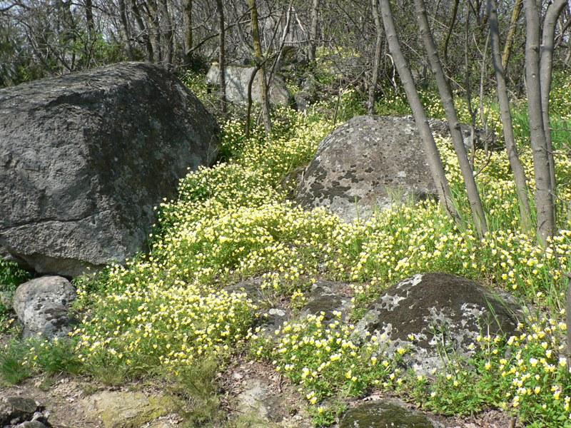 Nel bosco fresco a Nord-Est dello sperone roccioso sono presenti il Bossolo e il Fior d'angelo e, tra le specie erbacee, la Dentaria a cinque foglie, le Stellina gialla, l'Erba moscatellina, l'Aquilegia e il Gigaro scuro.