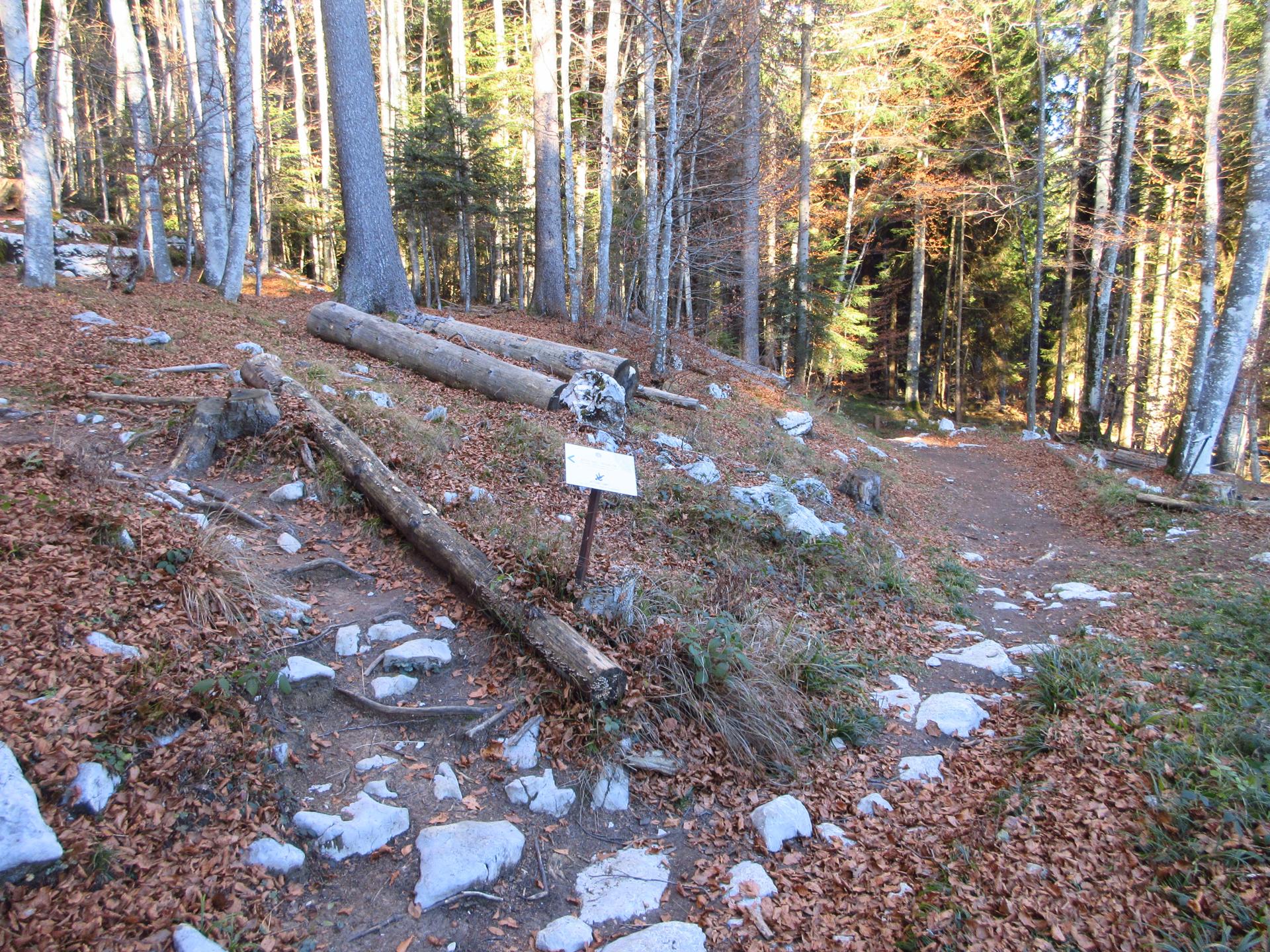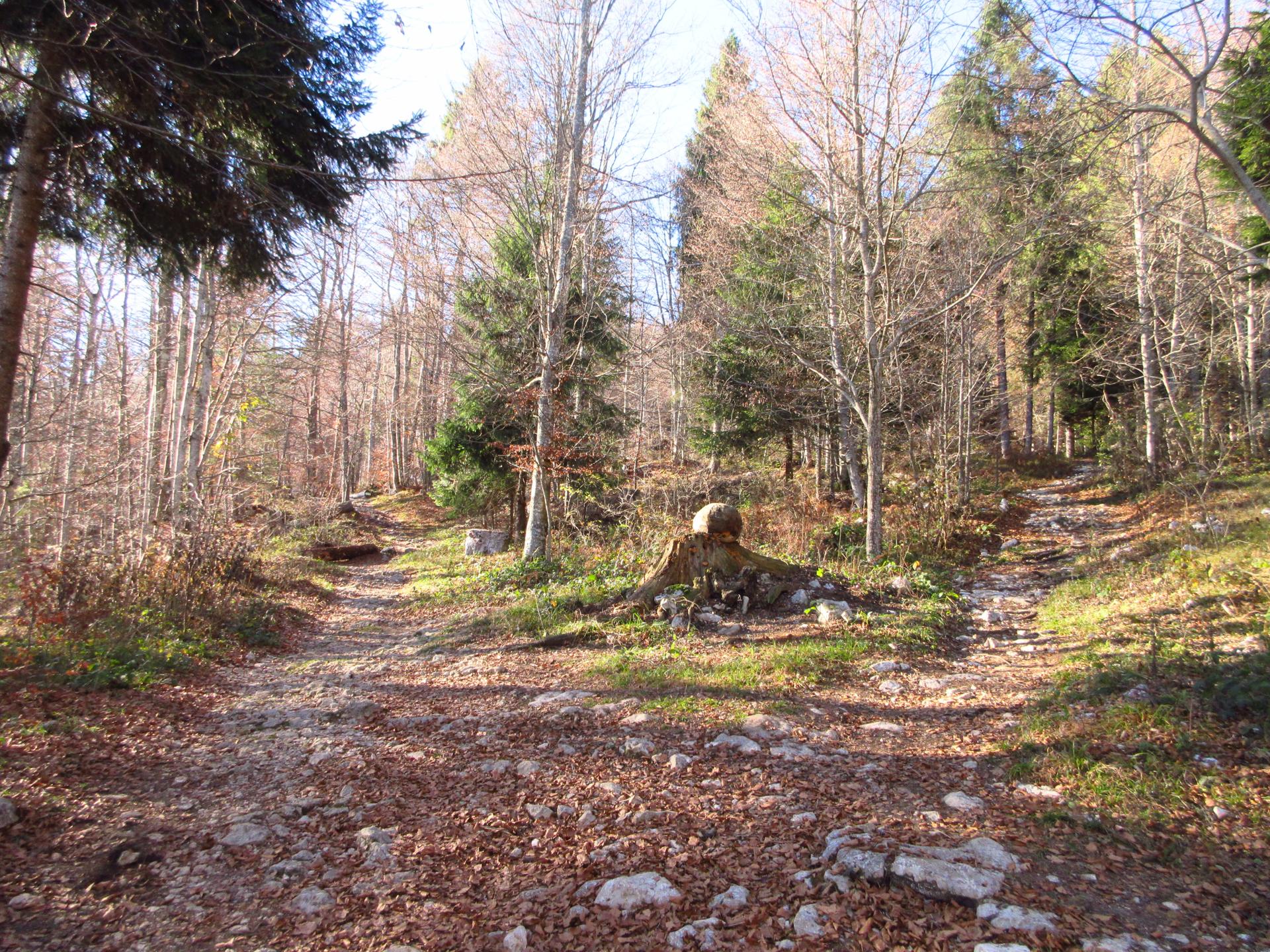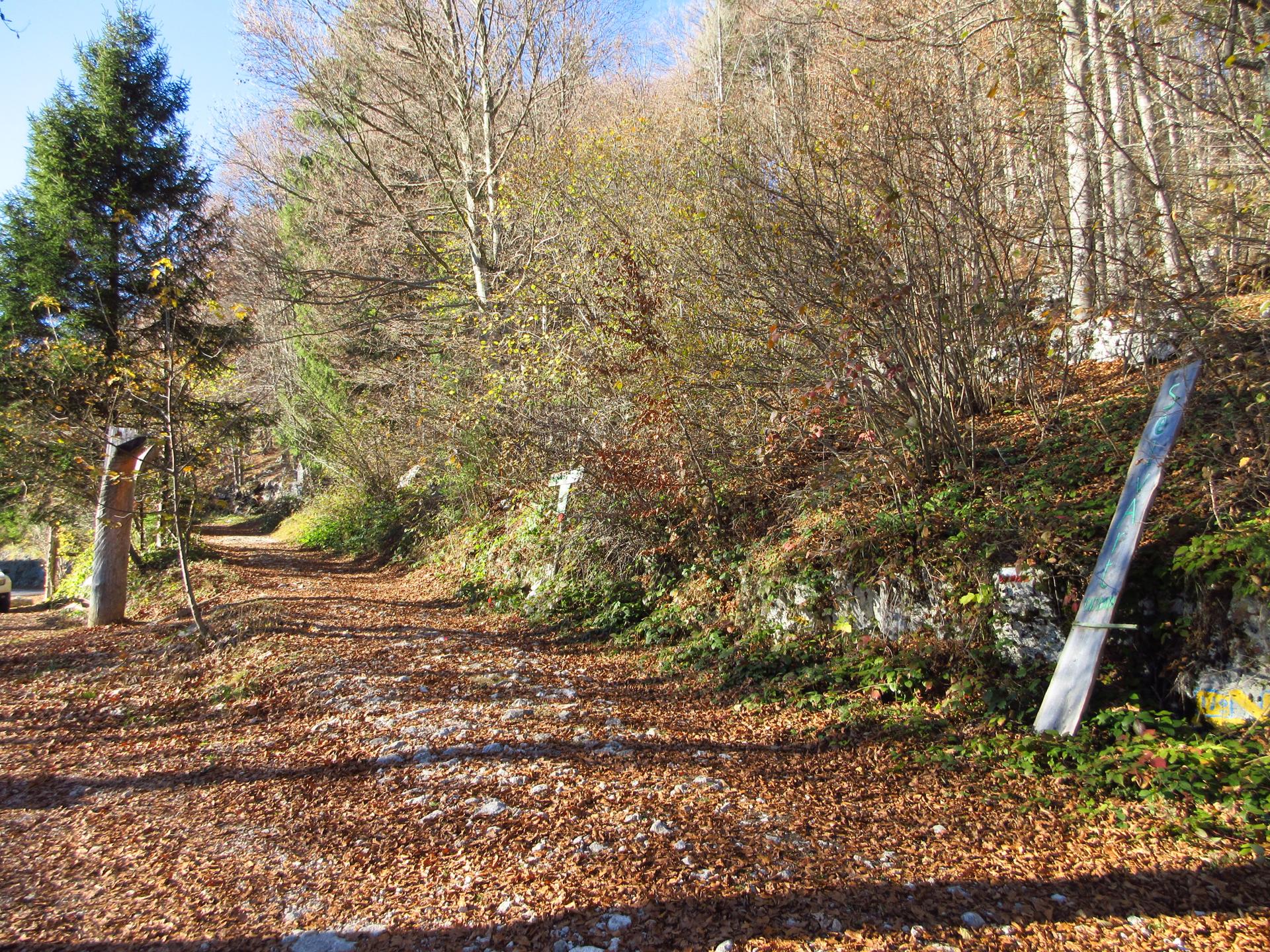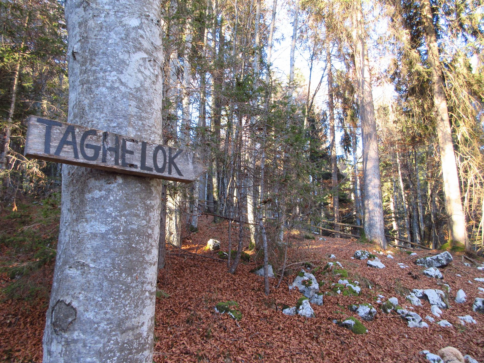 Si continua il sentiero in discesa nel bosco fino a trovare una tabella che indica a sinistra per il Buso del Taghelok.