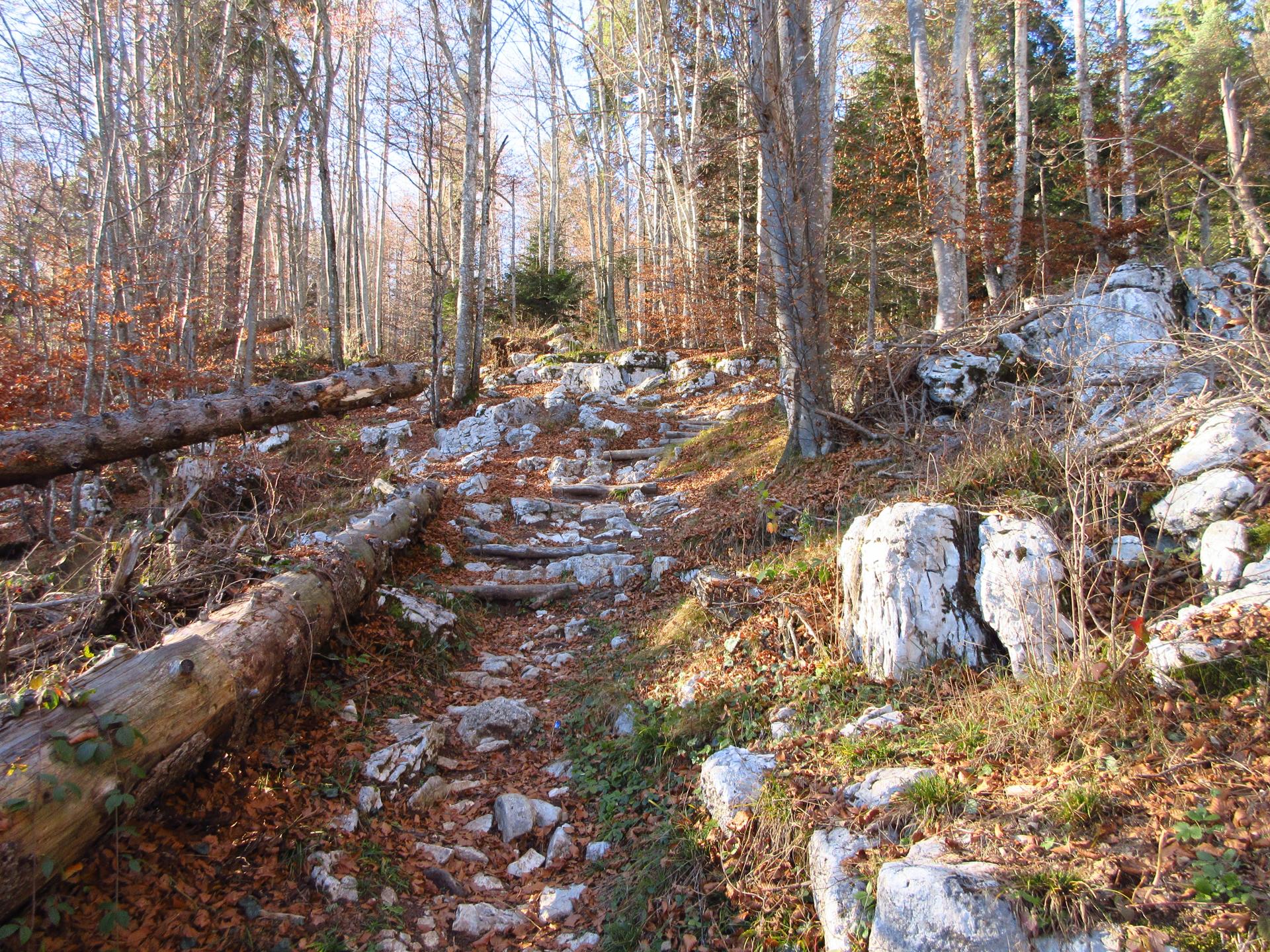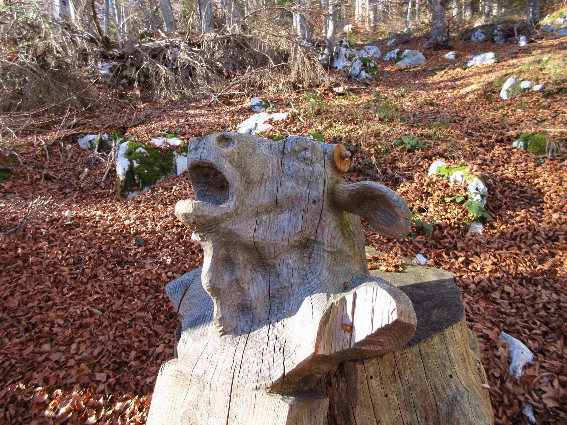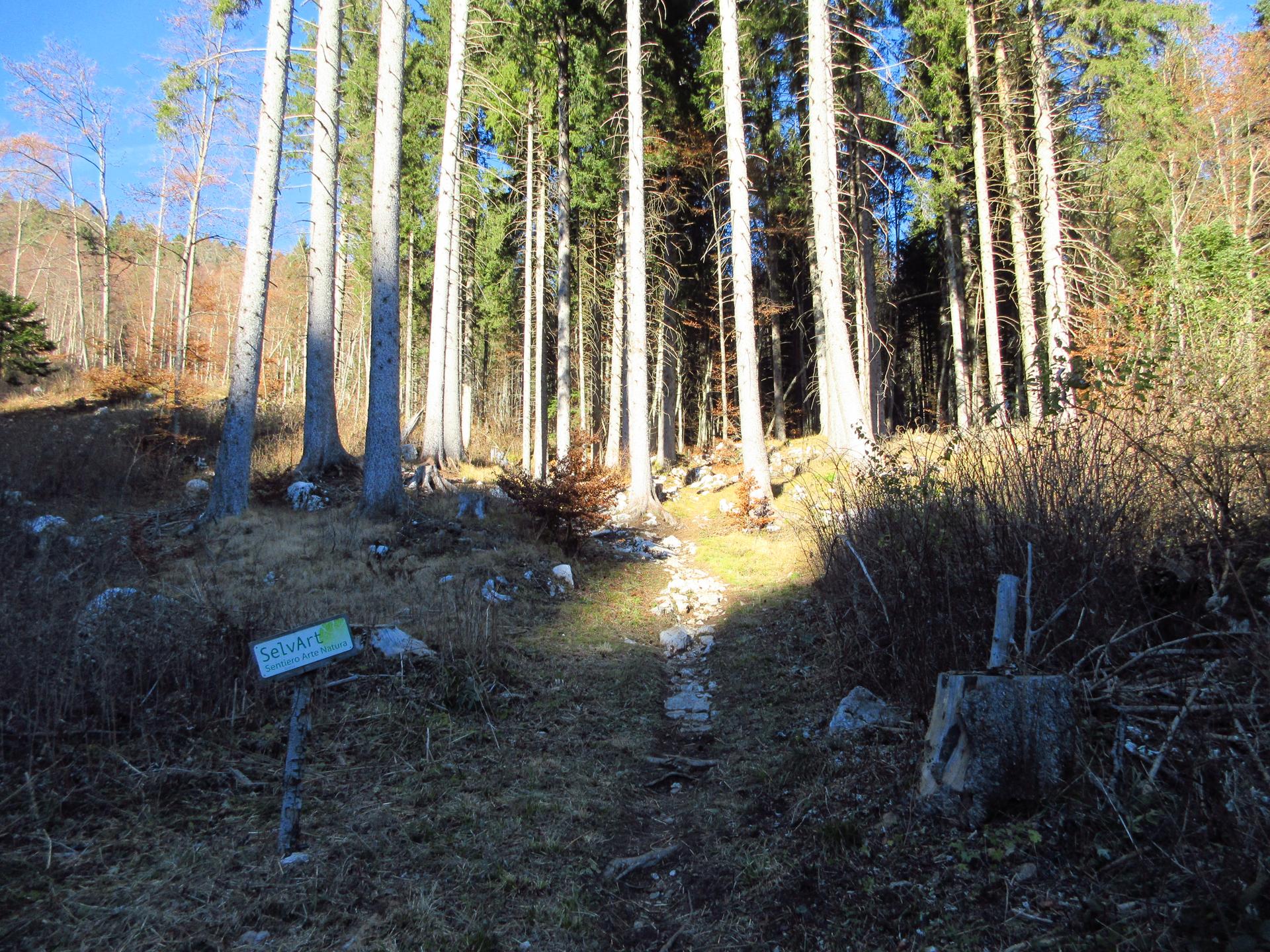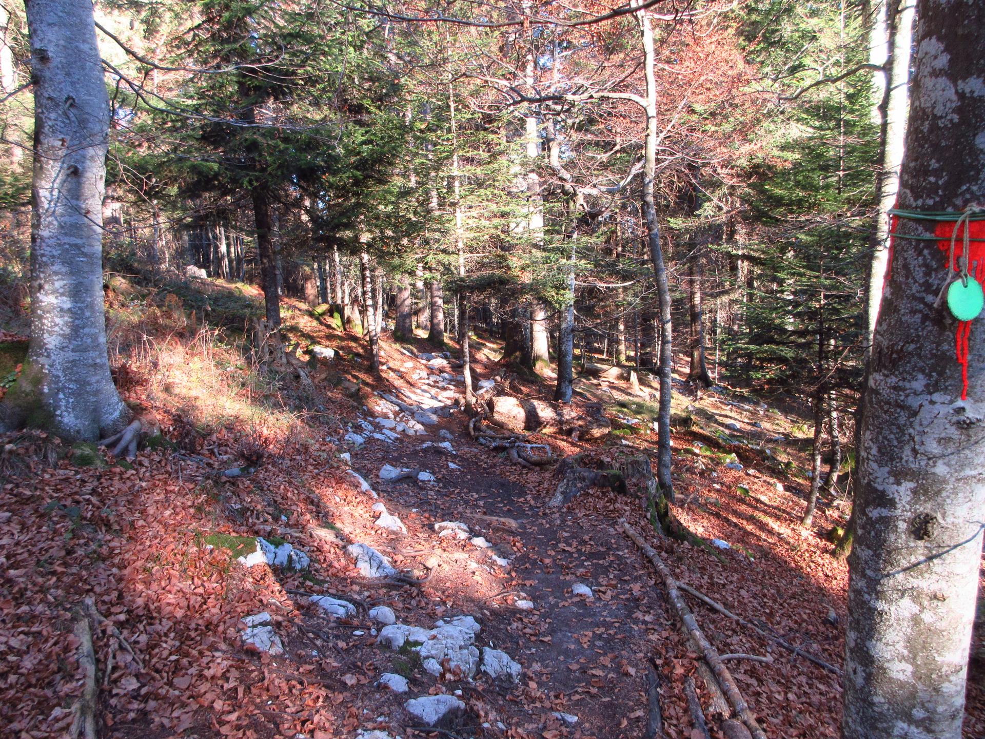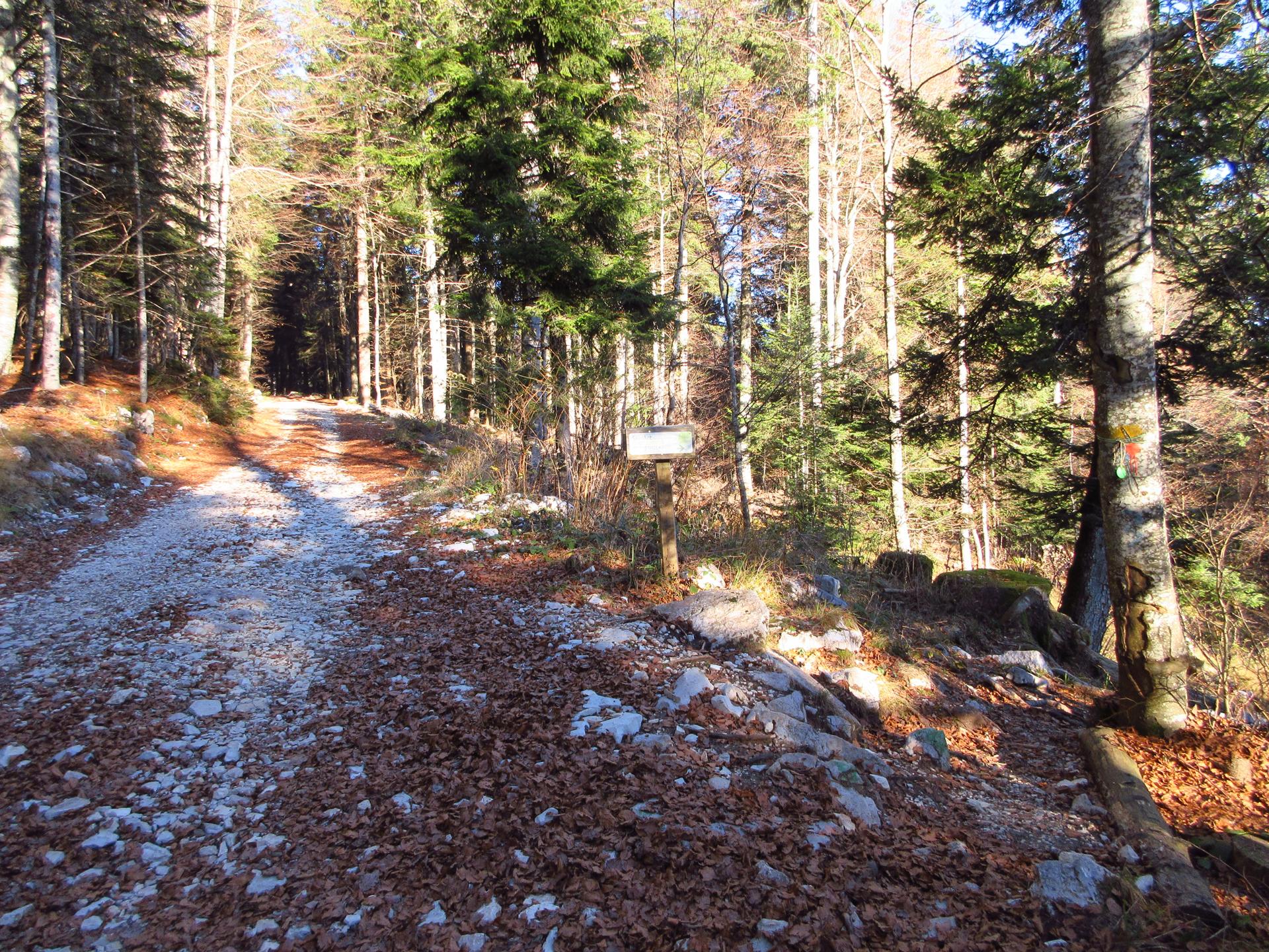 Si continua il sentiero in discesa nel bosco fino a trovare una tabella che indica a sinistra per il Buso del Taghelok.