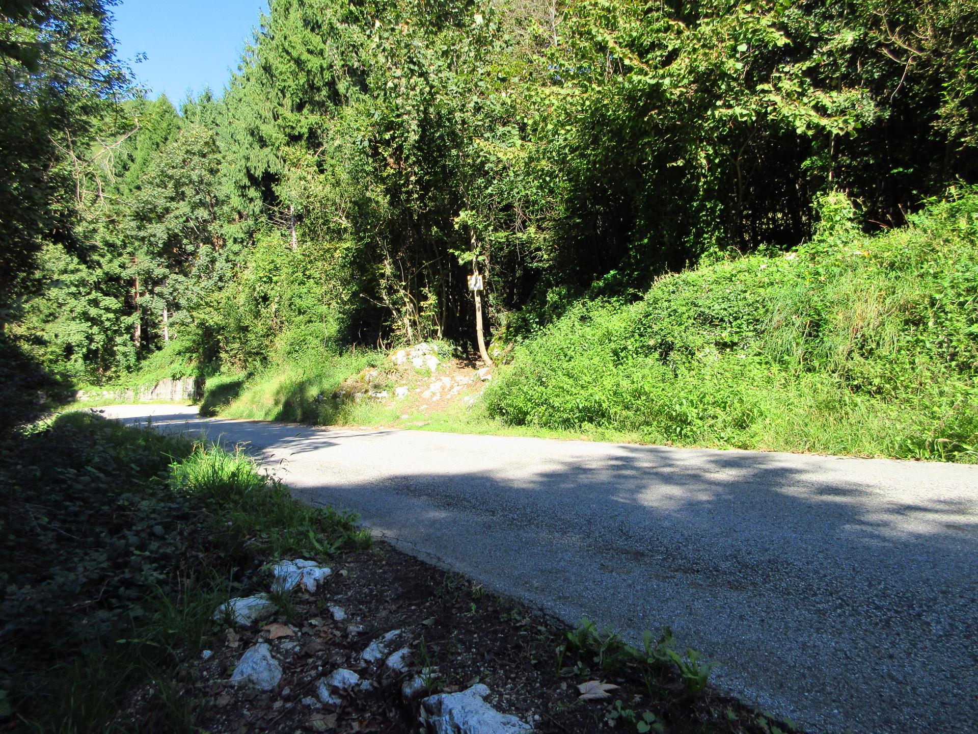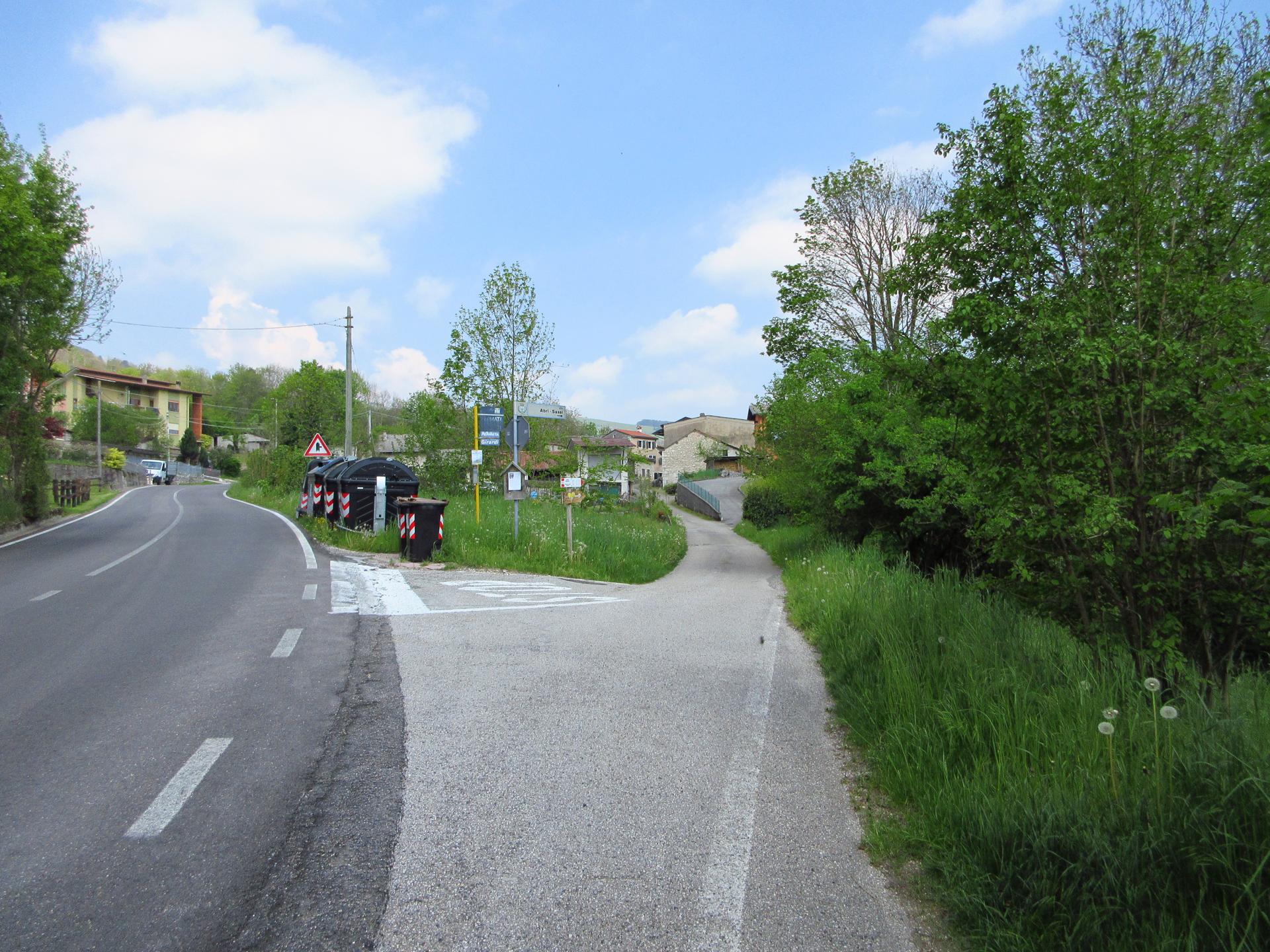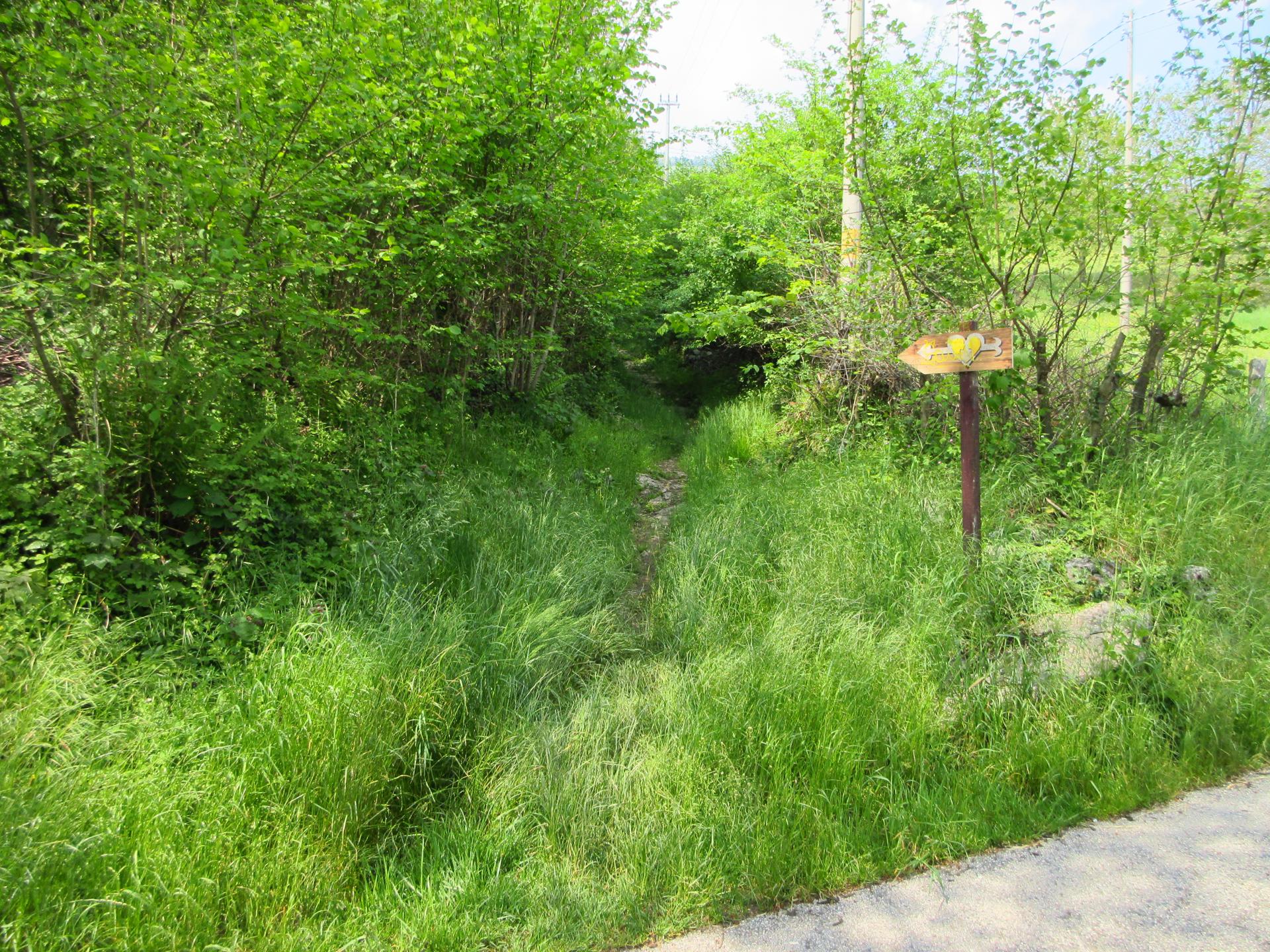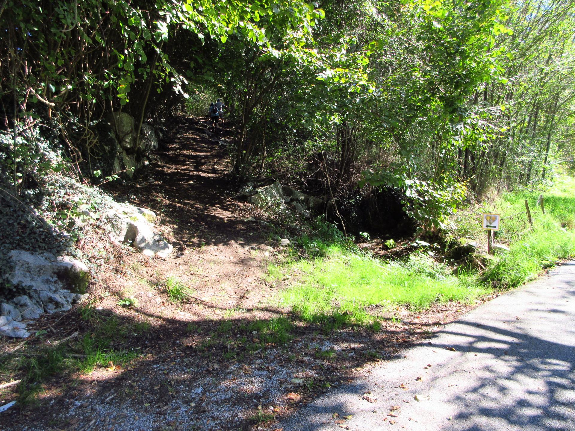 La mulattiera termina su una strada; si attraversa e si prosegue imboccando subito un’altra mulattiera che inizia proprio di fronte.