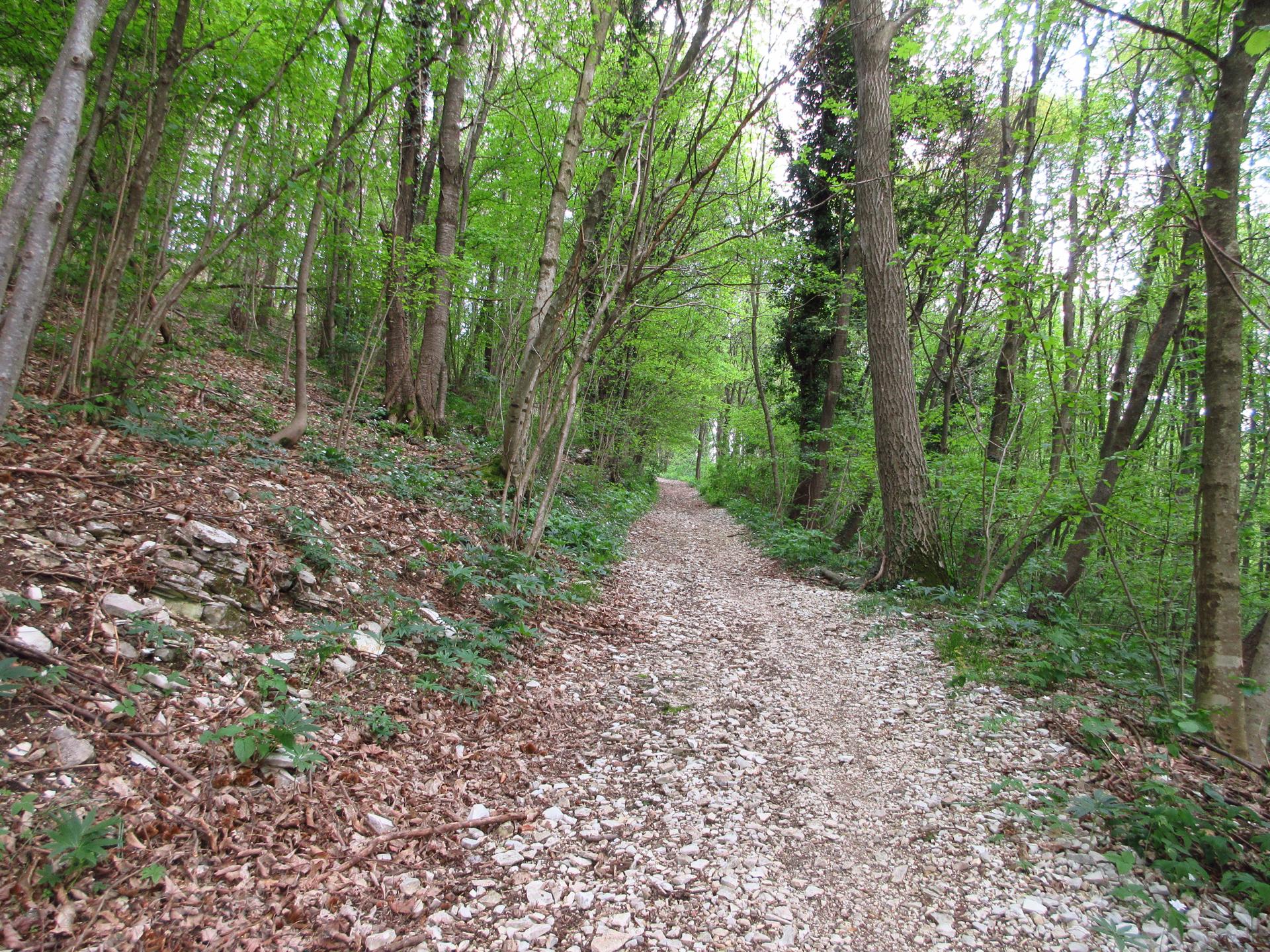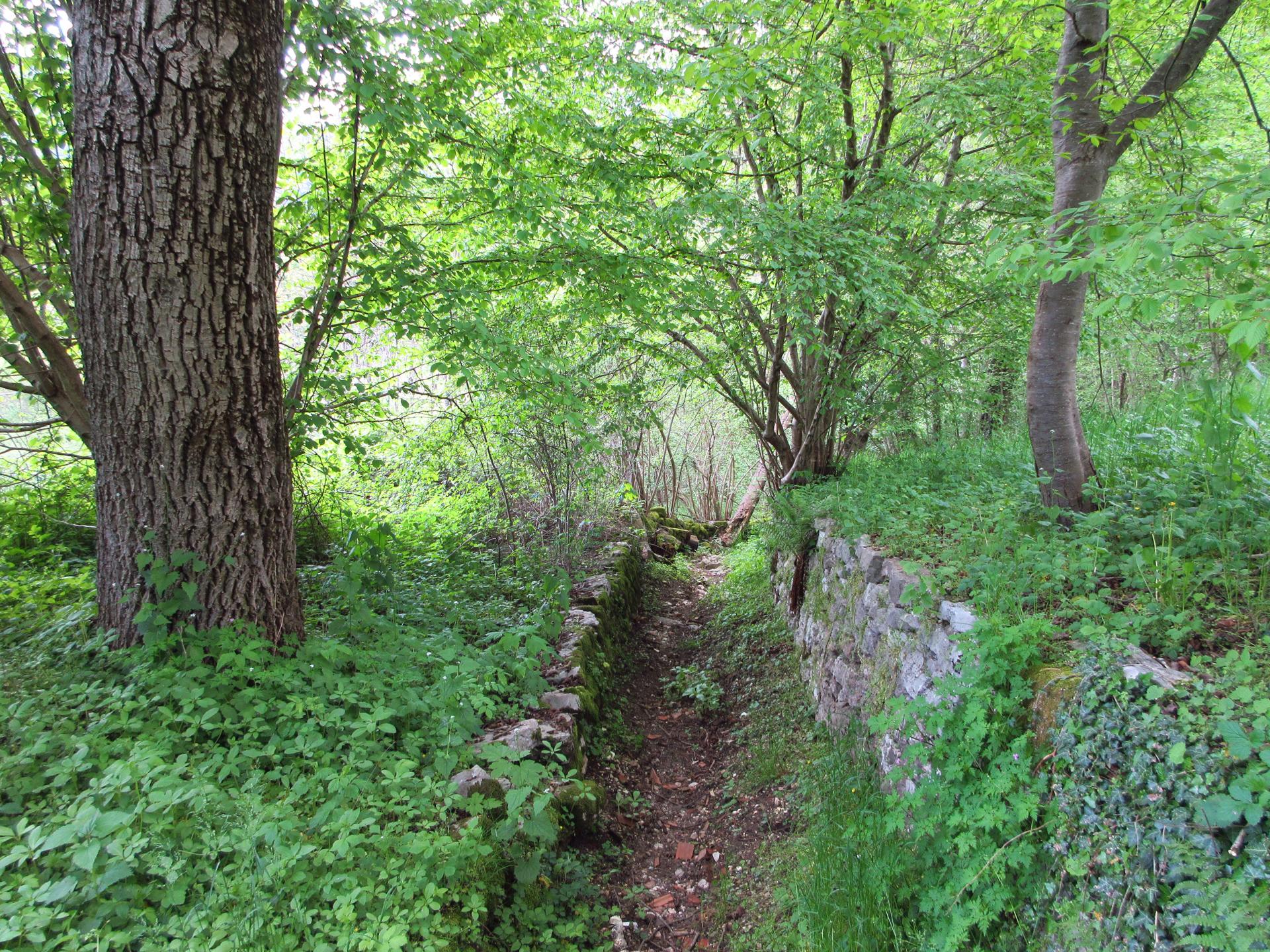 Superato il trono di pietra e l’ennesimo attraversamento stradale, la mulattiera sale verso contrà Marotte per poi ridiscendere e terminare sulla strada di contrà Conte.