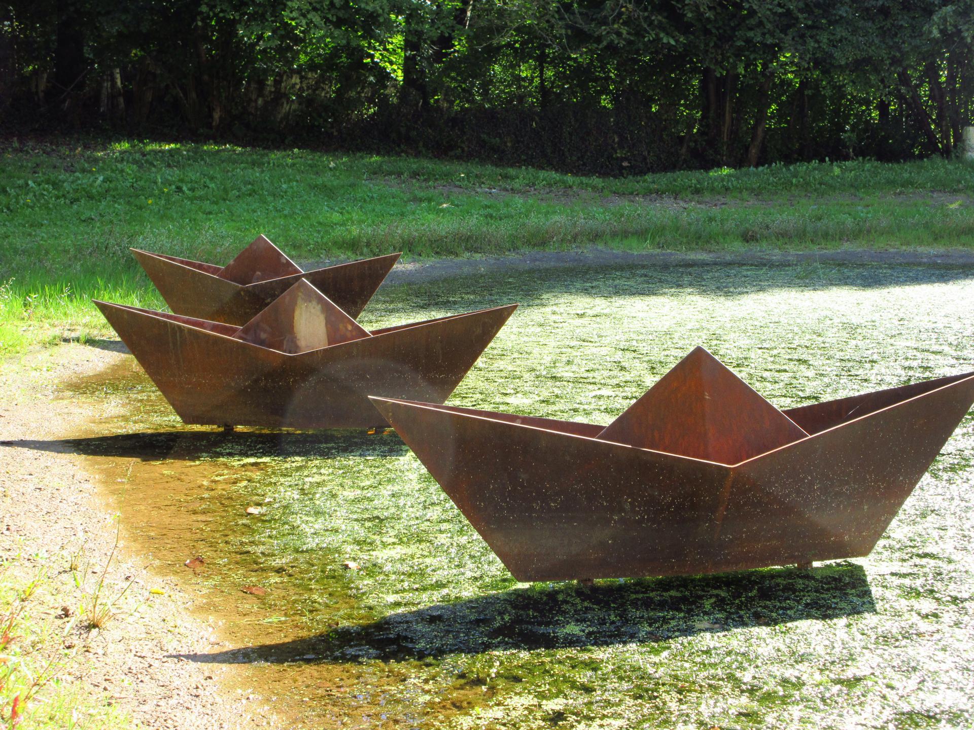 Questa installazione, composta da tre barchette in acciaio corten, richiama la forma delle barchette di carta che tutti noi abbiamo costruito durante l'infanzia. Il corten, con il suo aspetto vissuto e resistente, rappresenta la forza e la durabilità dei ricordi, contrastando con la delicatezza e la fugacità della carta.