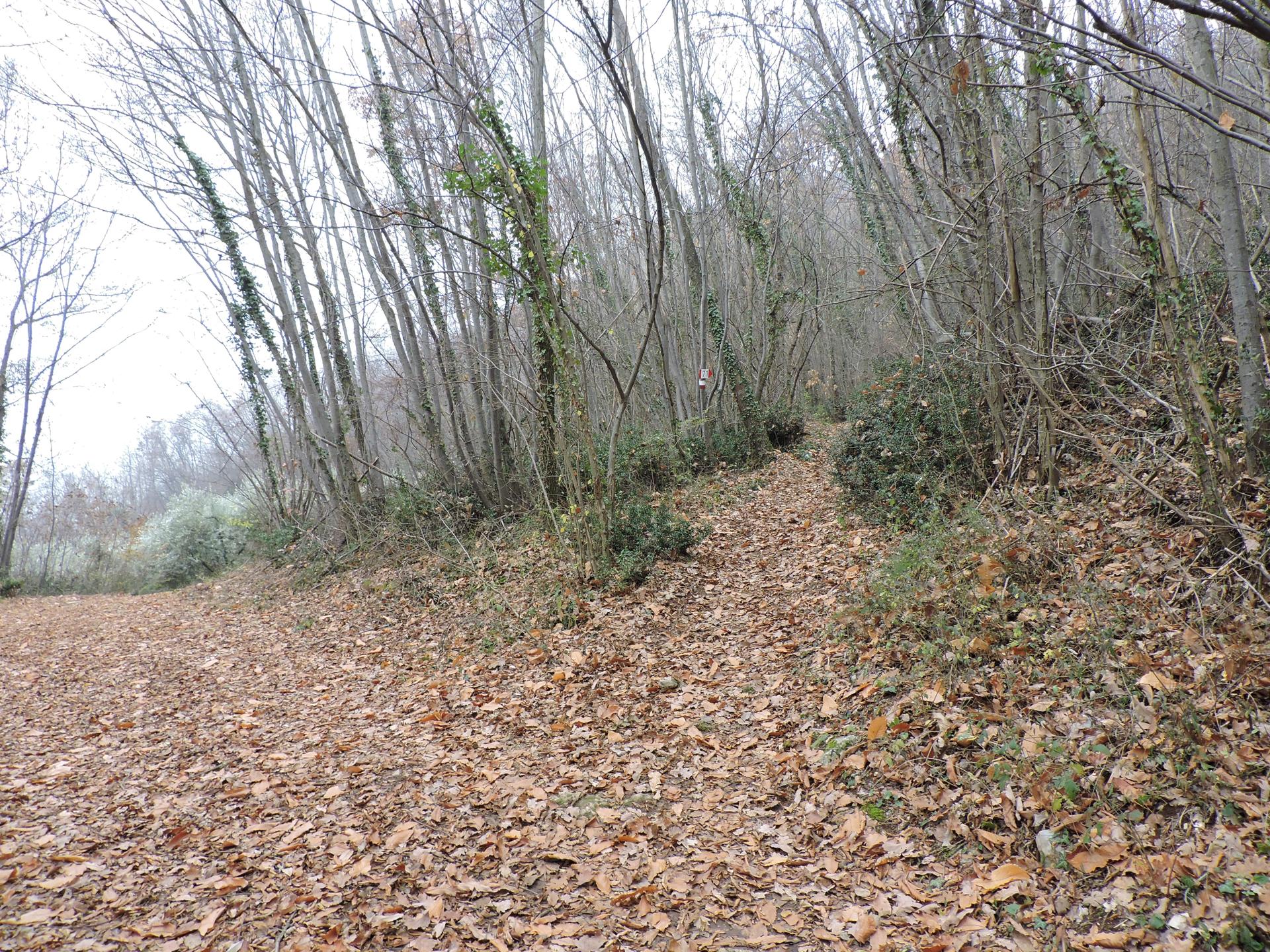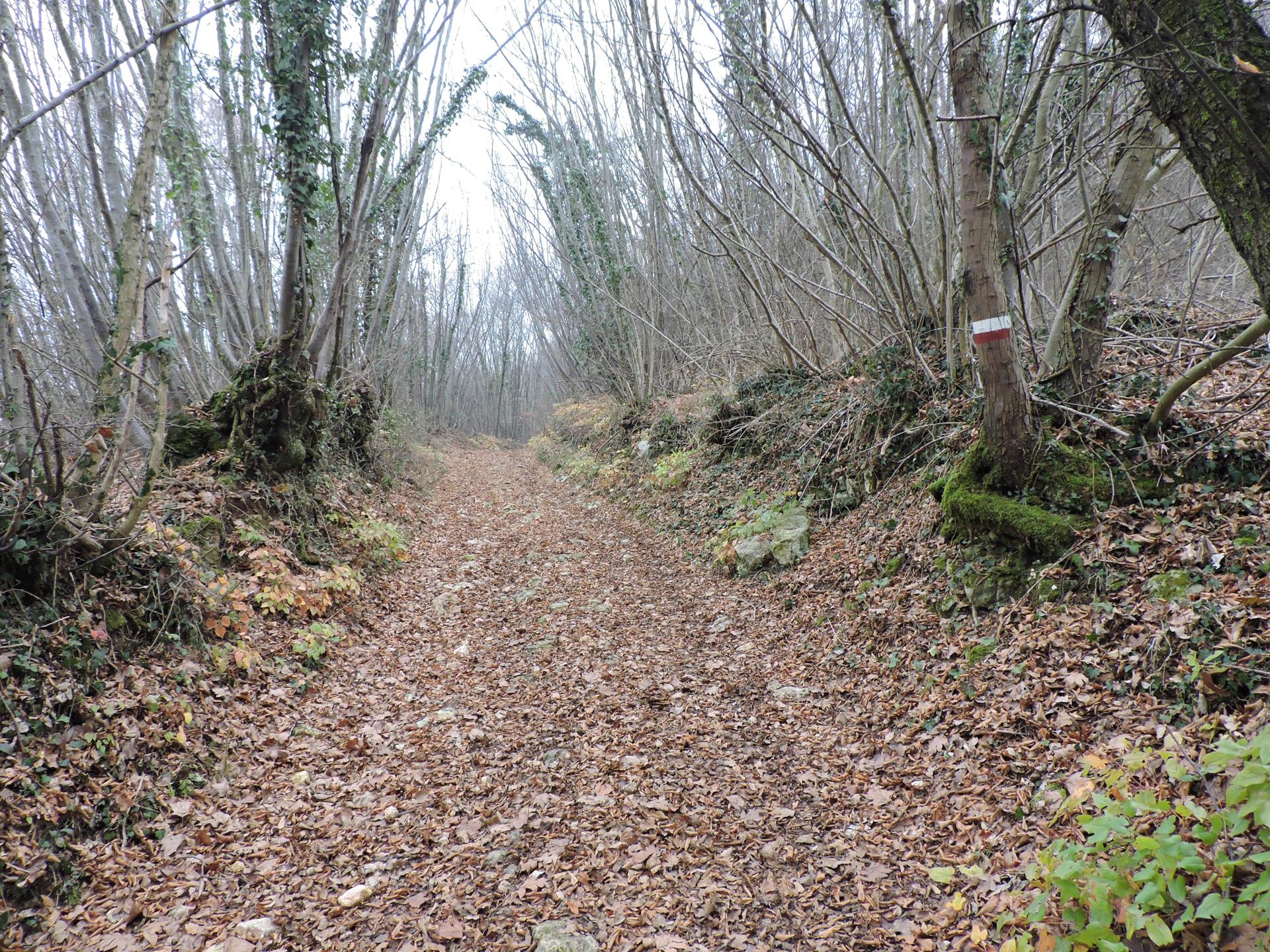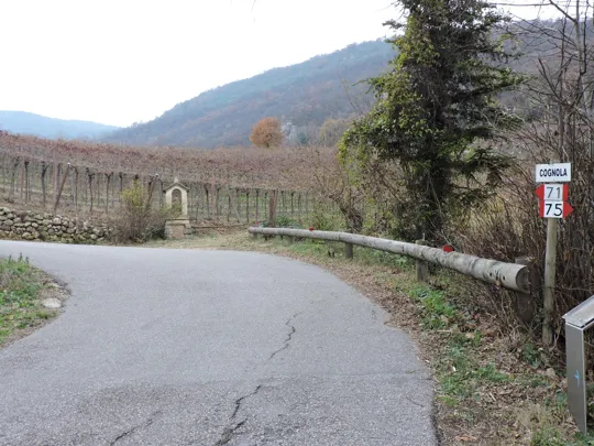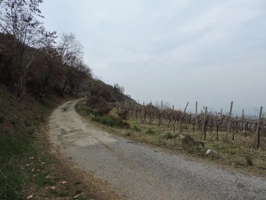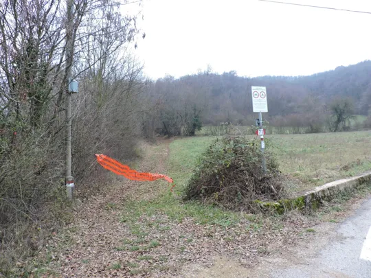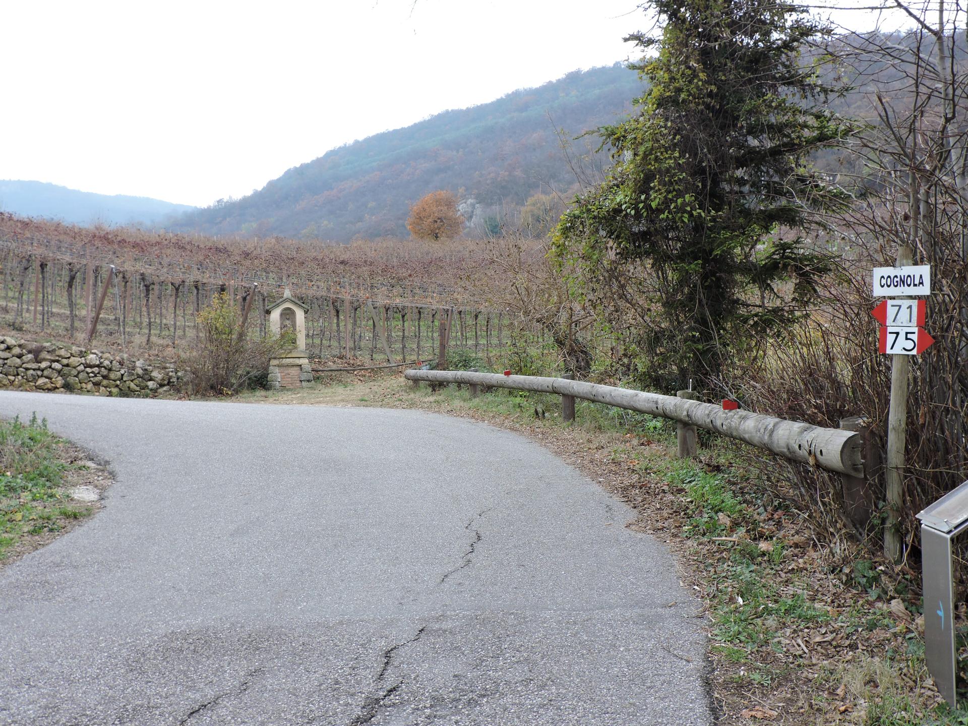 Dopo circa 300 metri, superato il capitello, quando la strada svolta leggermente a destra, si riprende il sentiero che ne esce a sinistra.