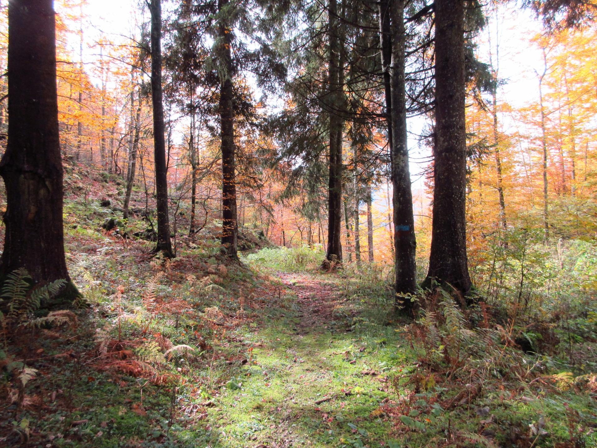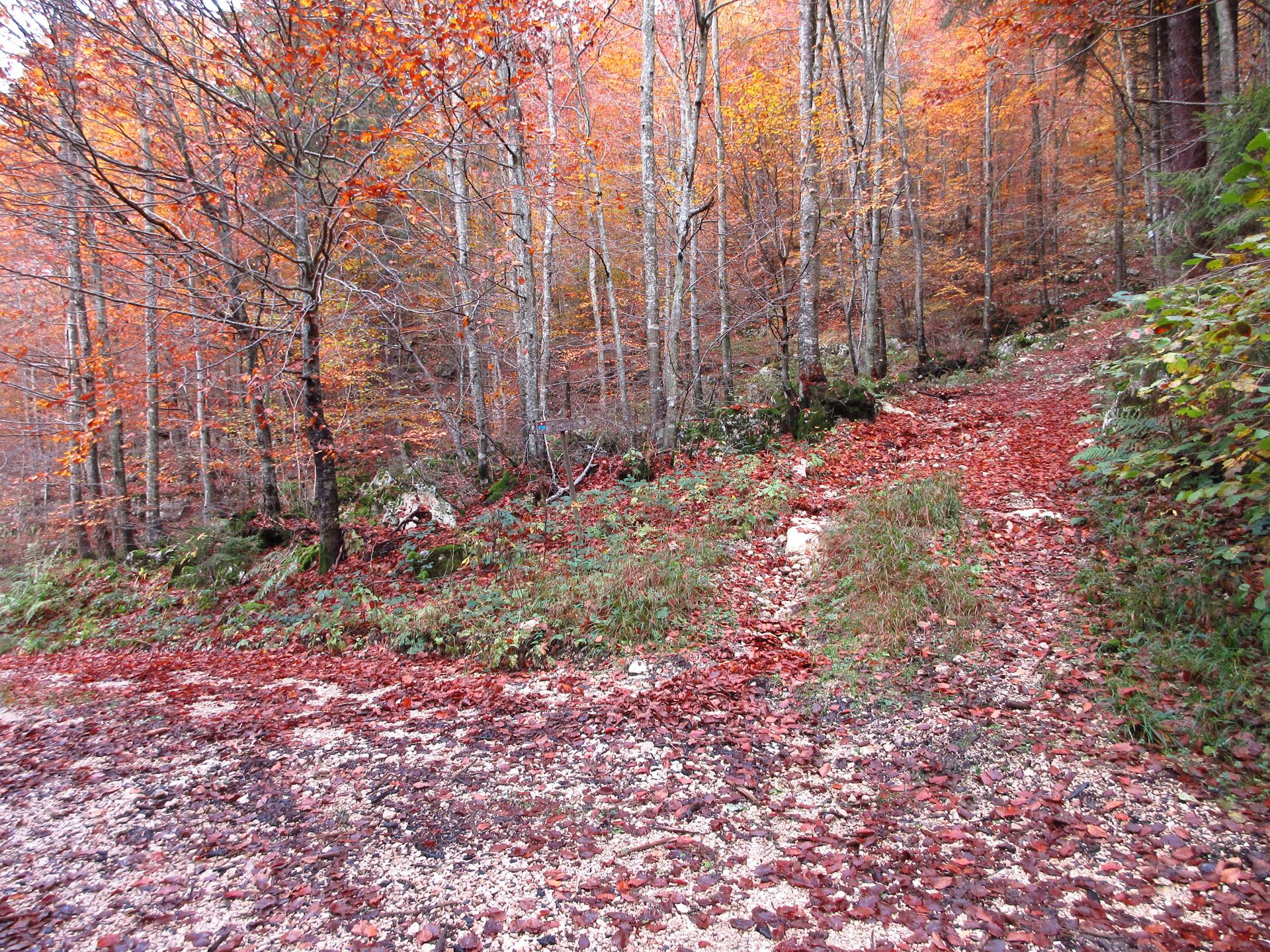 Dopo 150 metri si lascia la strada forestale per salire a destra verso nord-est su un sentiero ripido ma breve che porta a Forcella Silvagno.
