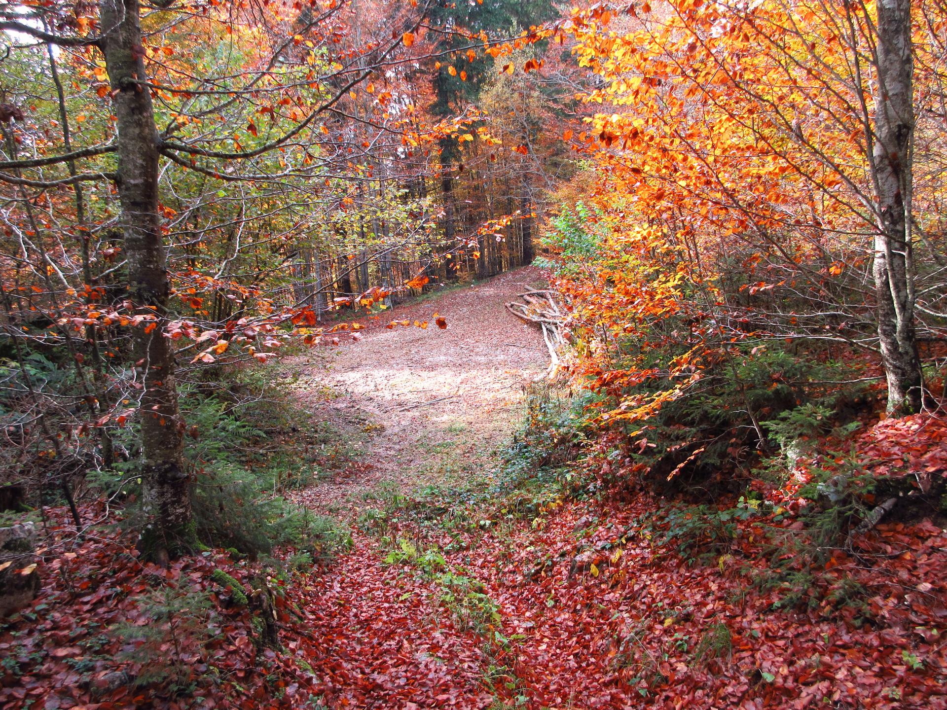 Dalla voragine il sentiero incrocia subito una strada forestale. Si prosegue a sinistra verso sud.